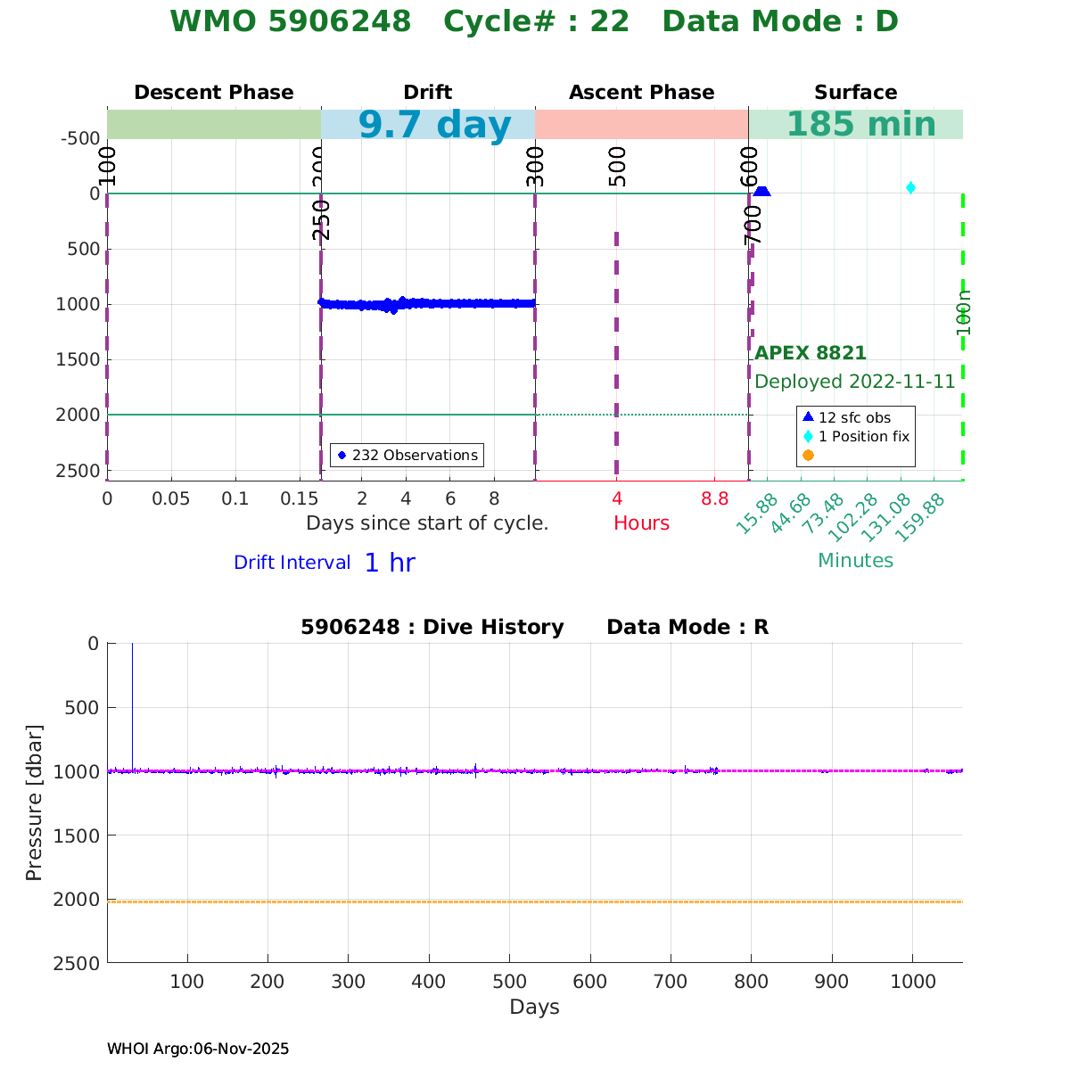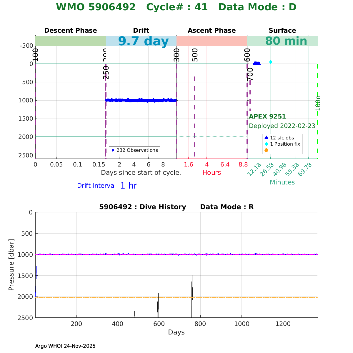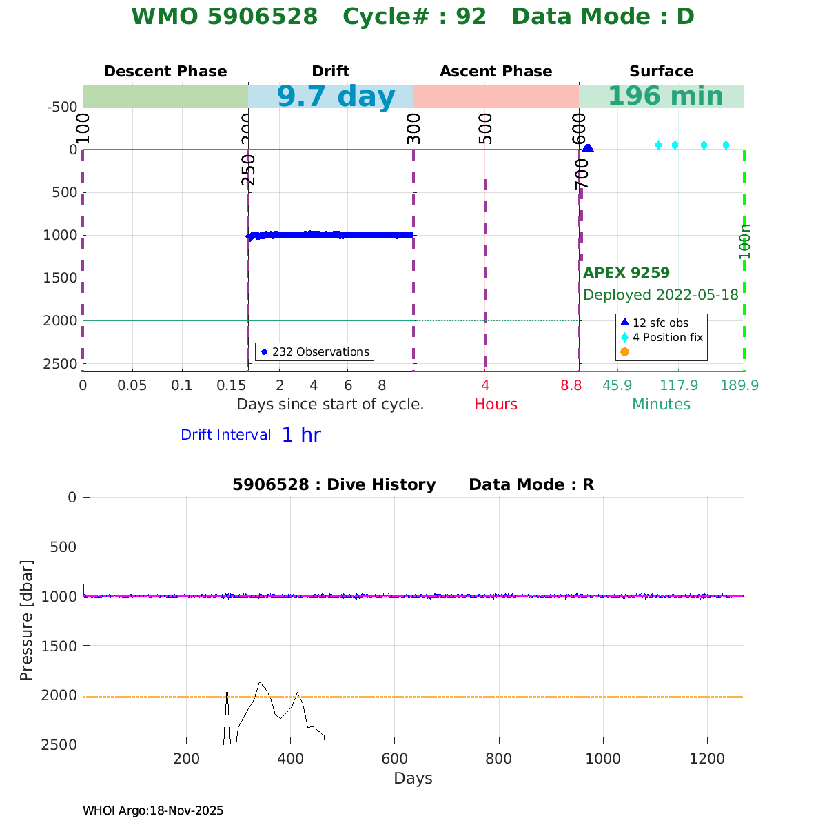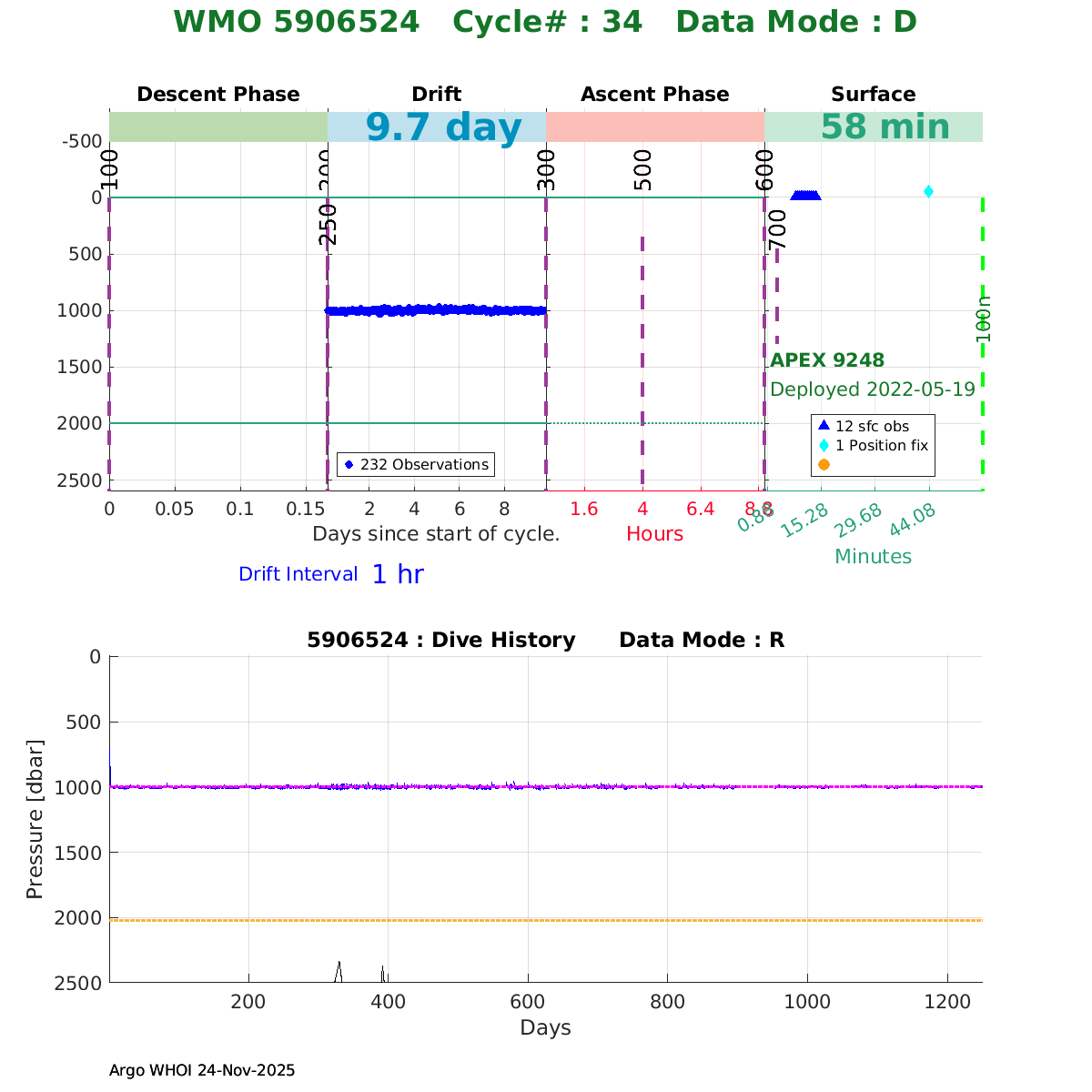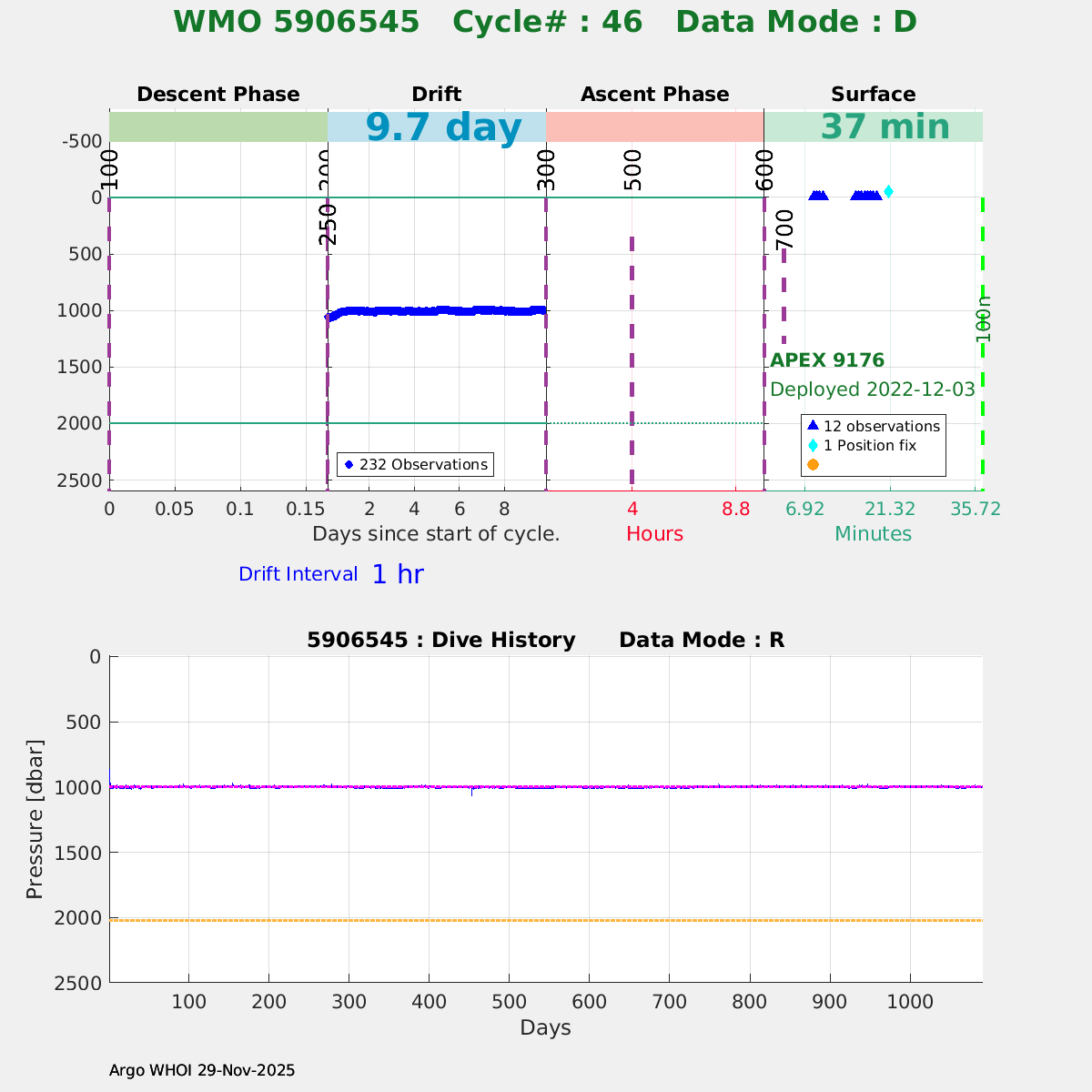 | WMO: #5906524 DAC: aoml PI: STEPHEN RISER/KEN JOHNSON APEX: #9248 SBE41CP: #13578 DRUCK_2900PSIA: #11564790 AANDERAA_OPTODE_4330: #3564 ISUS: #0927 SEAFET: #0927 ECO_FLBB_AP2: #6400 Altimeter Comparison (IFREMER) EuroArgo Link | ![]() |