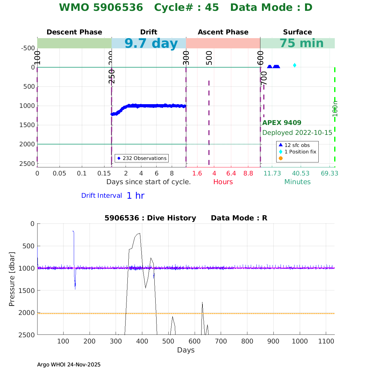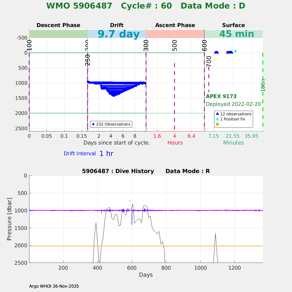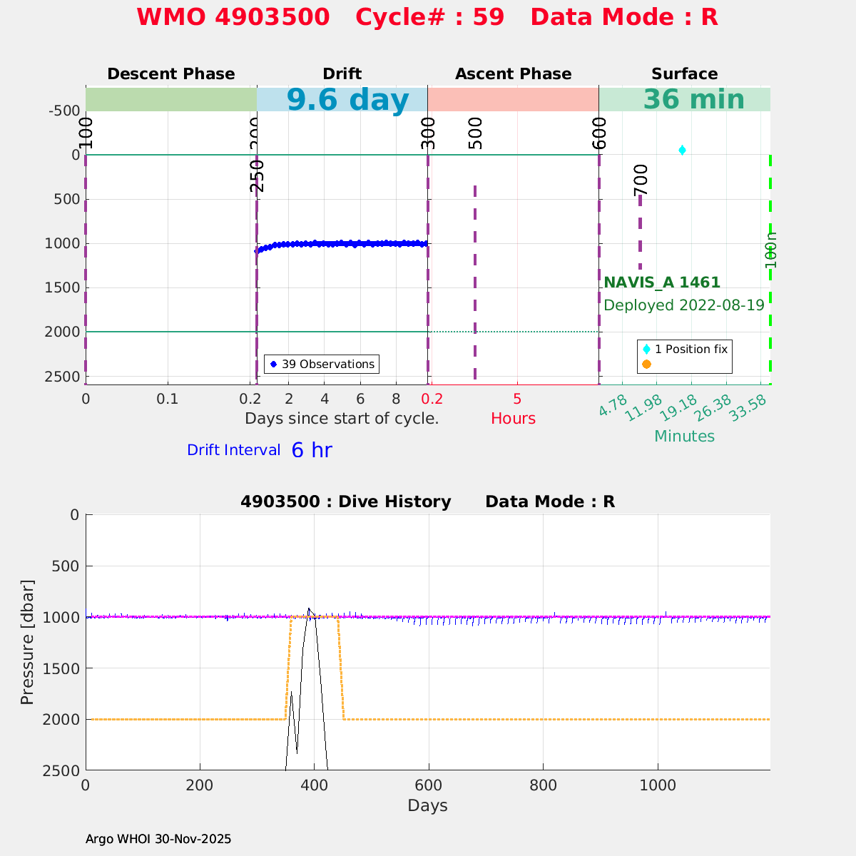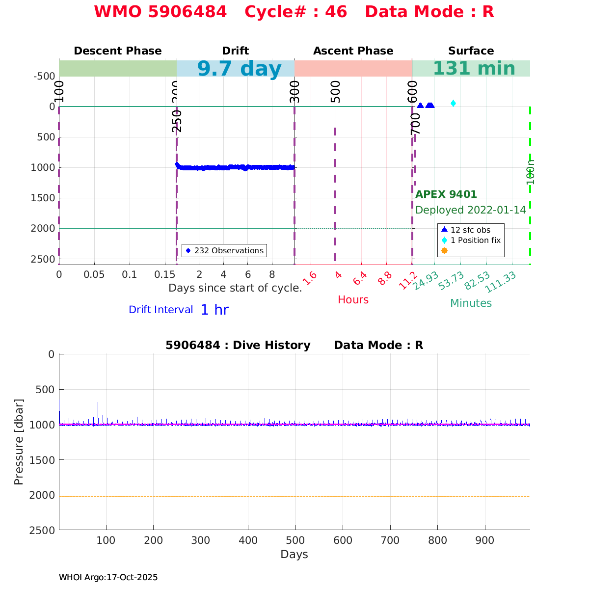 | WMO: #5906524 DAC: aoml PI: STEPHEN RISER/KEN JOHNSON APEX: #9248 SBE41CP: #13578 DRUCK_2900PSIA: #11564790 AANDERAA_OPTODE_4330: #3564 ISUS: #0927 SEAFET: #0927 ECO_FLBB_AP2: #6400 Altimeter Comparison (IFREMER) EuroArgo Link | ![]() |