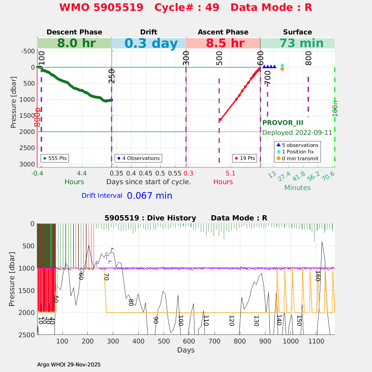 | WMO: #5906519 DAC: aoml PI: STEPHEN RISER/KEN JOHNSON APEX: #9417 SBE41CP: #15370 DRUCK_2900PSIA: #11918012 AANDERAA_OPTODE_4330: #3728 ISUS: #0969 DURA: #0969 ECO_FLBB_AP2: #6954 Altimeter Comparison (IFREMER) EuroArgo Link | ![]() |