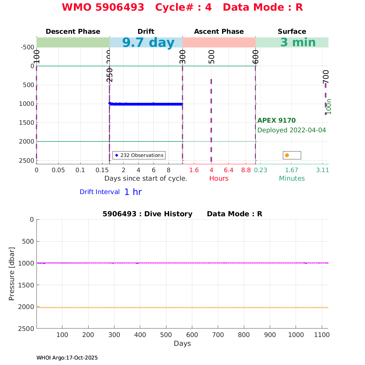 | WMO: #5906530 DAC: aoml PI: STEPHEN RISER/KEN JOHNSON APEX: #9433 SBE41CP: #16083 DRUCK_2900PSIA: #11962932 AANDERAA_OPTODE_4330: #3744 ISUS: #0986 DURA: #0986 ECO_FLBB_AP2: #7072 Altimeter Comparison (IFREMER) EuroArgo Link | ![]() |