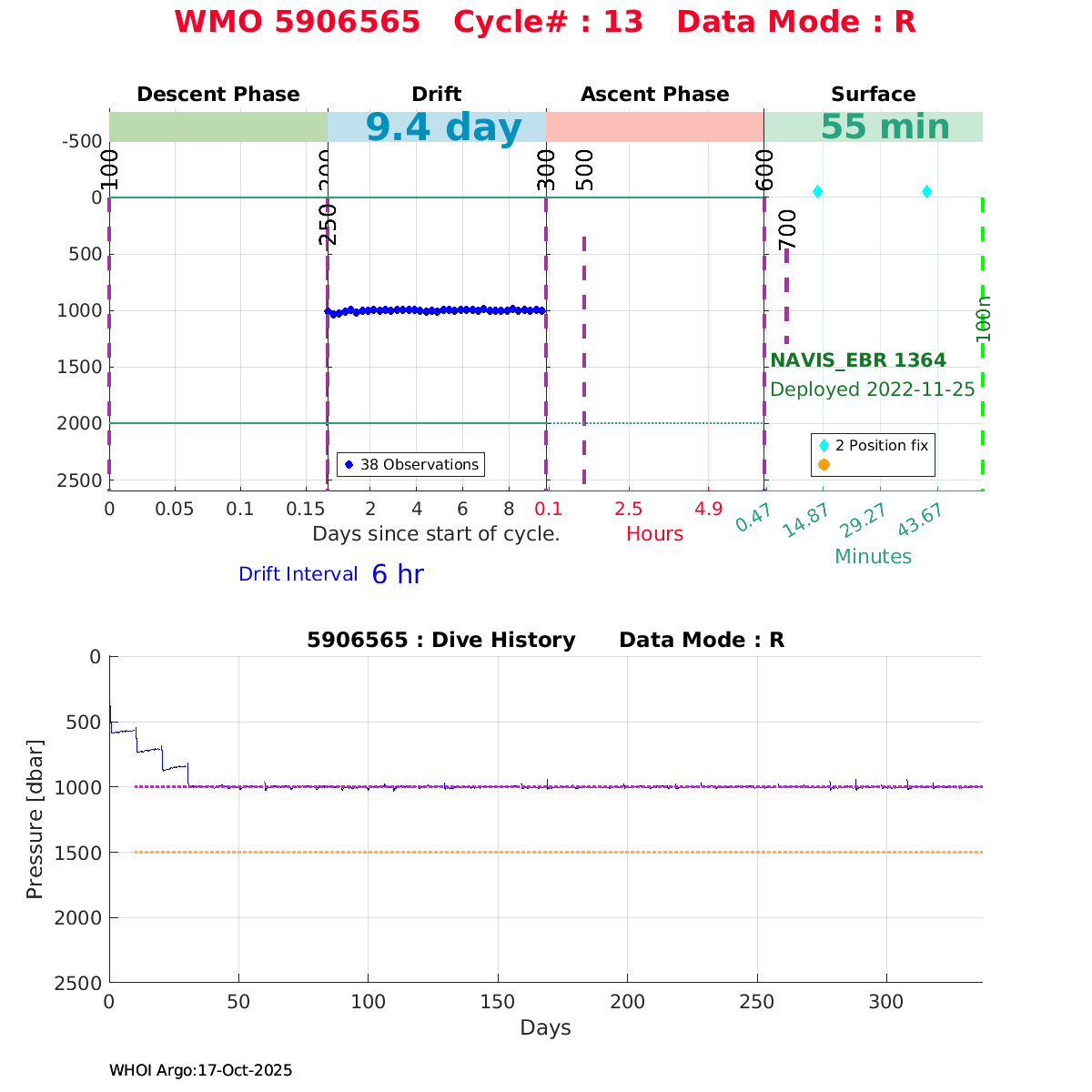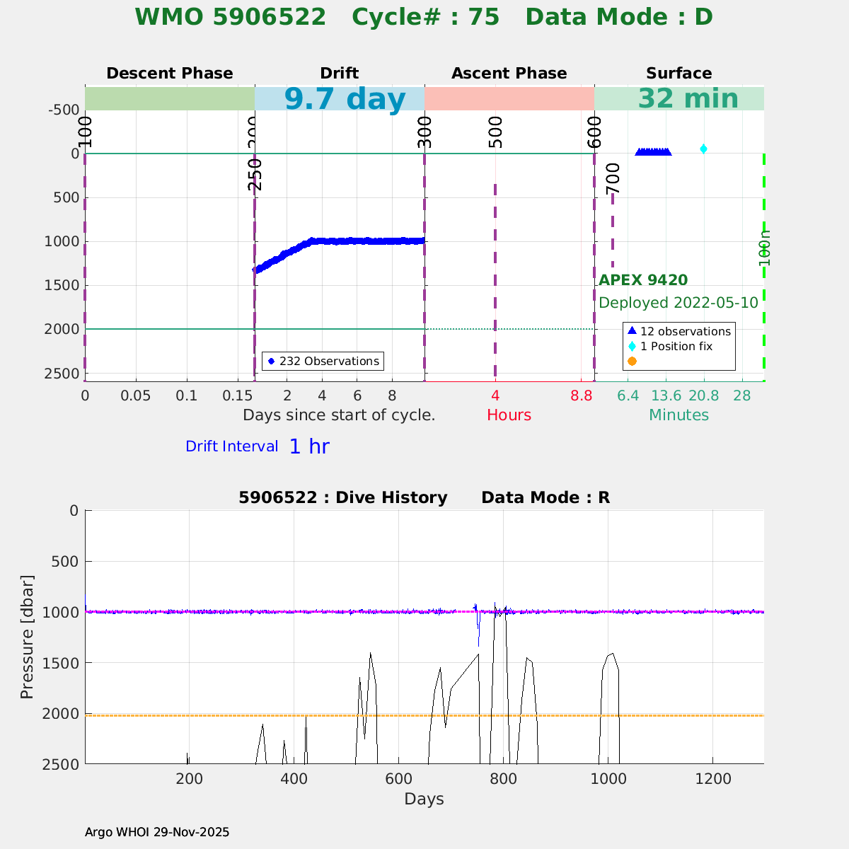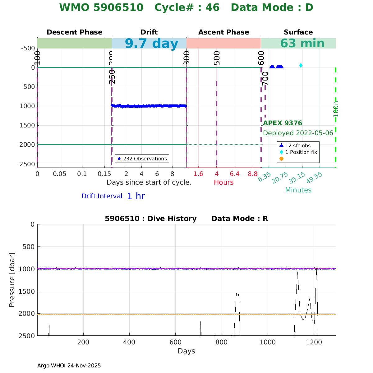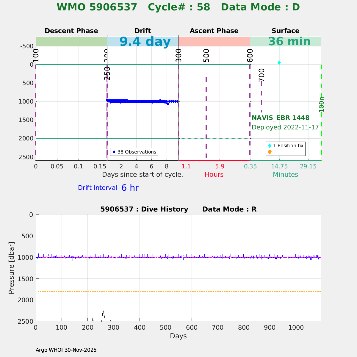| WMO: #5906510 DAC: aoml PI: STEPHEN RISER/KEN JOHNSON APEX: #9376 SBE41CP: #14303 DRUCK_2900PSIA: #11445364 AANDERAA_OPTODE_4330: #3701 ISUS: #0956 DURA: #0956 ECO_FLBB_AP2: #6807 Altimeter Comparison (IFREMER) EuroArgo Link | ![]() |