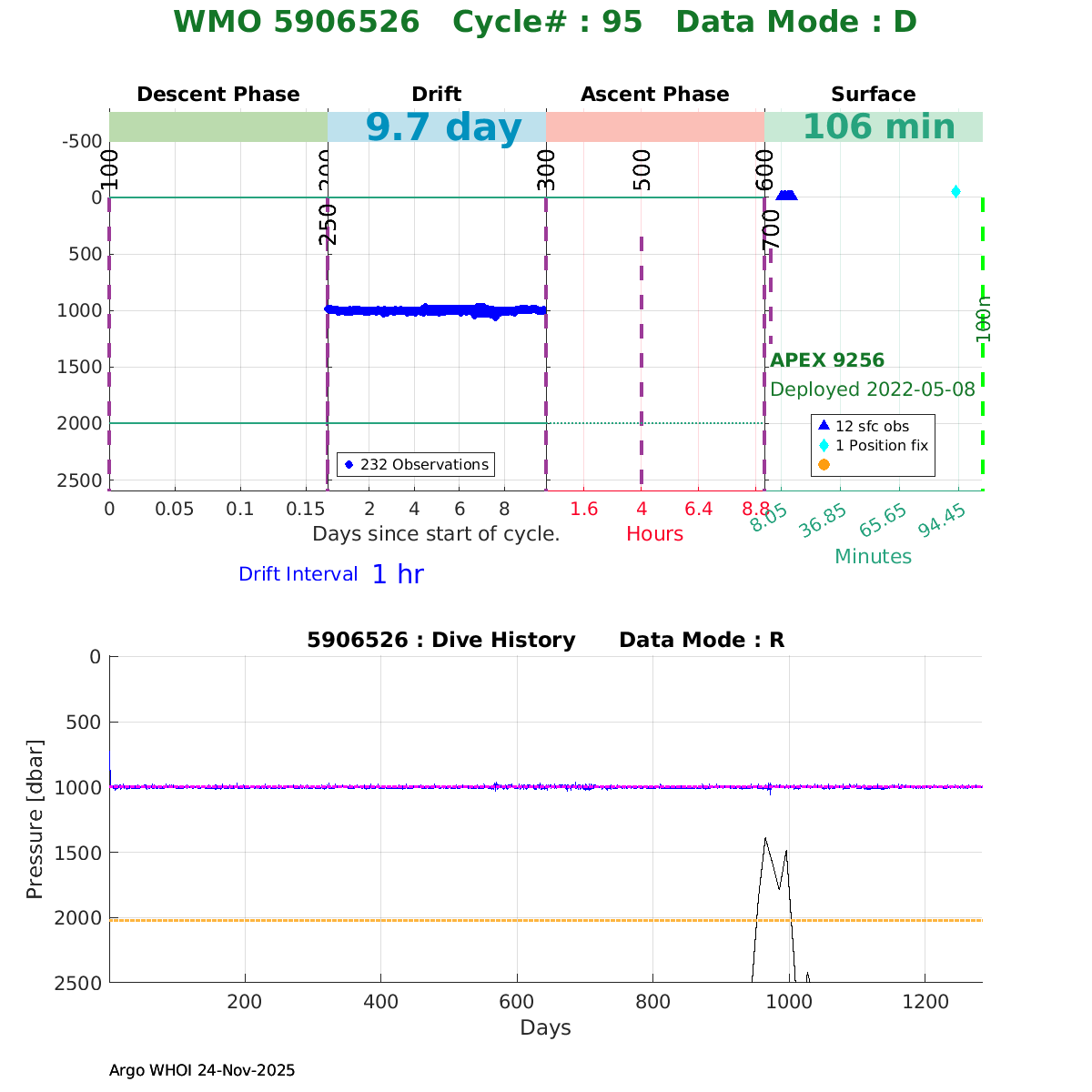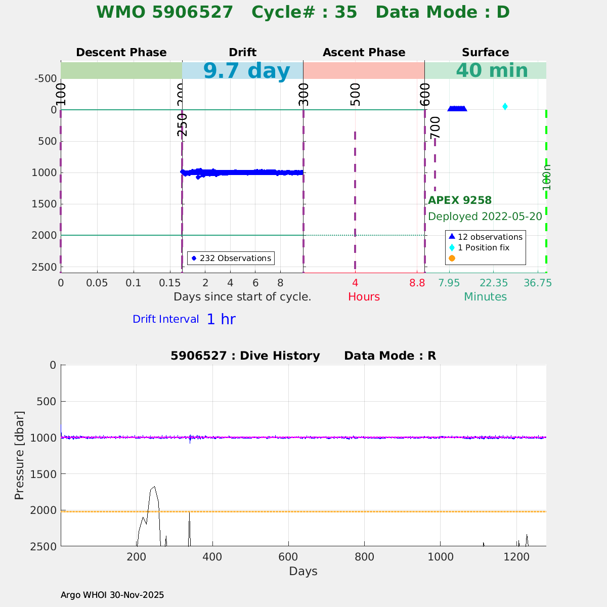 | WMO: #5906527 DAC: aoml PI: STEPHEN RISER/KEN JOHNSON APEX: #9258 SBE41CP: #13624 DRUCK_2900PSIA: #11685330 AANDERAA_OPTODE_4330: #3574 ISUS: #0933 SEAFET: #0933 Altimeter Comparison (IFREMER) EuroArgo Link | ![]() |