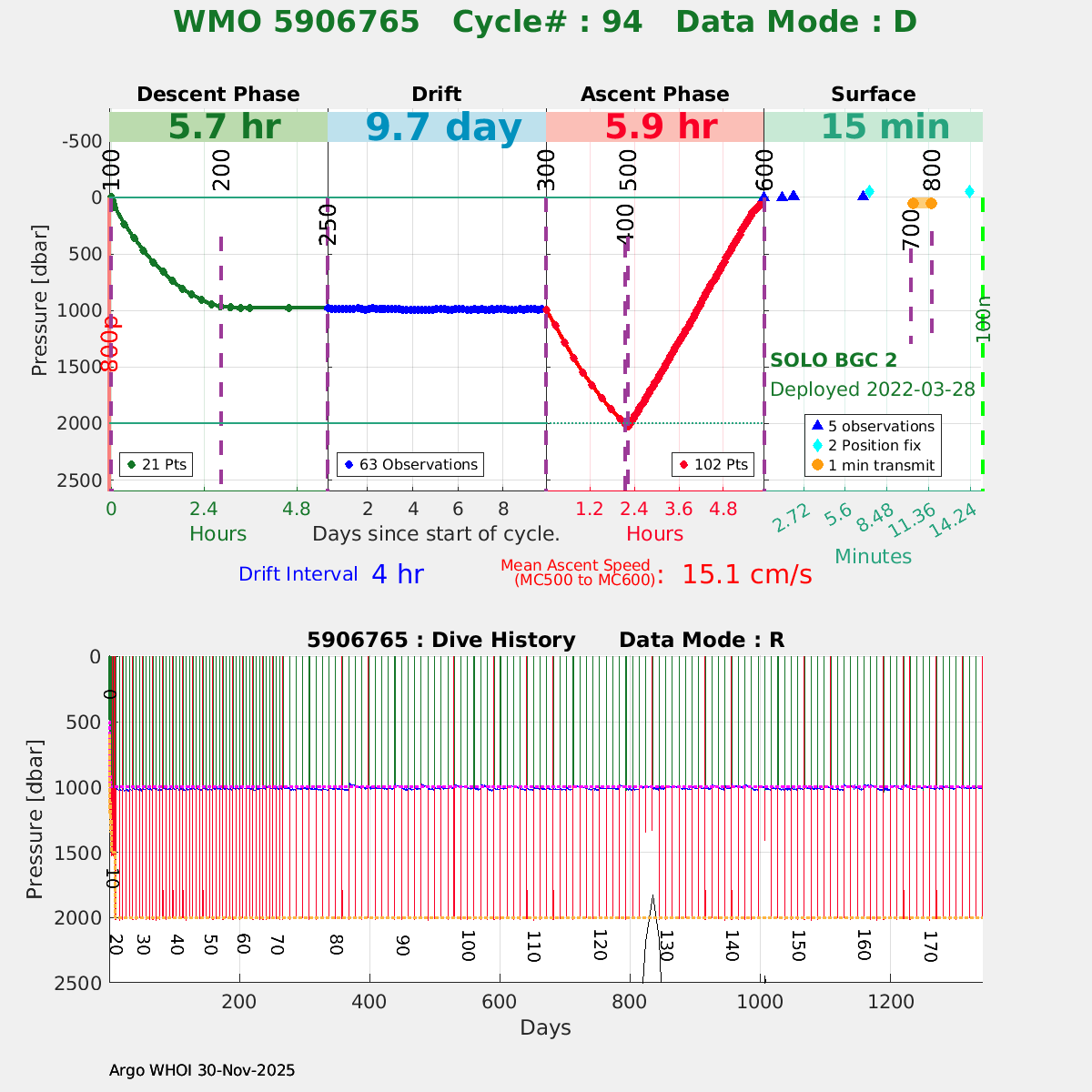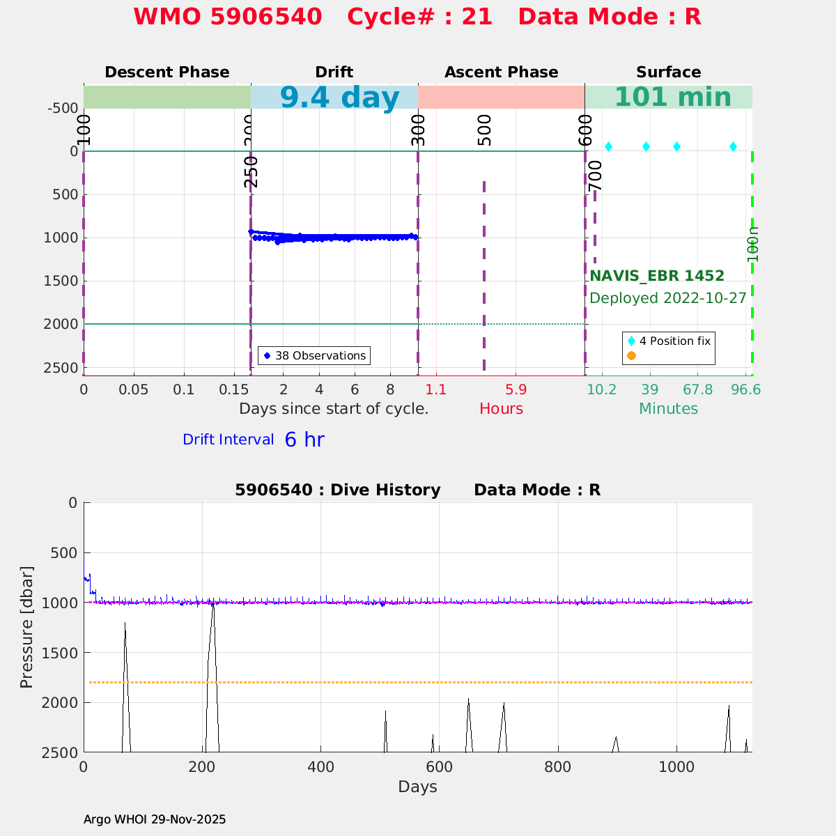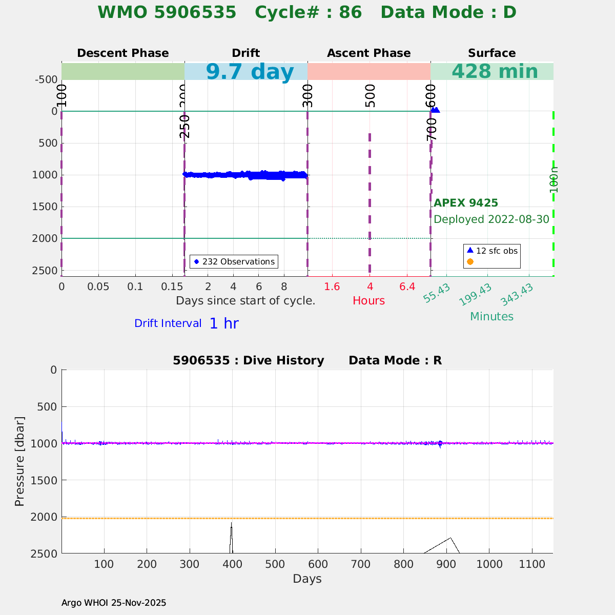 | WMO: #5906485 DAC: aoml PI: STEPHEN RISER/KEN JOHNSON APEX: #9402 SBE41CP: #14435 DRUCK_2900PSIA: #11892858 AANDERAA_OPTODE_4330: #3711 ISUS: #0951 DURA: #0951 ECO_FLBB_AP2: #6853 Altimeter Comparison (IFREMER) EuroArgo Link | n/a | n/a | ![]() |
