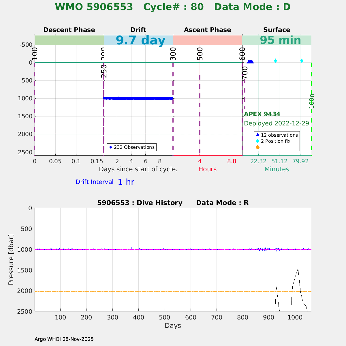 | WMO: #5906553 DAC: aoml PI: STEPHEN RISER/KEN JOHNSON APEX: #9434 SBE41CP: #16131 DRUCK_2900PSIA: #11962933 AANDERAA_OPTODE_4330: #3767 ISUS: #0987 DURA: #0987 ECO_FLBB_AP2: #7073 Altimeter Comparison (IFREMER) EuroArgo Link | ![]() |