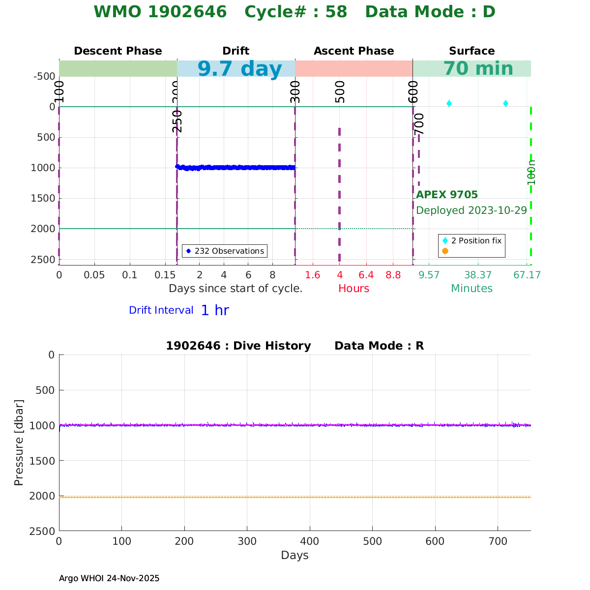 | WMO: #1902646 DAC: aoml PI: STEPHEN RISER/KEN JOHNSON APEX: #9705 SBE41CP: #17435 DRUCK_2900PSIA: #12095463 AANDERAA_OPTODE_4330: #3796 ISUS: #1058 DURA: #1058 ECO_FLBB_AP2: #7410 Altimeter Comparison (IFREMER) EuroArgo Link | ![]() |