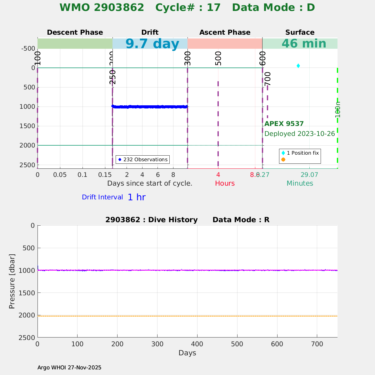 | WMO: #3902554 DAC: aoml PI: STEPHEN RISER/KEN JOHNSON APEX: #9707 SBE41CP: #17590 DRUCK_2900PSIA: #12120845 AANDERAA_OPTODE_4330: #3800 ISUS: #1057 DURA: #1057 ECO_FLBB_AP2: #7448 Altimeter Comparison (IFREMER) EuroArgo Link | ![]() |