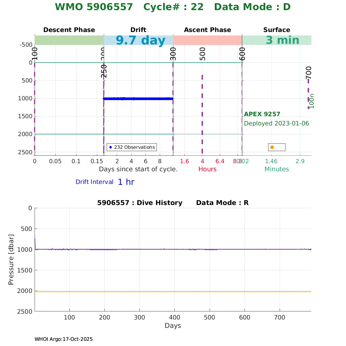 | WMO: #5906577 DAC: aoml PI: STEPHEN RISER/KEN JOHNSON APEX: #9527 SBE41CP: #17171 DRUCK_2900PSIA: #12055512 AANDERAA_OPTODE_4330: #3774 ISUS: #1019 DURA: #1019 ECO_FLBB_AP2: #7226 Altimeter Comparison (IFREMER) EuroArgo Link | ![]() |