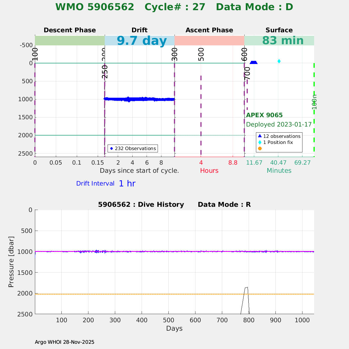 | WMO: #5906555 DAC: aoml PI: STEPHEN RISER/KEN JOHNSON APEX: #9169 SBE41CP: #13305 DRUCK_2900PSIA: #11589082 AANDERAA_OPTODE_4330: #3532 ISUS: #0914 DURA: #0914 ECO_FLBB_AP2: #6403 Altimeter Comparison (IFREMER) EuroArgo Link | n/a | n/a | ![]() |