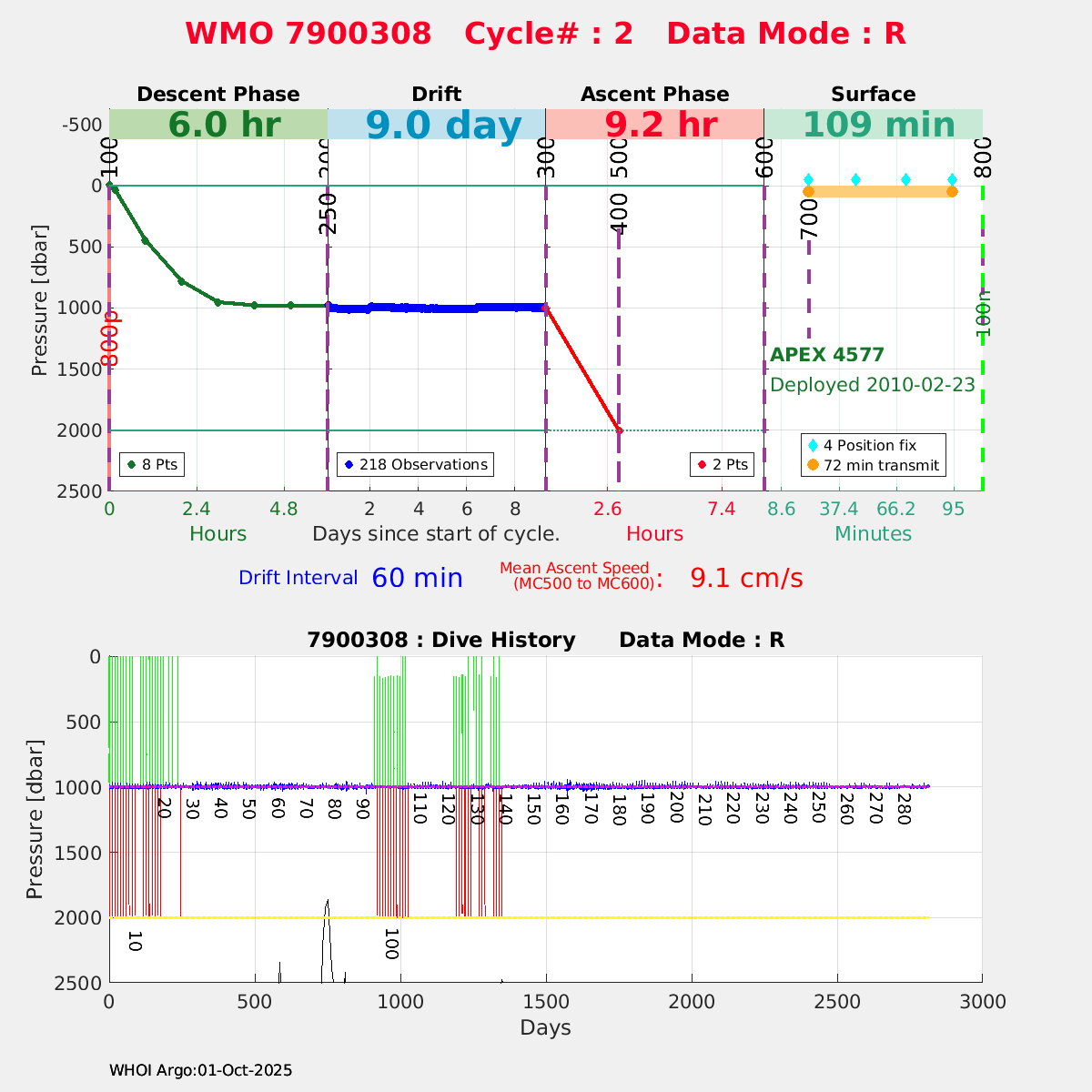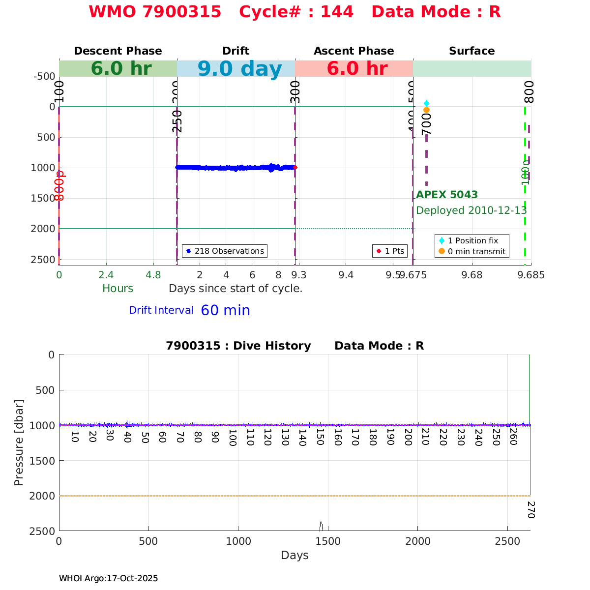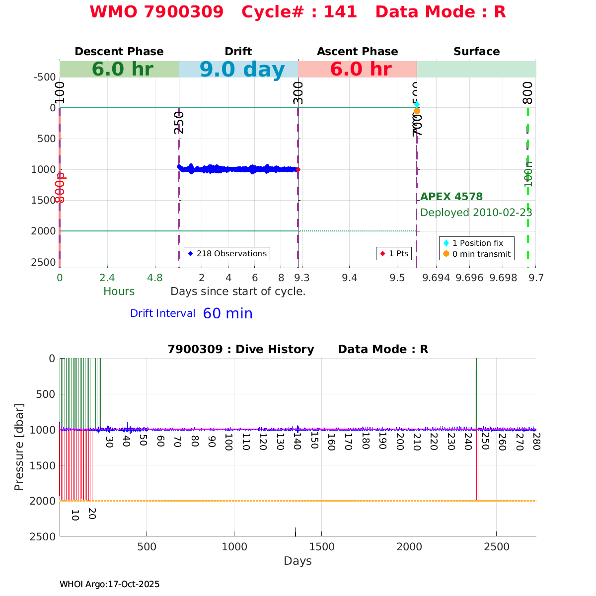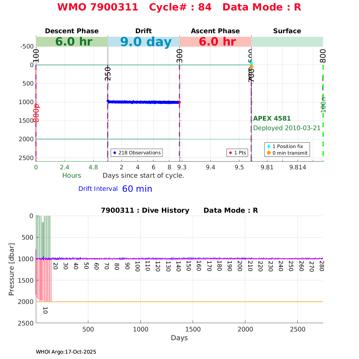 | WMO: #1901250 DAC: bodc PI: Jon Turton APEX: #4501 KISTLER_2900PSIA: #2103313 SBE41: #4585 Altimeter Comparison (IFREMER) EuroArgo Link | ![]() |