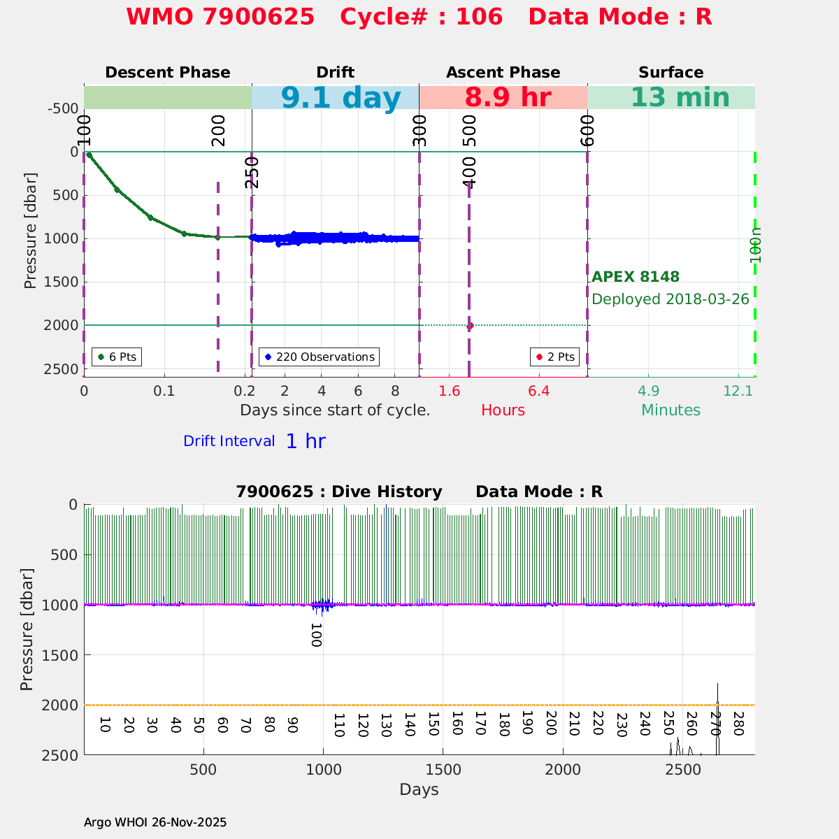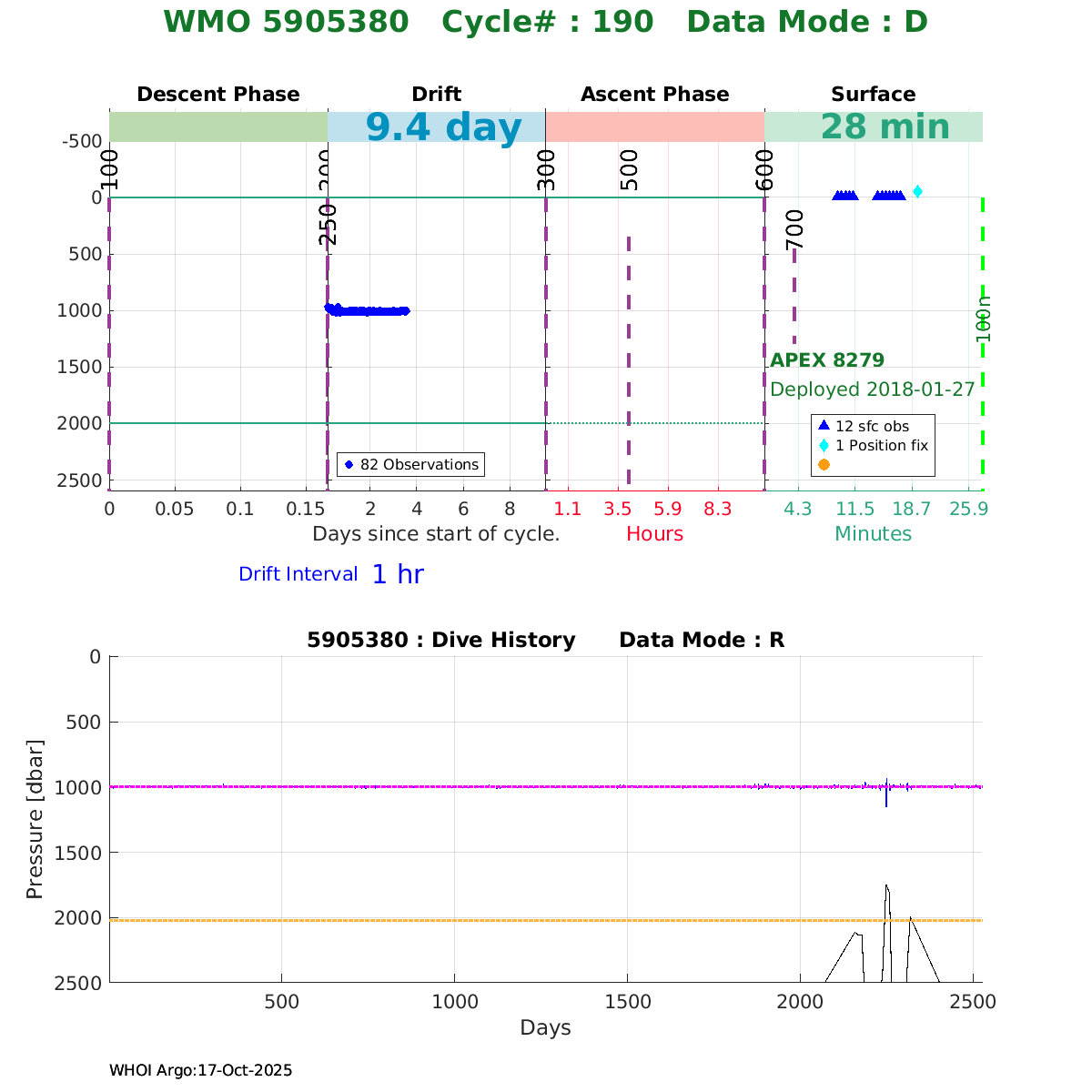 | WMO: #1901906 DAC: bodc PI: Jon Turton APEX: #8061 DRUCK_2900PSIA: #10445832 SBE41CP_V7.2.5: #9191 Altimeter Comparison (IFREMER) EuroArgo Link | ![]() |