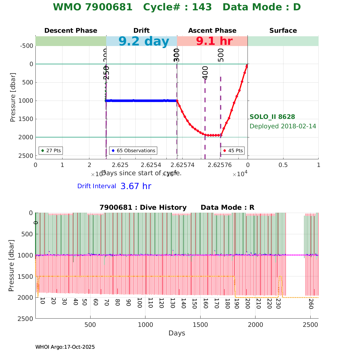 | WMO: #7900681 DAC: aoml PI: Dean ROEMMICH SOLO_II: #8628 DRUCK_2900PSIA: #10490693 SBE41CP: #9437 Altimeter Comparison (IFREMER) EuroArgo Link | ![]() |
