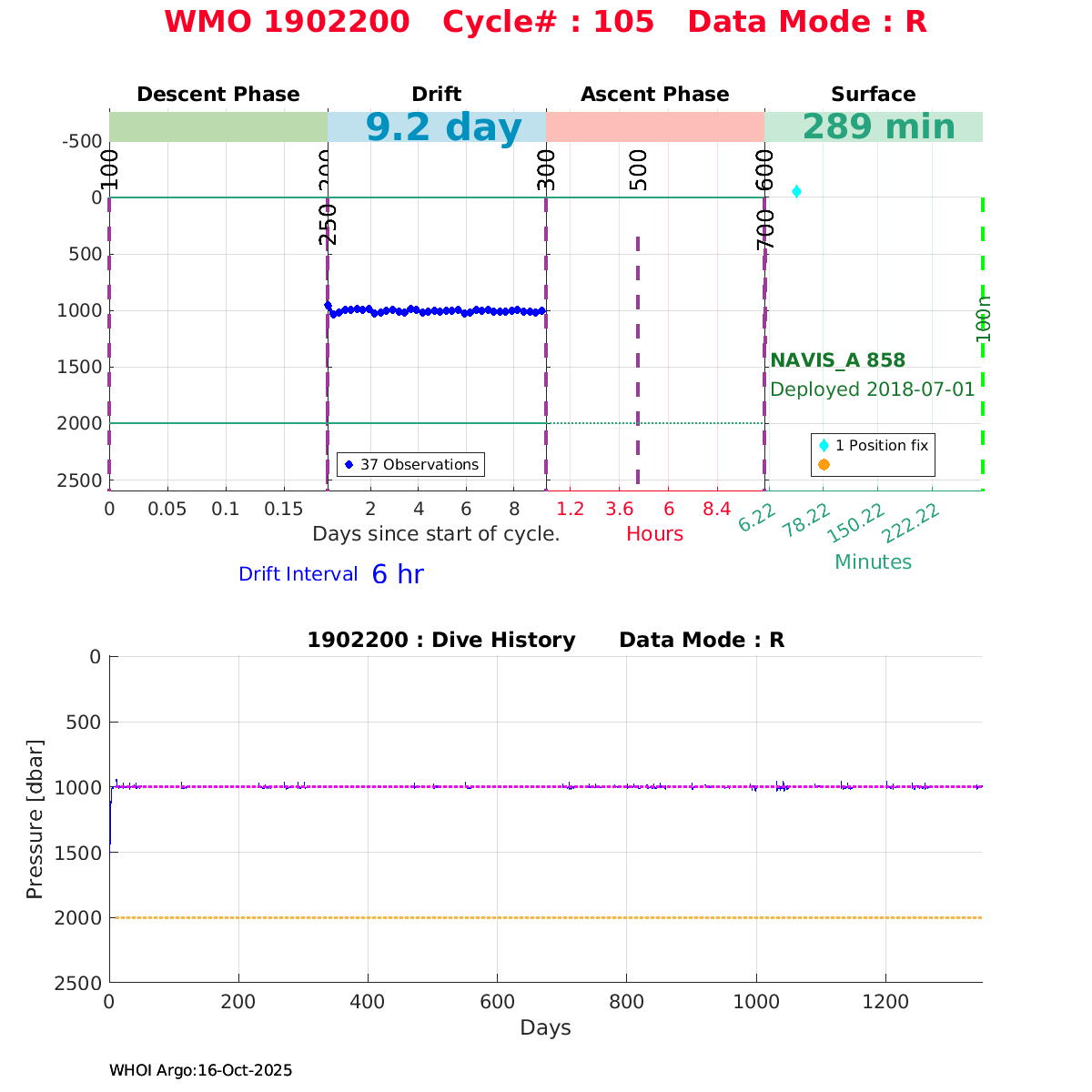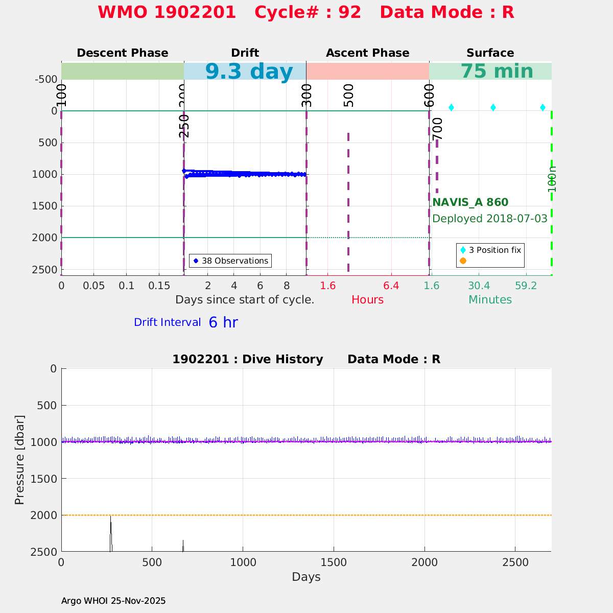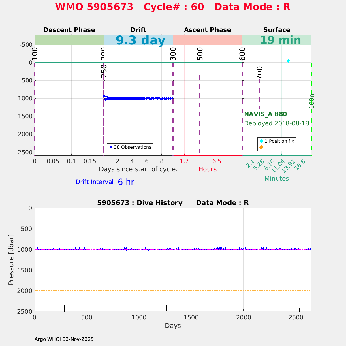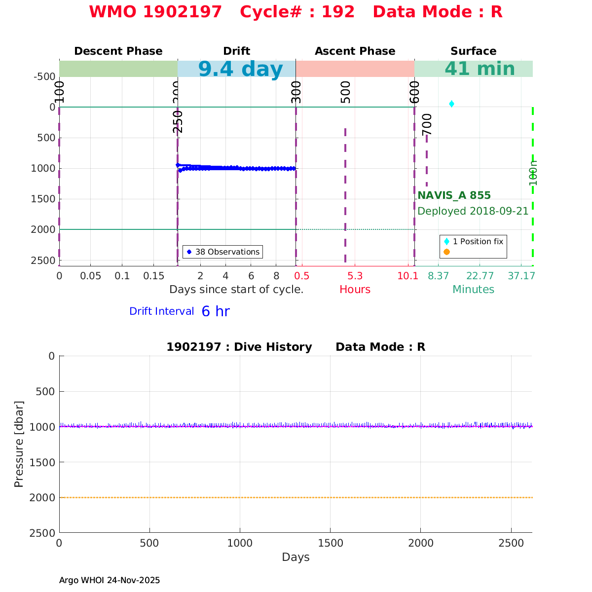 | WMO: #1902193 DAC: aoml PI: GREGORY C. JOHNSON NAVIS_A: #840 SBE41CP_V7.2.5: #09854 DRUCK_2900PSIA: #10649485 Altimeter Comparison (IFREMER) EuroArgo Link | ![]() |