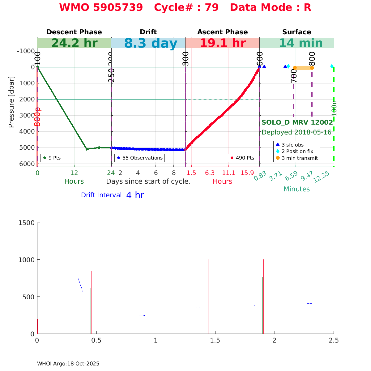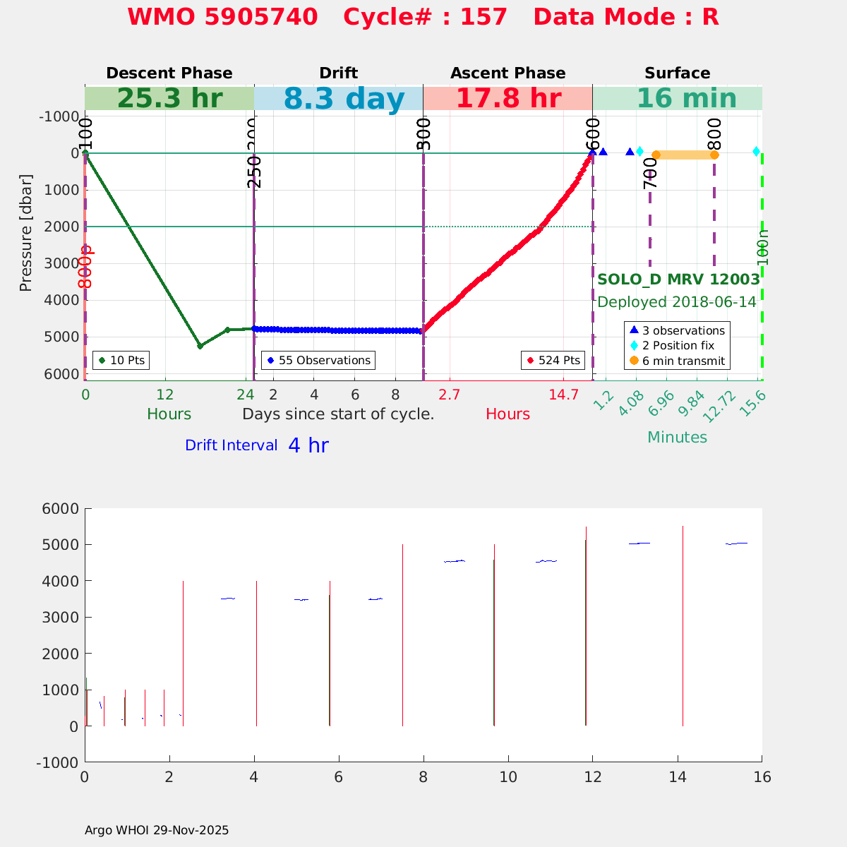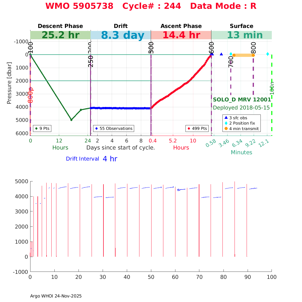 | WMO: #5905738 DAC: aoml PI: GREGORY C. JOHNSON SOLO_D MRV: #12001 SBE: #5641 KISTLER_10153PSIA: #5013303 Altimeter Comparison (IFREMER) EuroArgo Link | ![]() |