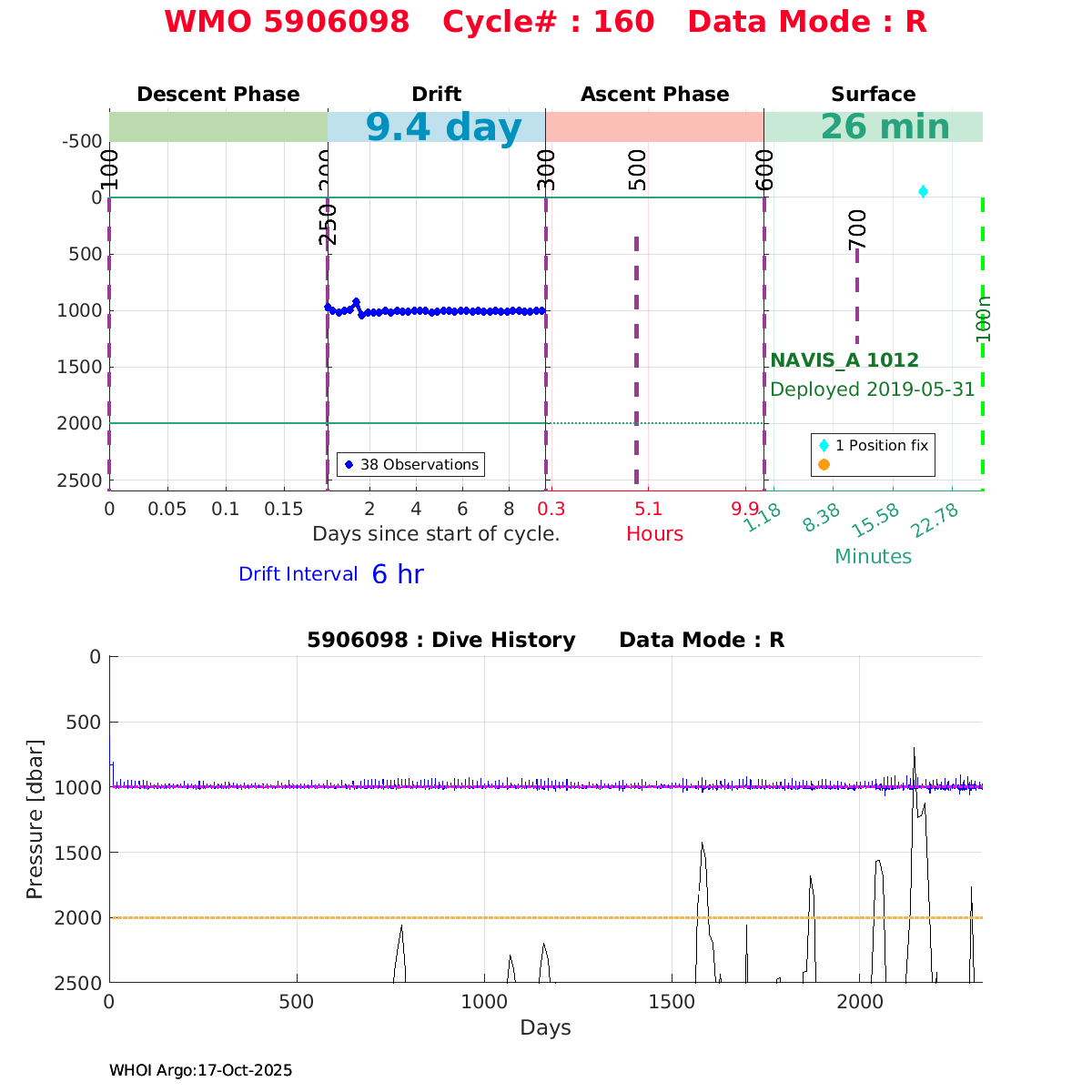 | WMO: #3902153 DAC: aoml PI: GREGORY C. JOHNSON SOLO_D MRV: #12018 SBE61: #5721 KISTLER_10153PSIA: #5276577 Altimeter Comparison (IFREMER) EuroArgo Link | ![]() |
