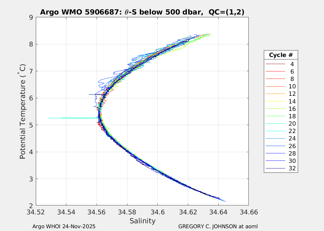 | WMO: #2903946 DAC: aoml PI: GREGORY C. JOHNSON SOLO_D MRV: #12097 SBE61: #5931 KISTLER_10153PSIA: #5835038 Altimeter Comparison (IFREMER) EuroArgo Link | ![]() |