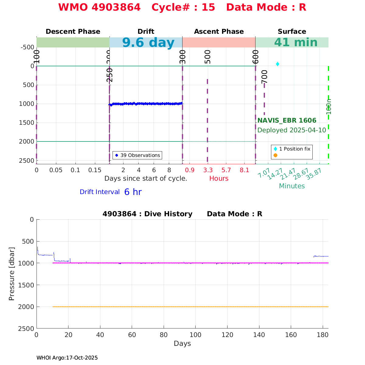 | WMO: #4903864 DAC: aoml PI: GREGORY C. JOHNSON NAVIS_EBR: #1606 SBE41CP: #19774 DRUCK_2900PSIA: #12387741 Altimeter Comparison (IFREMER) EuroArgo Link | ![]() |