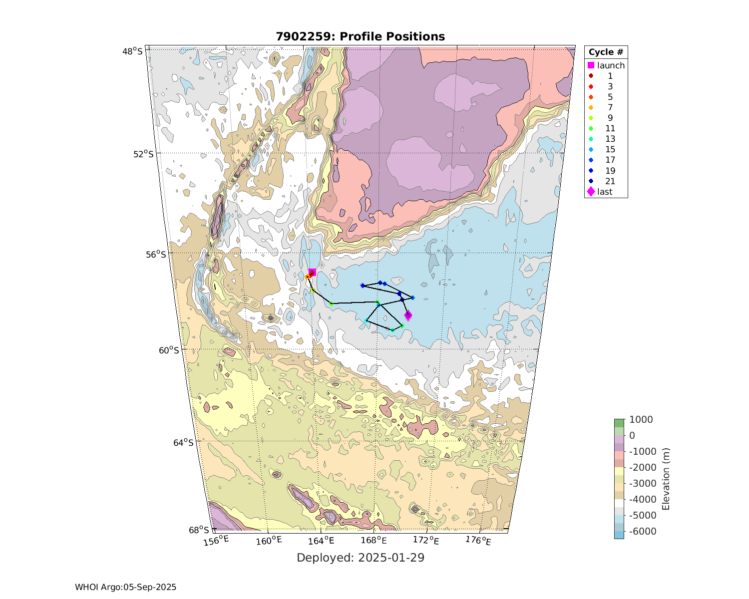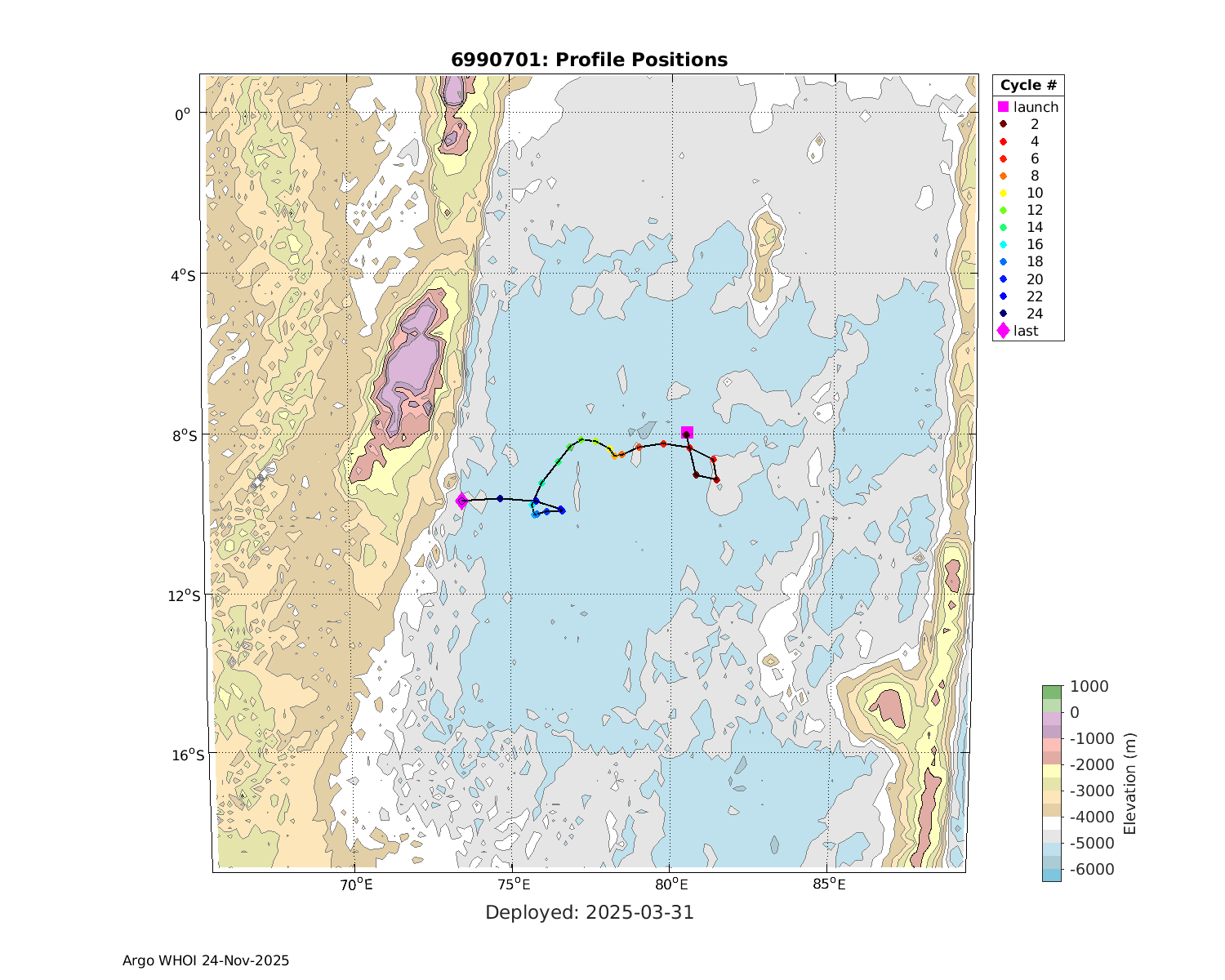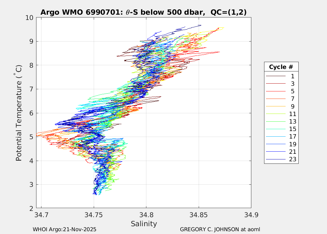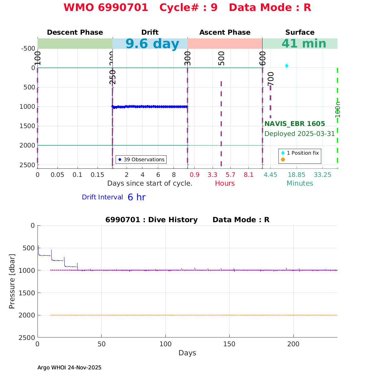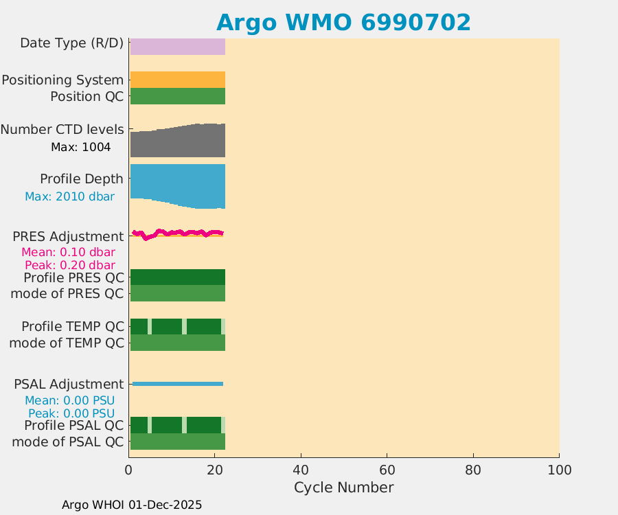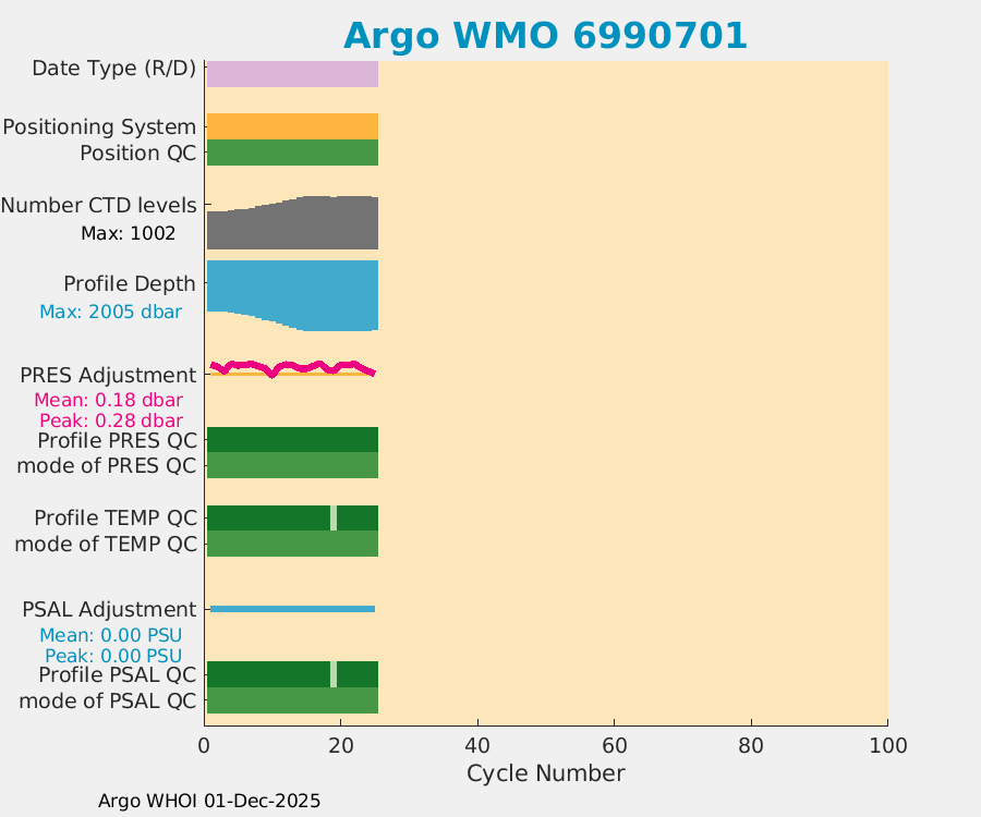 | WMO: #6990701 DAC: aoml PI: GREGORY C. JOHNSON NAVIS_EBR: #1605 SBE41CP: #19772 DRUCK_2900PSIA: #12387736 Altimeter Comparison (IFREMER) EuroArgo Link | ![]() |