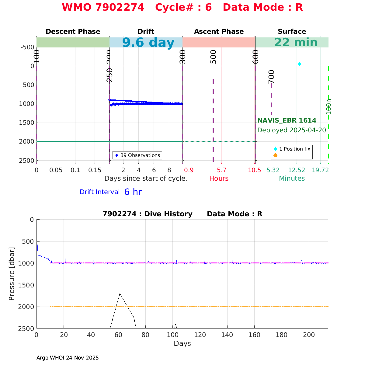 | WMO: #5906884 DAC: aoml PI: ANDREA FASSBENDER NAVIS_EBR: #1748 SBE41CP: #21001 DRUCK_2900PSIA: #12742476 SBE63_OPTODE: #0167 SUNA_V2: #2376 SEAFET: #21001-20538 MCOMS_FLBBCD: #0543 Altimeter Comparison (IFREMER) EuroArgo Link | n/a | n/a | ![]() |