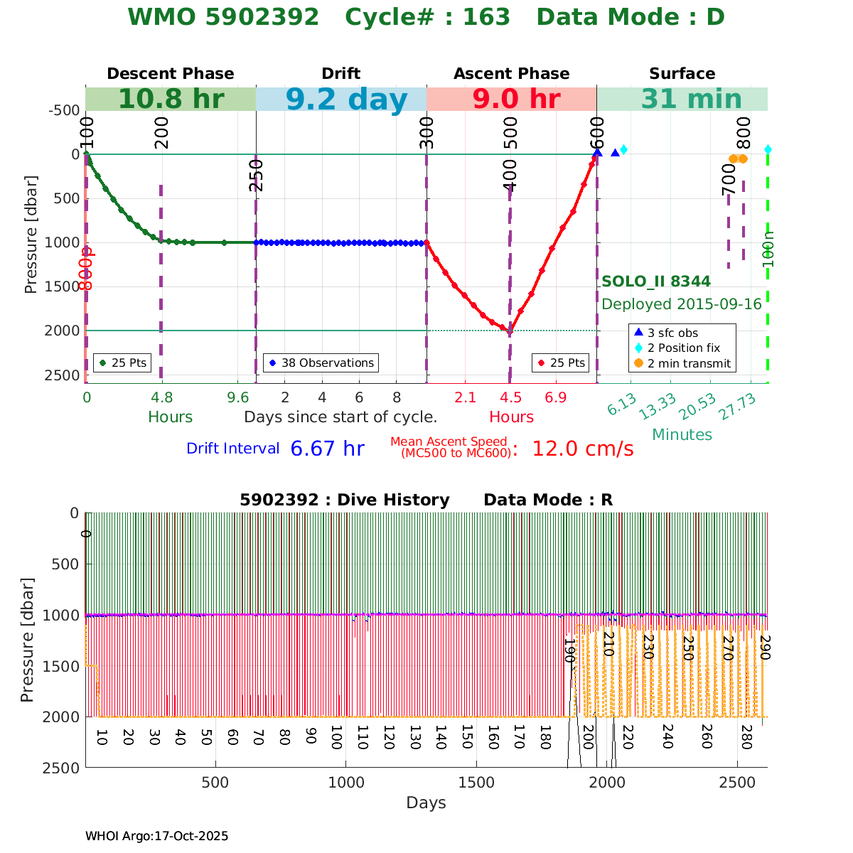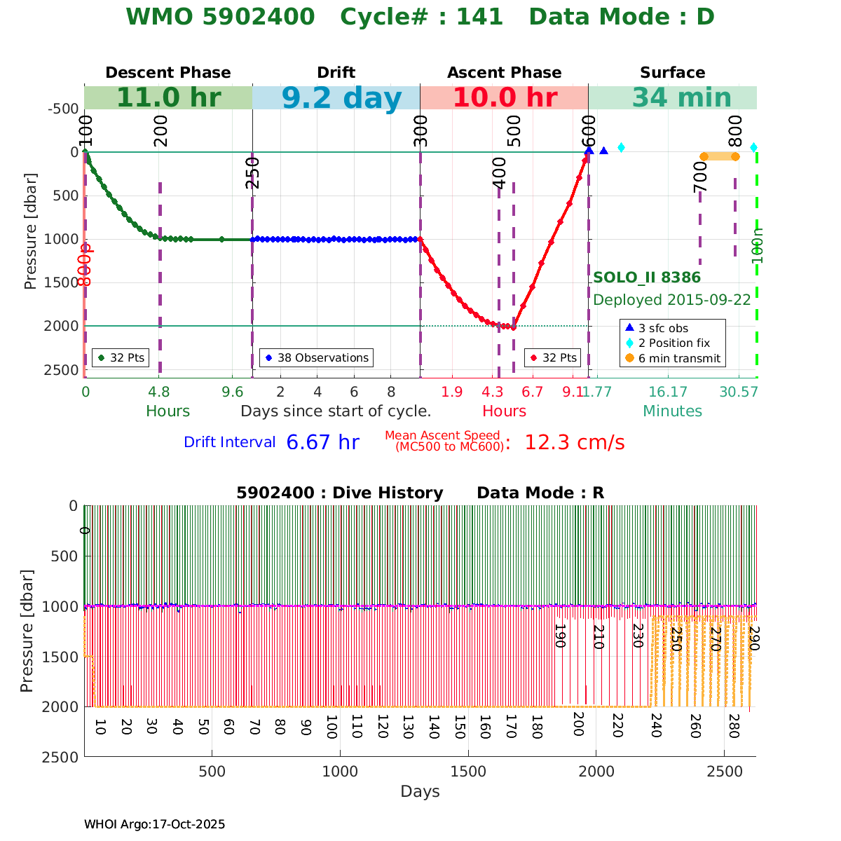 | WMO: #5902381 DAC: aoml PI: Dean ROEMMICH SOLO_II: #8324 KISTLER_2900PSIA: #2150362 SBE41CP: #5852 Altimeter Comparison (IFREMER) EuroArgo Link | ![]() |