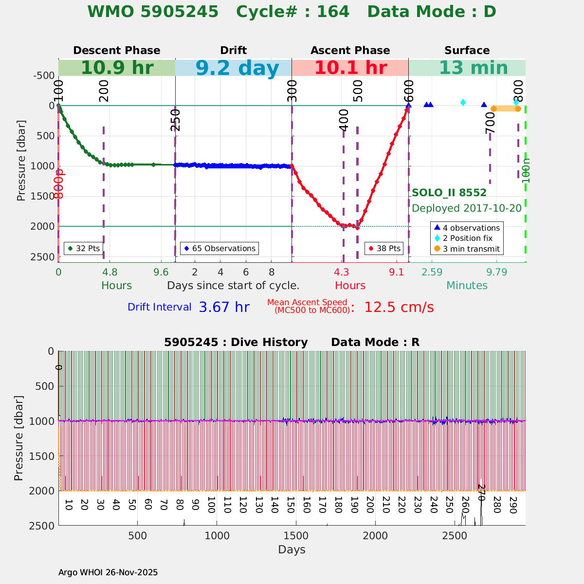 | WMO: #5905236 DAC: aoml PI: Dean ROEMMICH SOLO_II: #8527 DRUCK_2900PSIA: #10374292 SBE41CP: #8668 Altimeter Comparison (IFREMER) EuroArgo Link | ![]() |