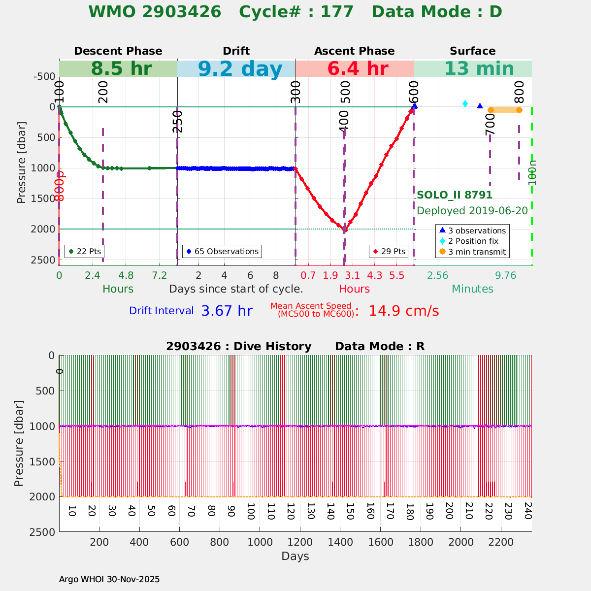 | WMO: #2903426 DAC: aoml PI: Dean ROEMMICH SOLO_II: #8791 DRUCK_2900PSIA: #10733407 SBE41CP: #10844 Altimeter Comparison (IFREMER) EuroArgo Link | ![]() |