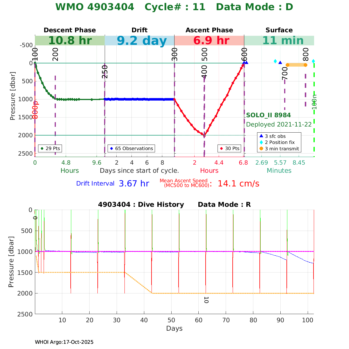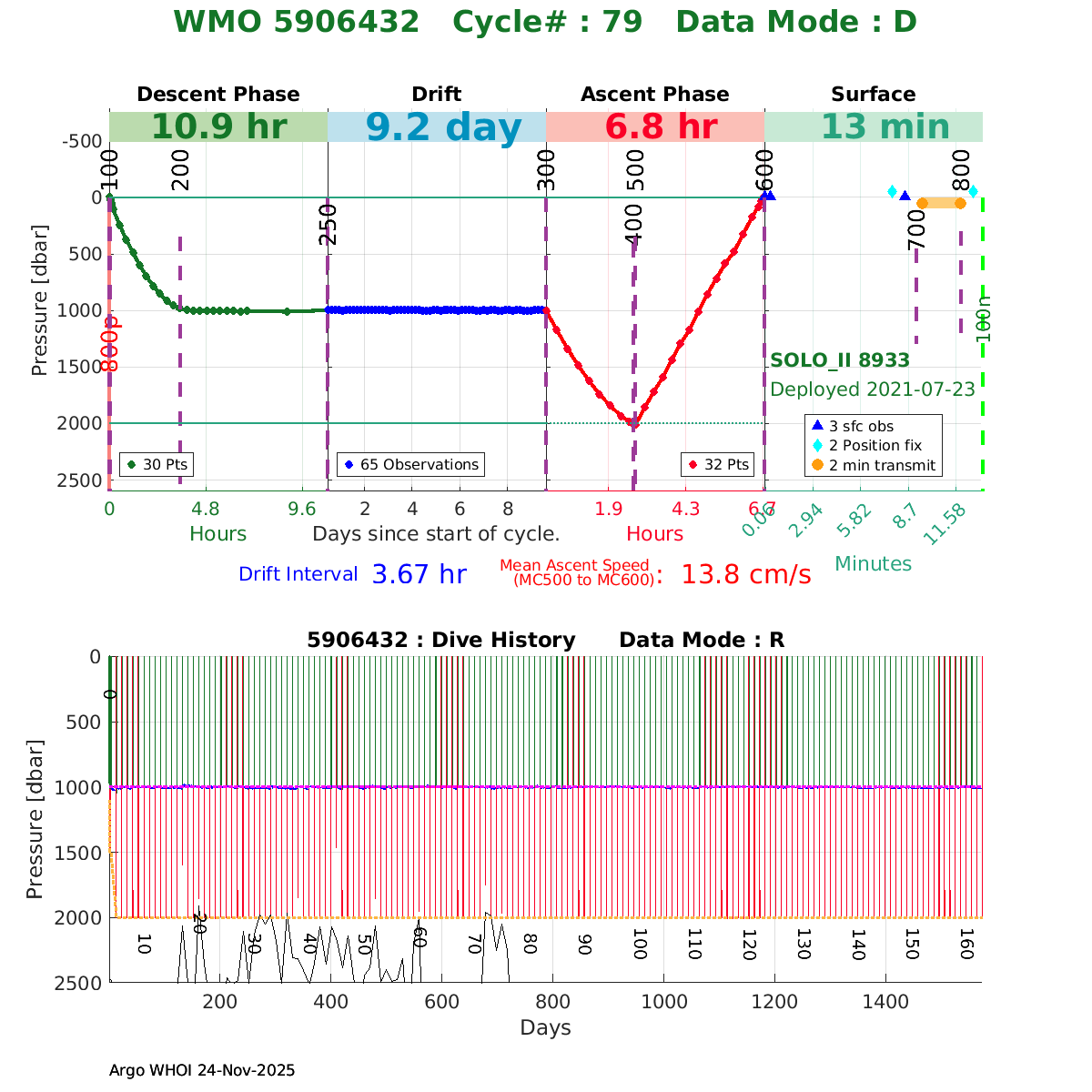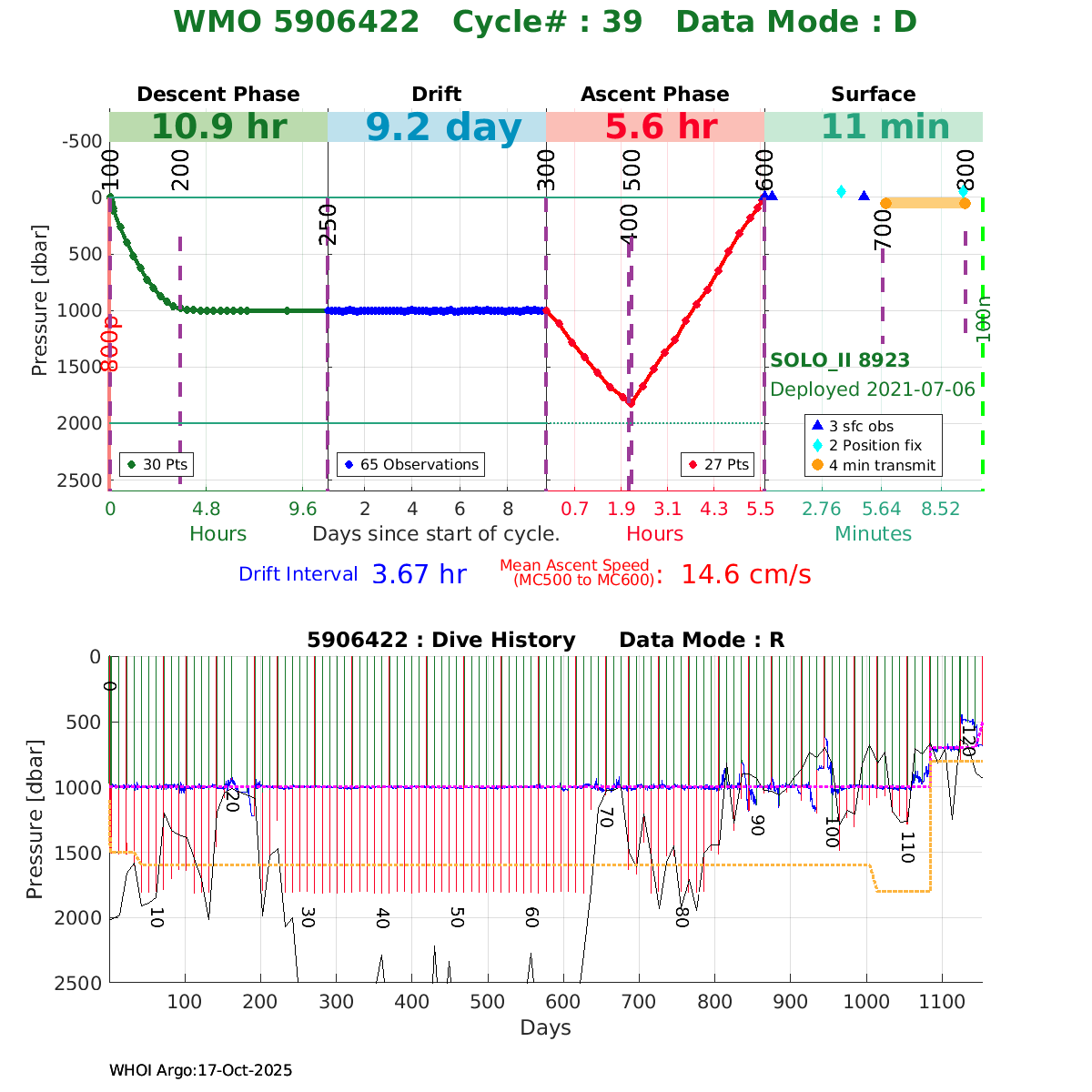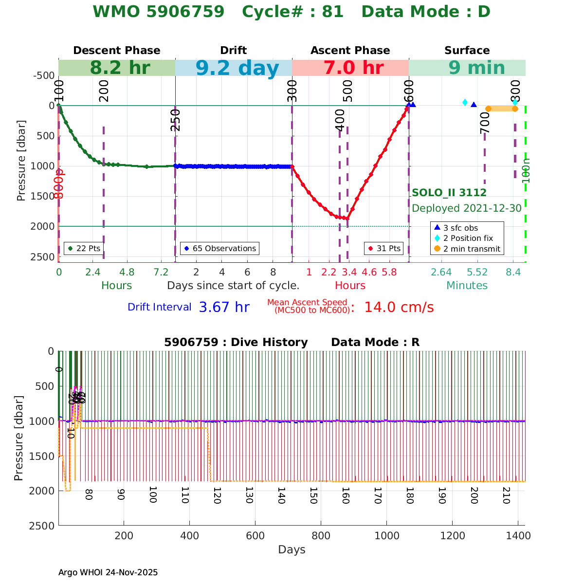 | WMO: #5906414 DAC: aoml PI: Dean ROEMMICH, Nathalie ZILBERMAN, Sarah PURKEY, John GILSON SOLO_D: #6075 KISTLER_10153PSIA: #5361150 SBE61: #5759 Altimeter Comparison (IFREMER) EuroArgo Link | ![]() |