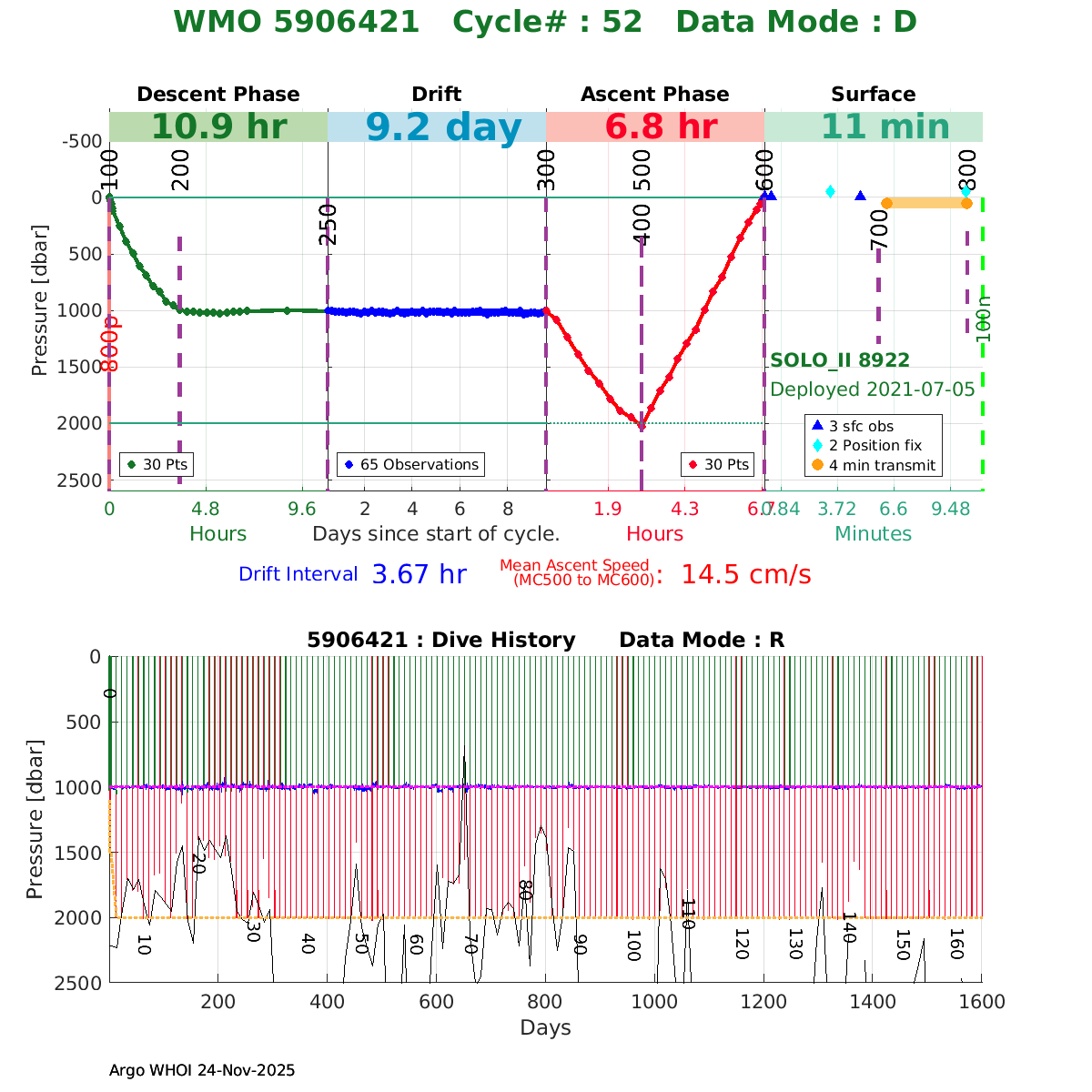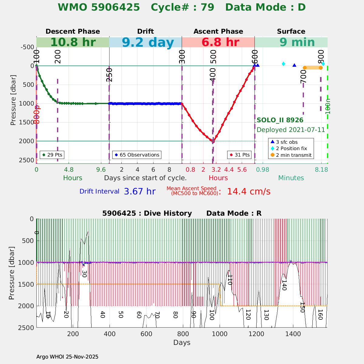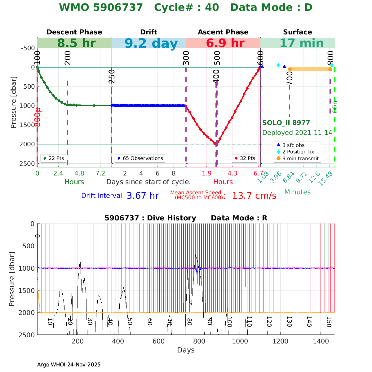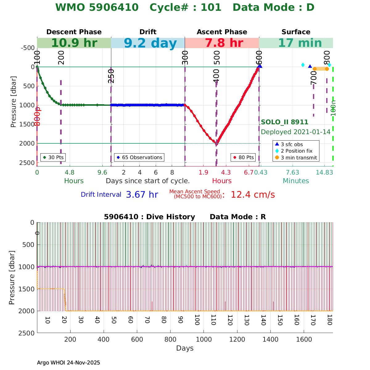 | WMO: #5906414 DAC: aoml PI: Dean ROEMMICH, Nathalie ZILBERMAN, Sarah PURKEY, John GILSON SOLO_D: #6075 KISTLER_10153PSIA: #5361150 SBE61: #5759 Altimeter Comparison (IFREMER) EuroArgo Link | ![]() |