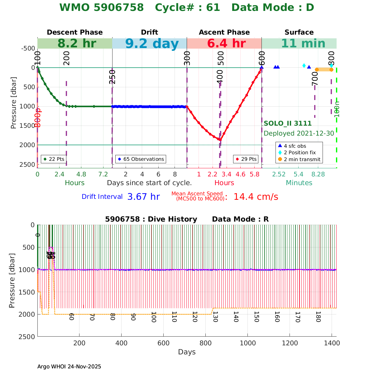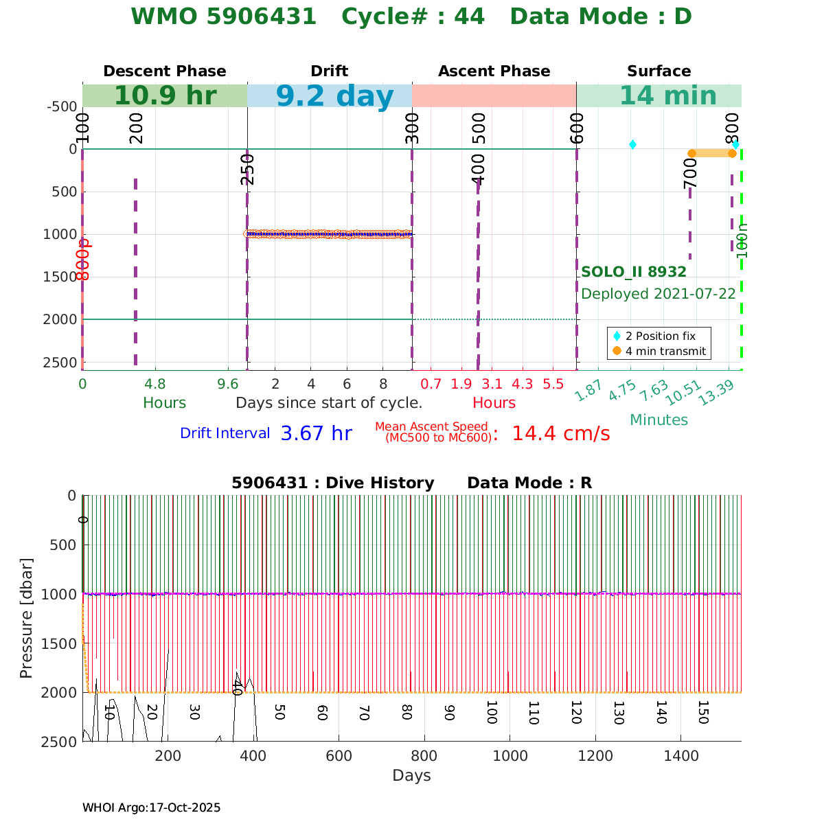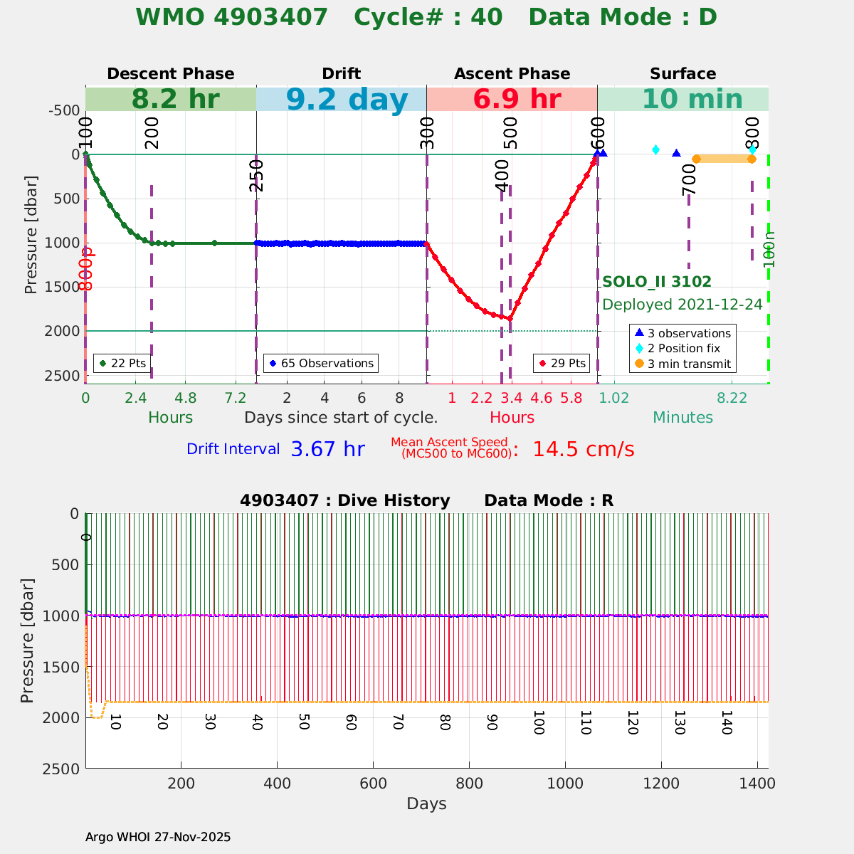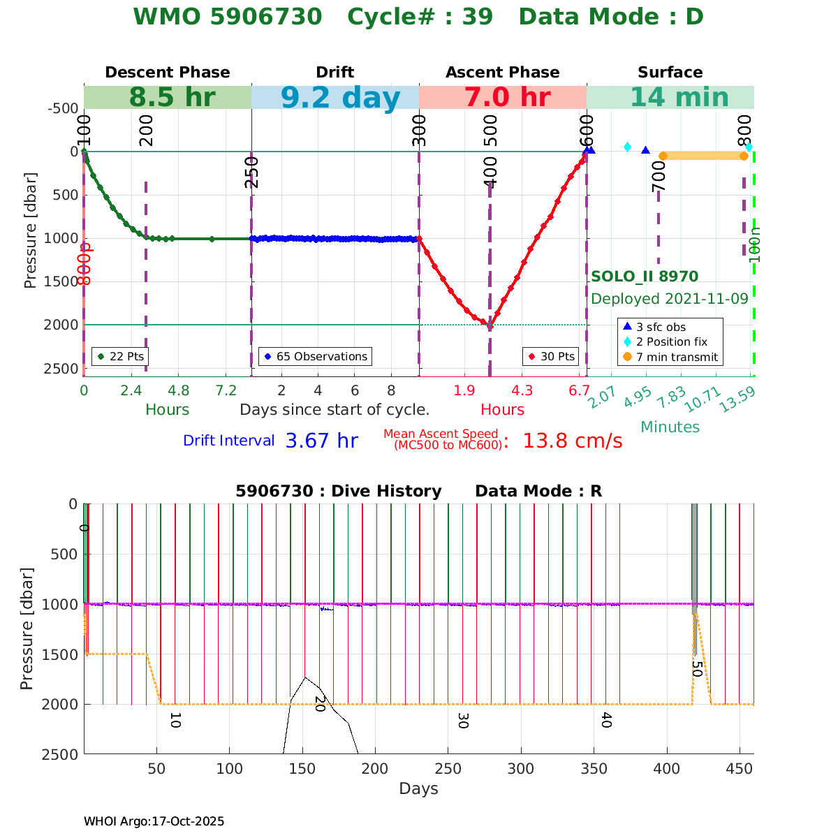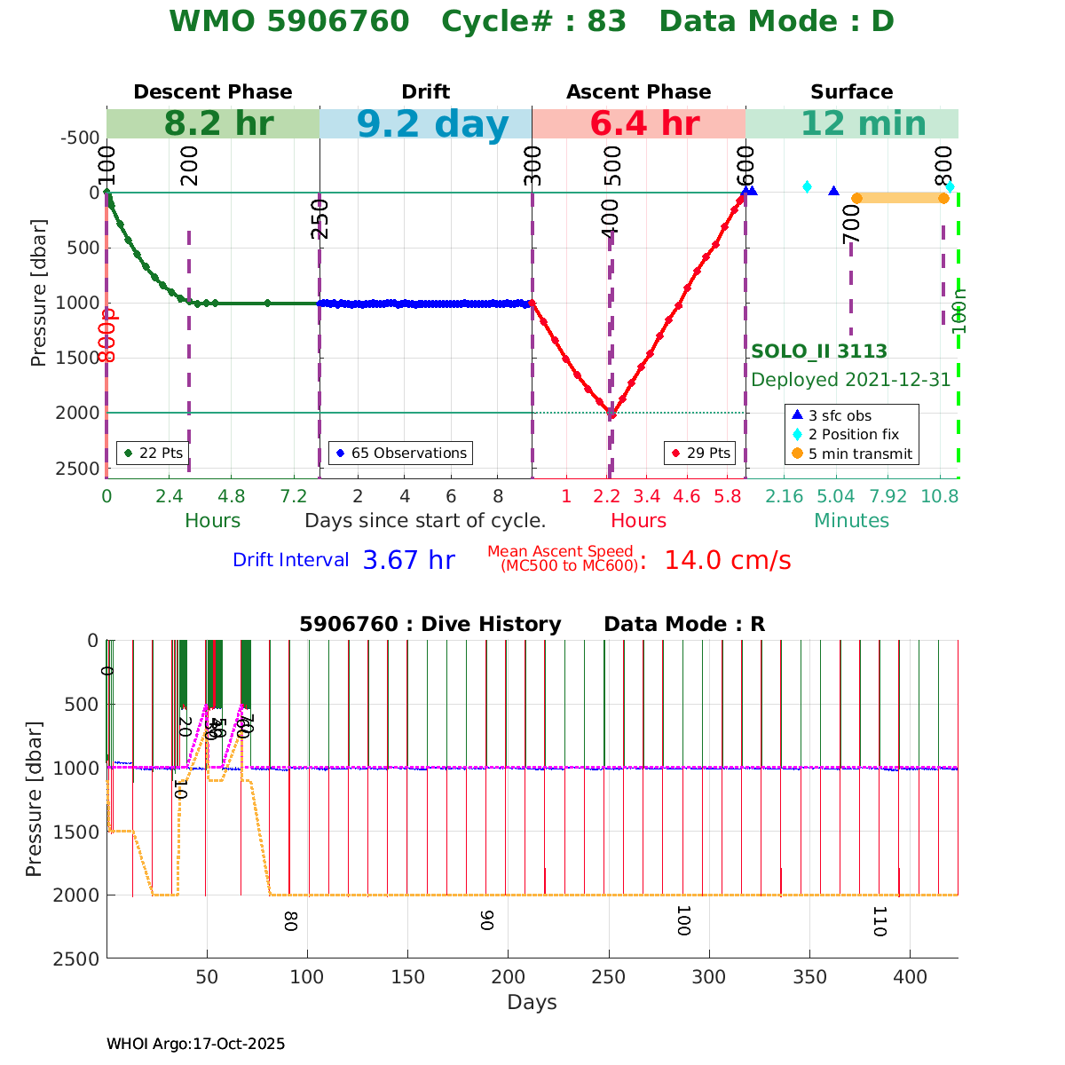 | WMO: #5906414 DAC: aoml PI: Dean ROEMMICH, Nathalie ZILBERMAN, Sarah PURKEY, John GILSON SOLO_D: #6075 KISTLER_10153PSIA: #5361150 SBE61: #5759 Altimeter Comparison (IFREMER) EuroArgo Link | ![]() |