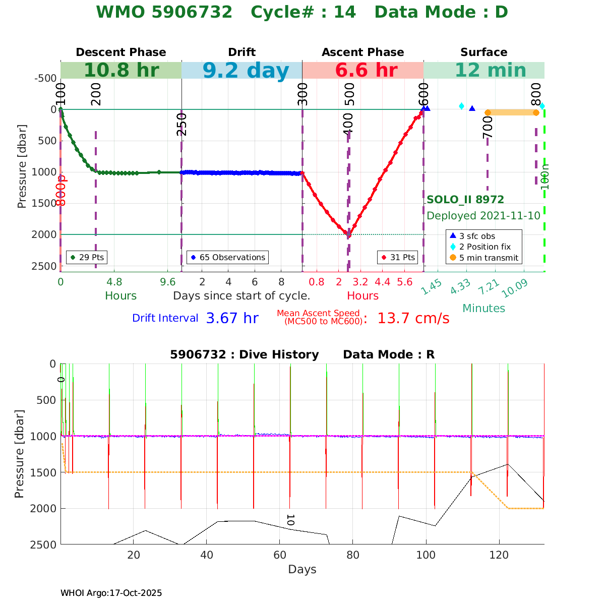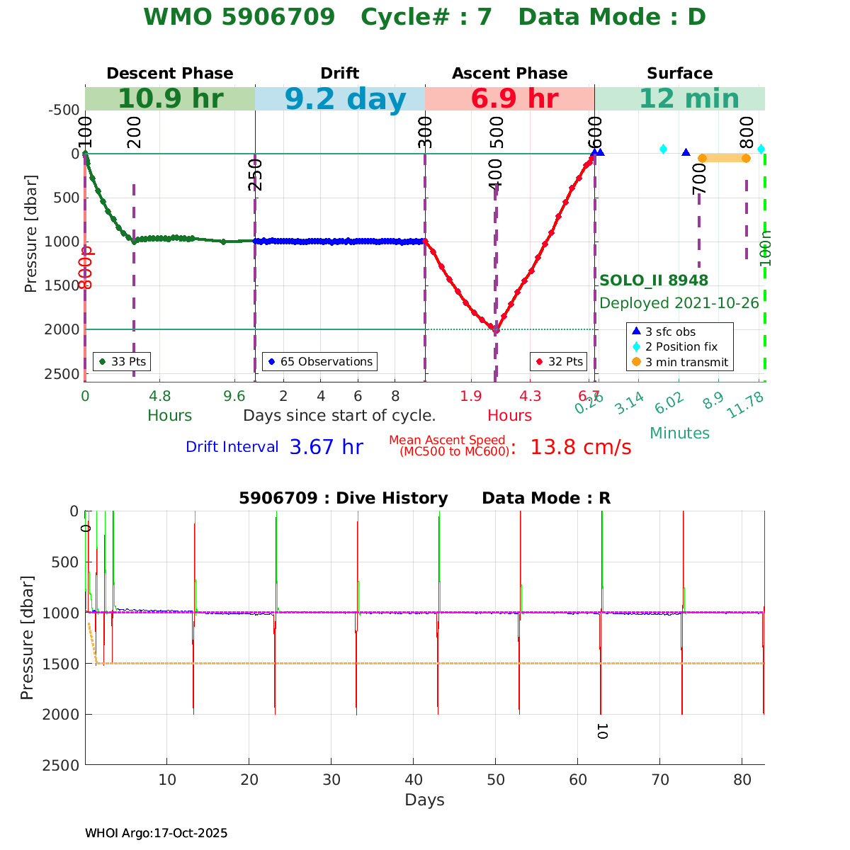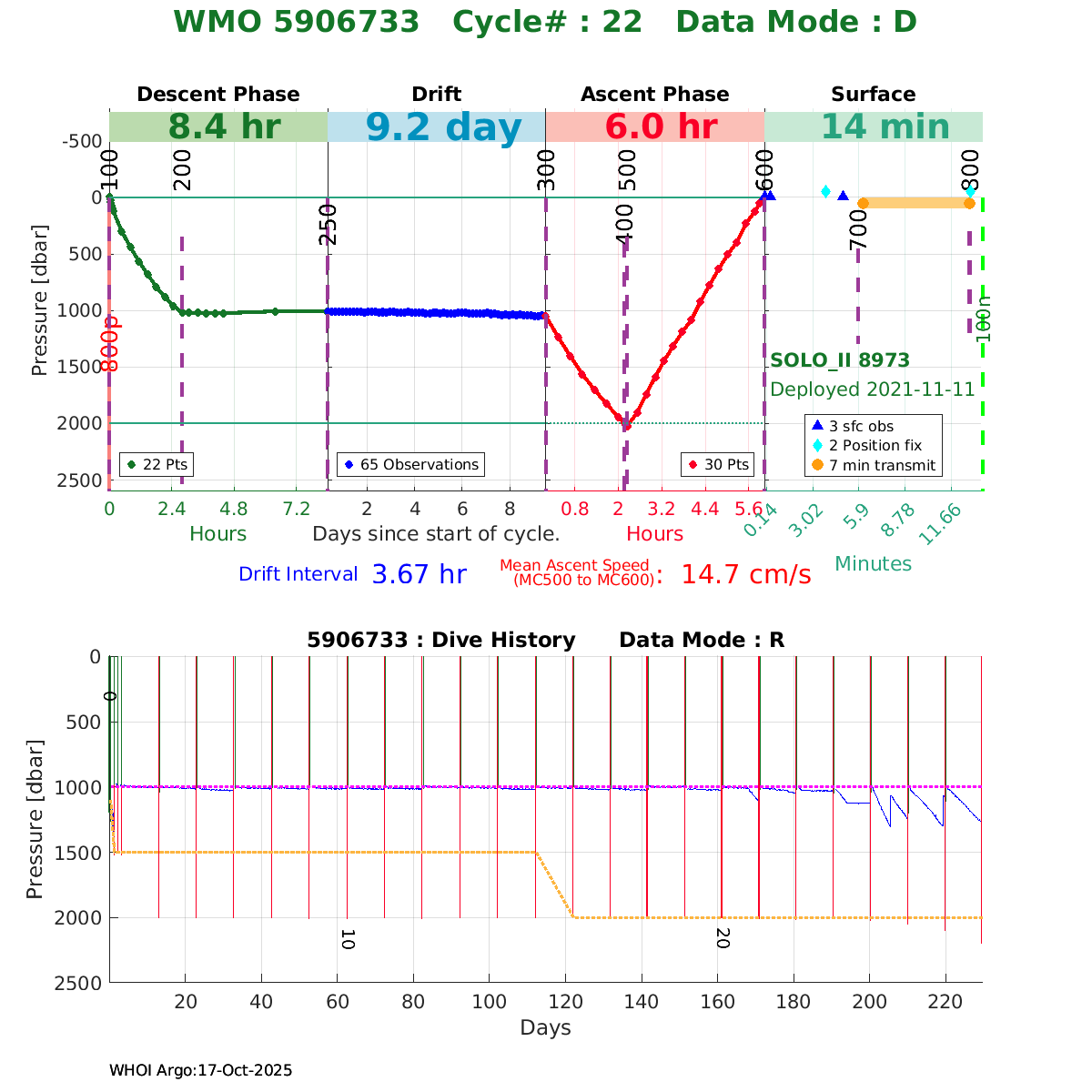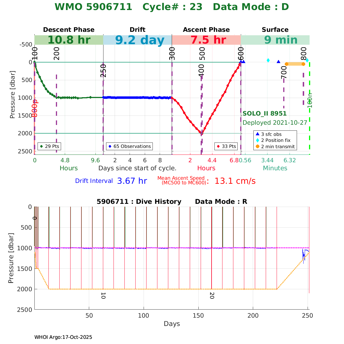 | WMO: #5906414 DAC: aoml PI: Dean ROEMMICH, Nathalie ZILBERMAN, Sarah PURKEY, John GILSON SOLO_D: #6075 KISTLER_10153PSIA: #5361150 SBE61: #5759 Altimeter Comparison (IFREMER) EuroArgo Link | ![]() |