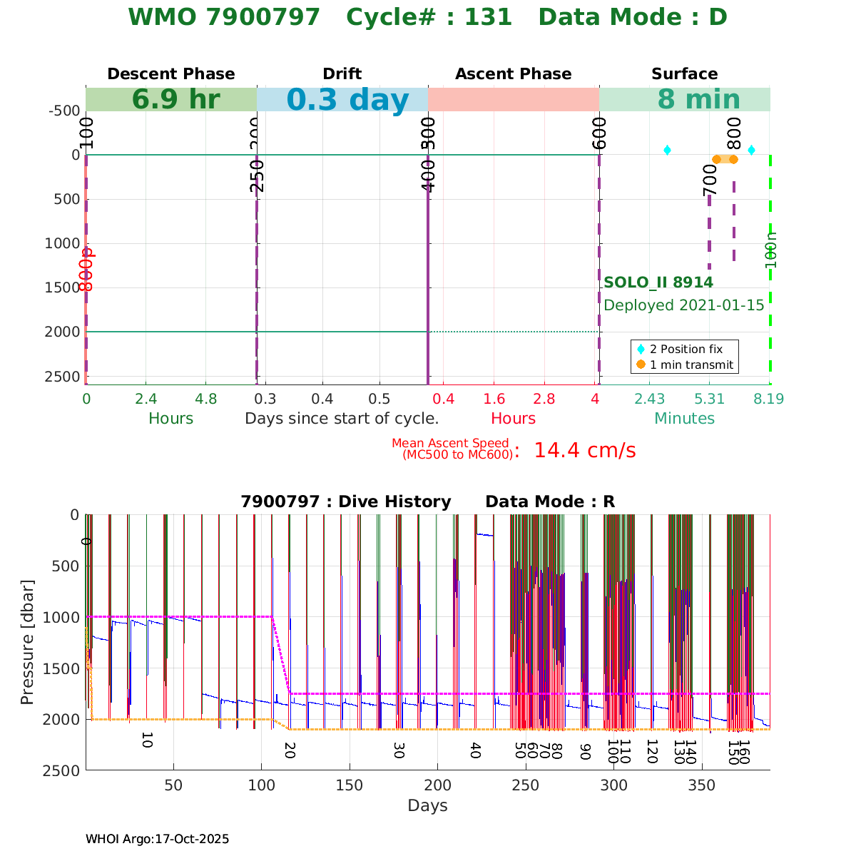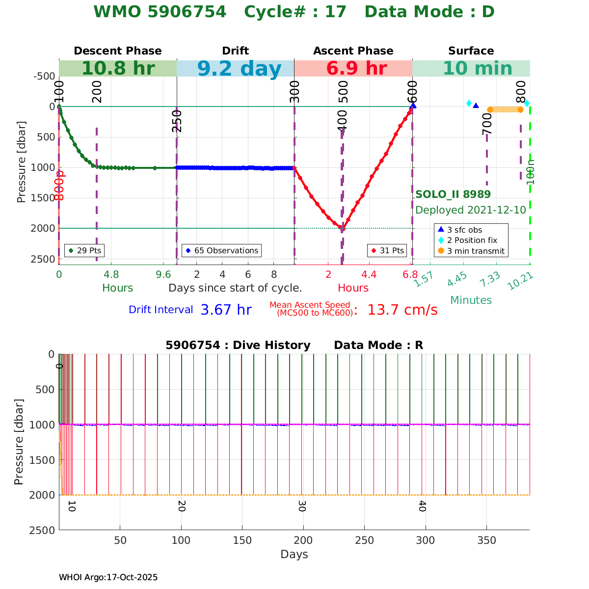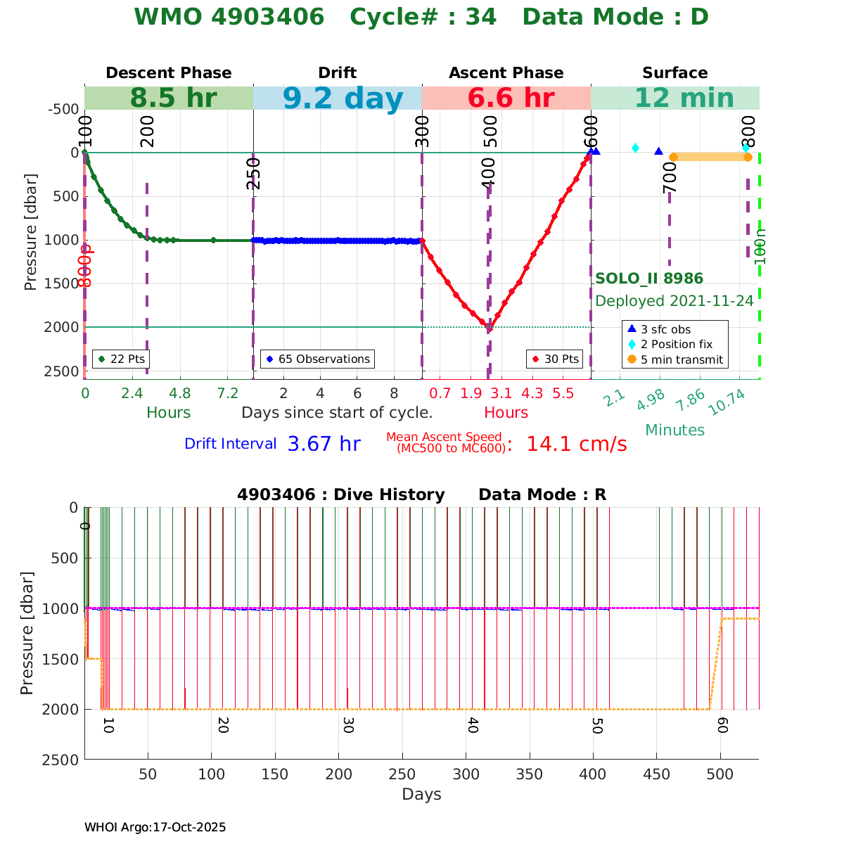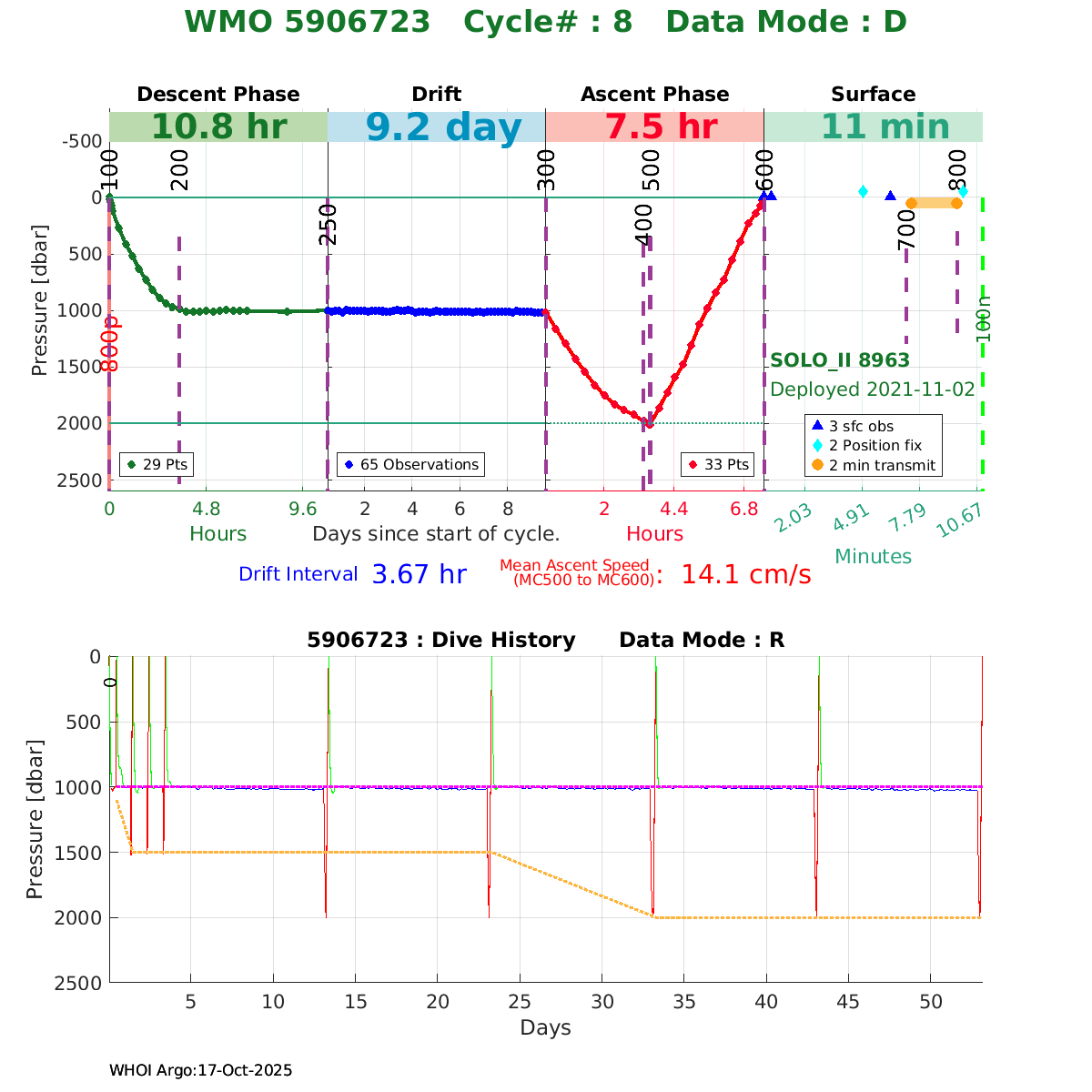 | WMO: #5906414 DAC: aoml PI: Dean ROEMMICH, Nathalie ZILBERMAN, Sarah PURKEY, John GILSON SOLO_D: #6075 KISTLER_10153PSIA: #5361150 SBE61: #5759 Altimeter Comparison (IFREMER) EuroArgo Link | ![]() |
