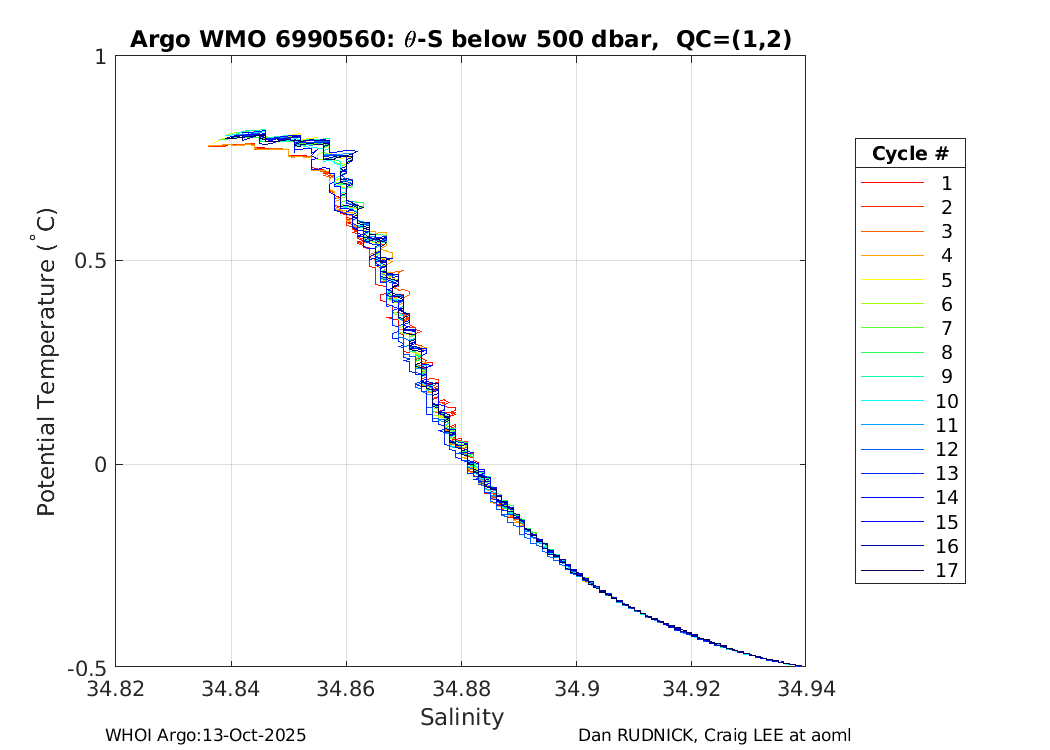 | WMO: #6990560 DAC: aoml PI: Dan RUDNICK, Craig LEE SOLO_II: #3407 DRUCK_2900PSIA: #13149495 SBE41CP: #21332 Altimeter Comparison (IFREMER) EuroArgo Link | ![]() |