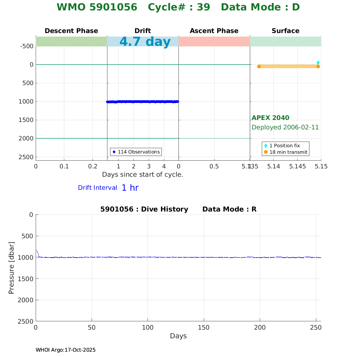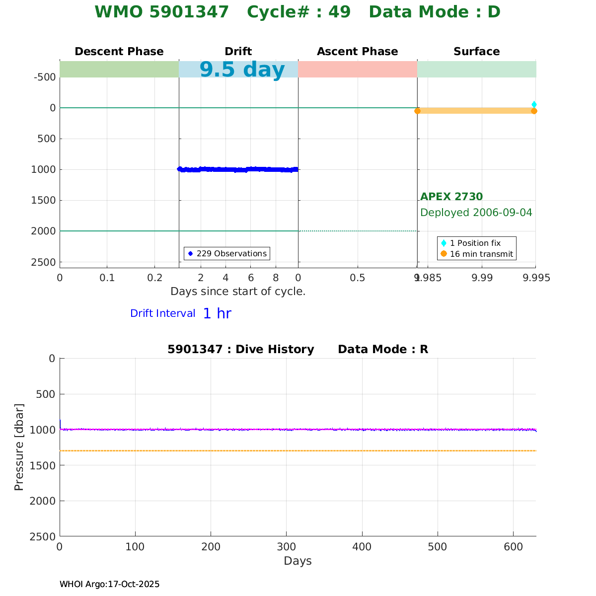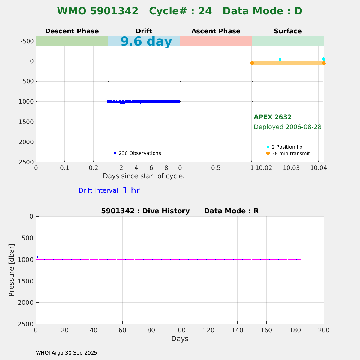 | WMO: #5901100 DAC: aoml PI: STEPHEN RISER APEX: #2586 SBE41: #2628 DRUCK_2900PSIA: #9237 Altimeter Comparison (IFREMER) EuroArgo Link | ![]() |