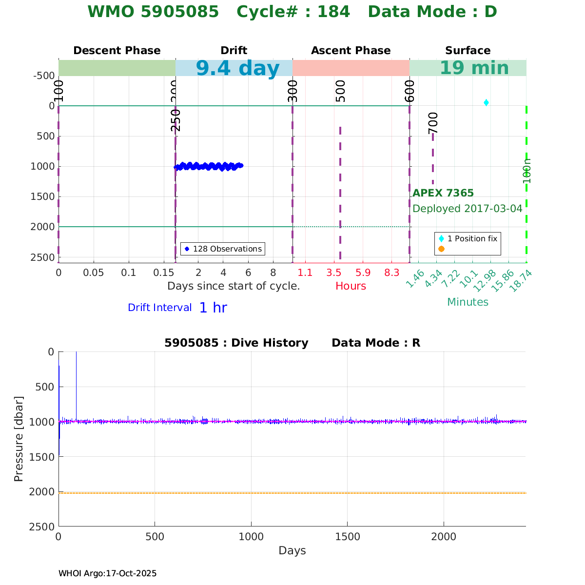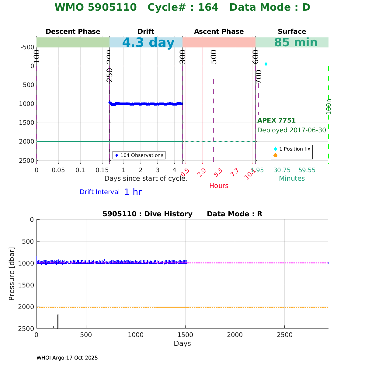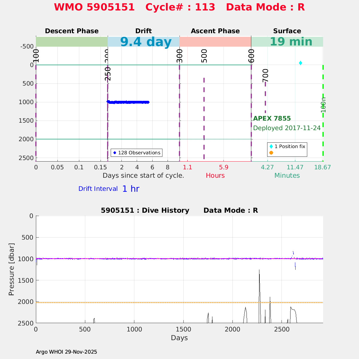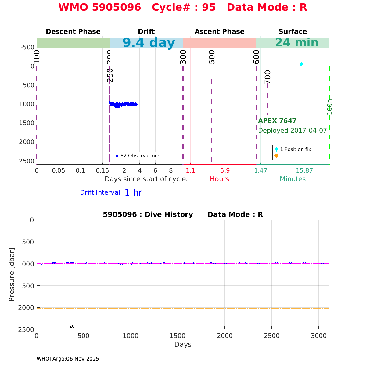 | WMO: #5905151 DAC: aoml PI: STEPHEN RISER APEX: #7855 SBE41CP: #8354 DRUCK_2900PSIA: #4924298 Altimeter Comparison (IFREMER) EuroArgo Link | ![]() |