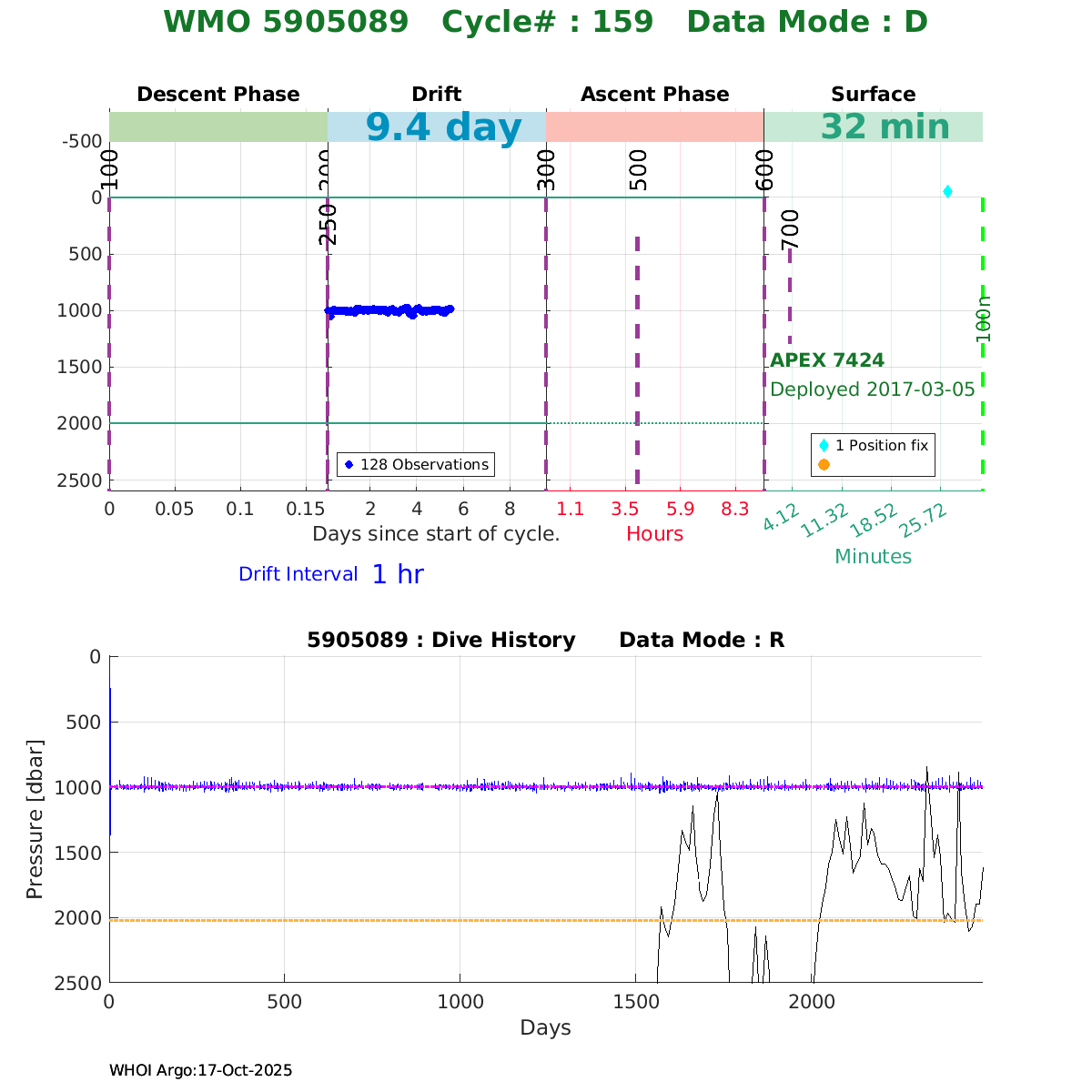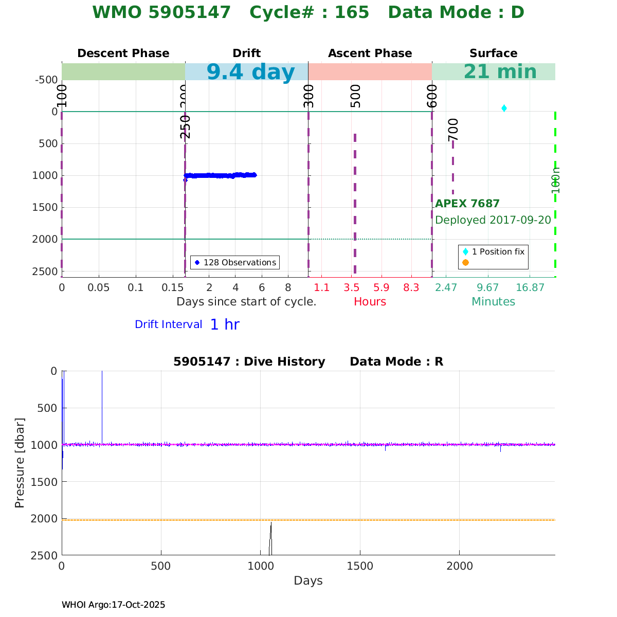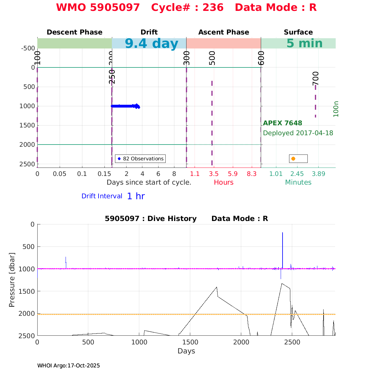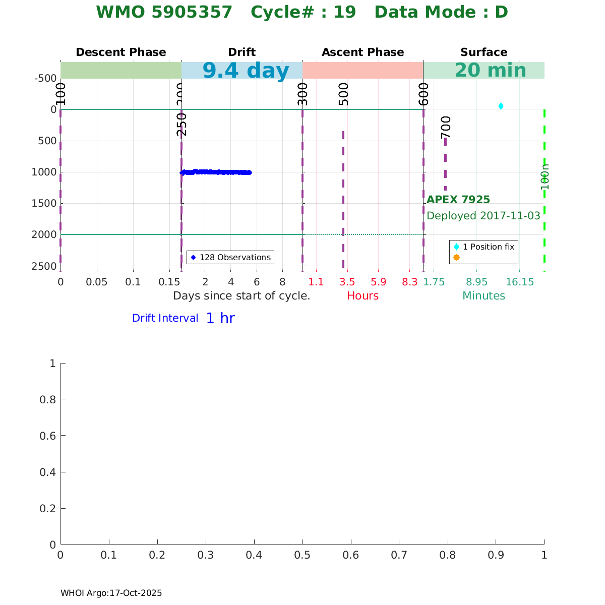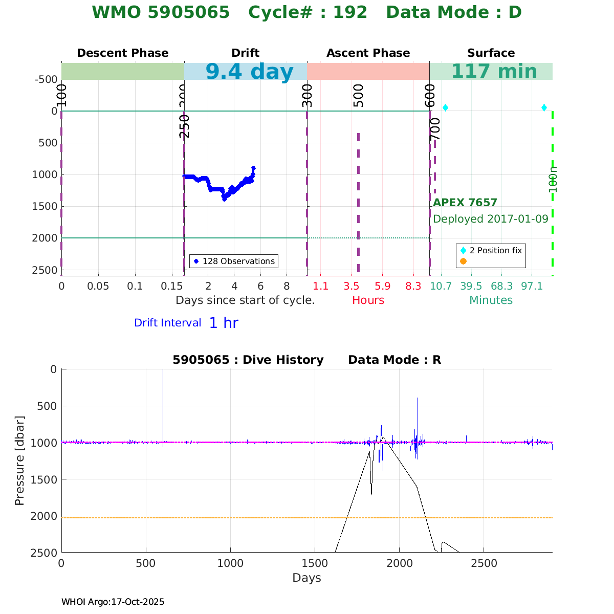 | WMO: #5905327 DAC: aoml PI: STEPHEN RISER APEX: #7891 SBE41CP: #8785 DRUCK_2900PSIA: #10300739 Altimeter Comparison (IFREMER) EuroArgo Link | ![]() |