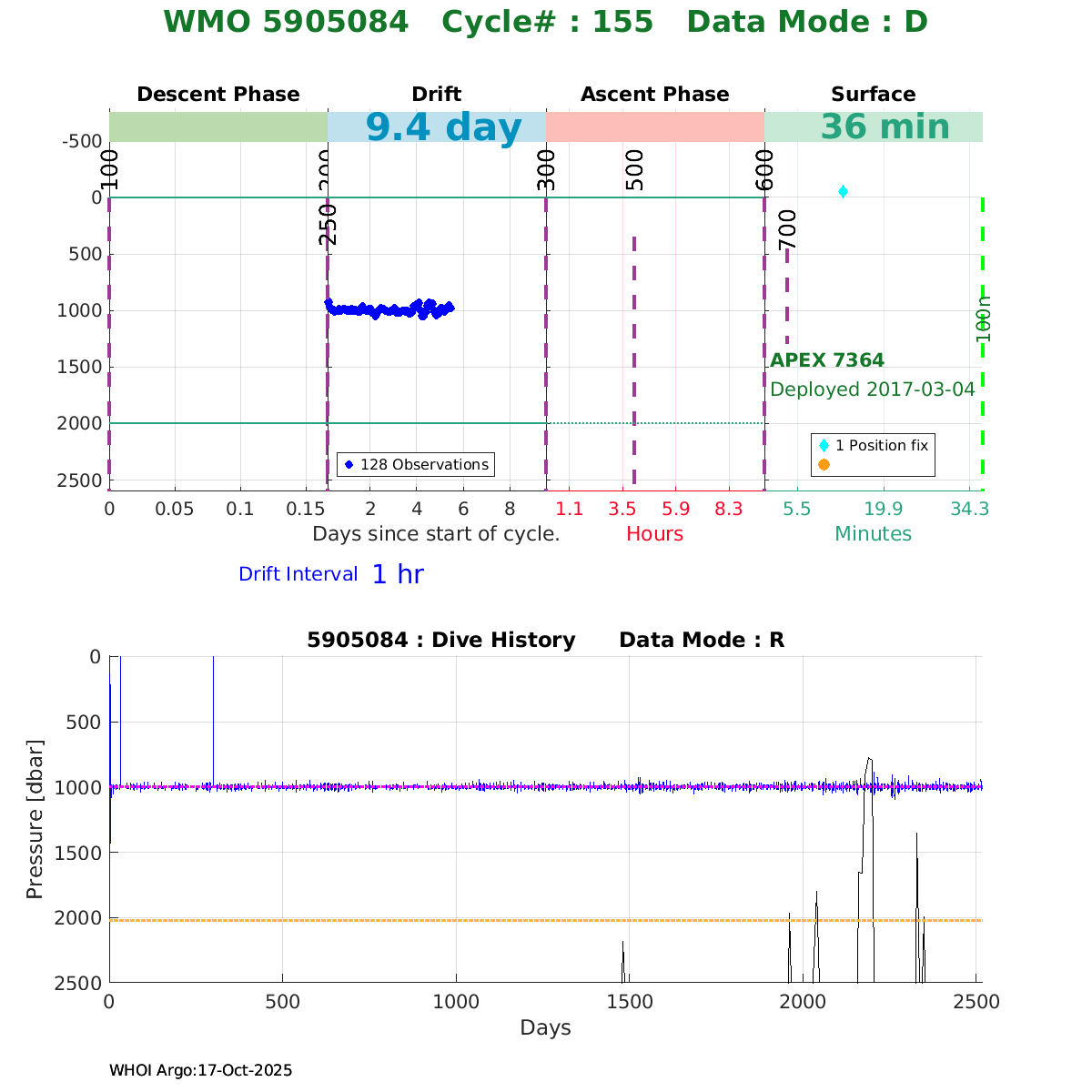 | WMO: #5905084 DAC: aoml PI: STEPHEN RISER APEX: #7364 SBE41CP: #6415 DRUCK_2900PSIA: #4149505 Altimeter Comparison (IFREMER) EuroArgo Link | ![]() |