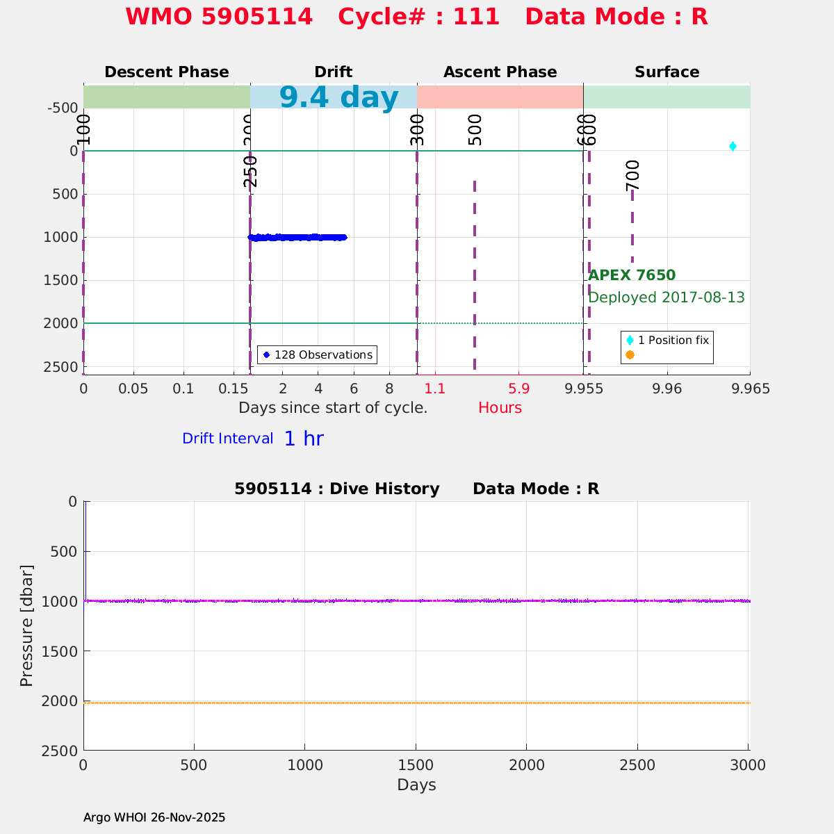 | WMO: #5905114 DAC: aoml PI: STEPHEN RISER APEX: #7650 SBE41CP: #7809 DRUCK_2900PSIA: #10105991 Altimeter Comparison (IFREMER) EuroArgo Link | ![]() |