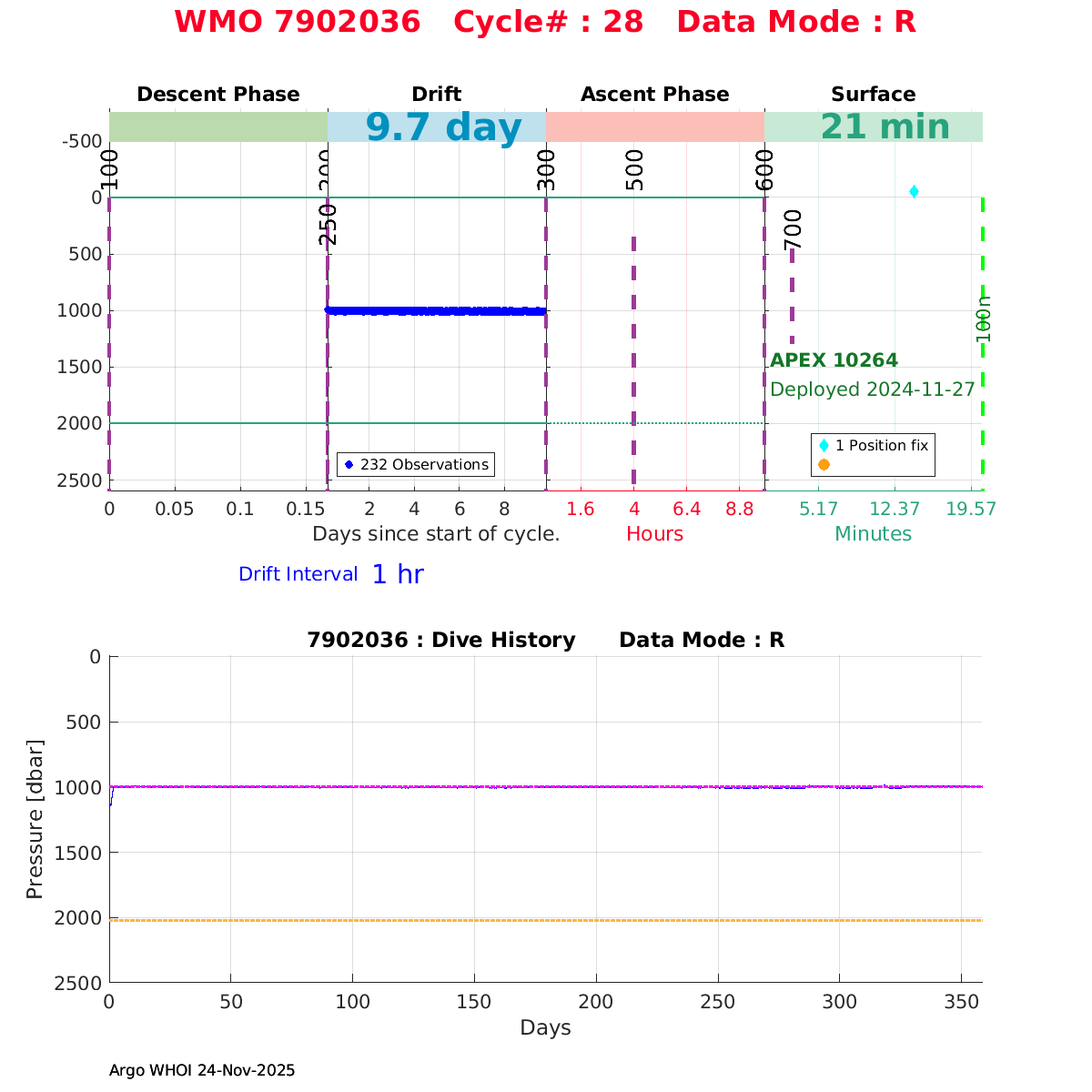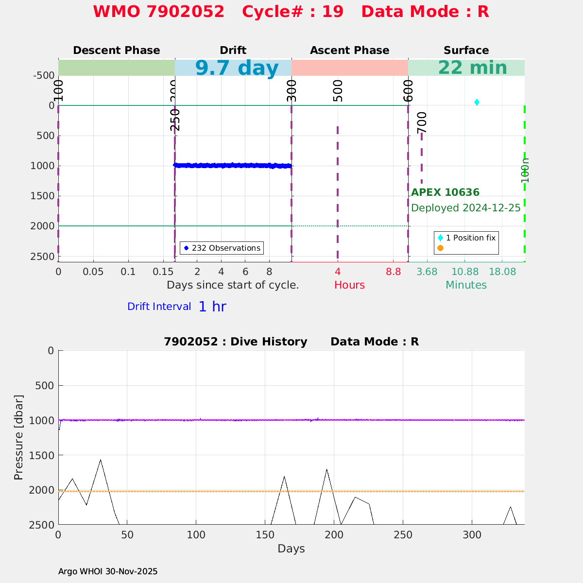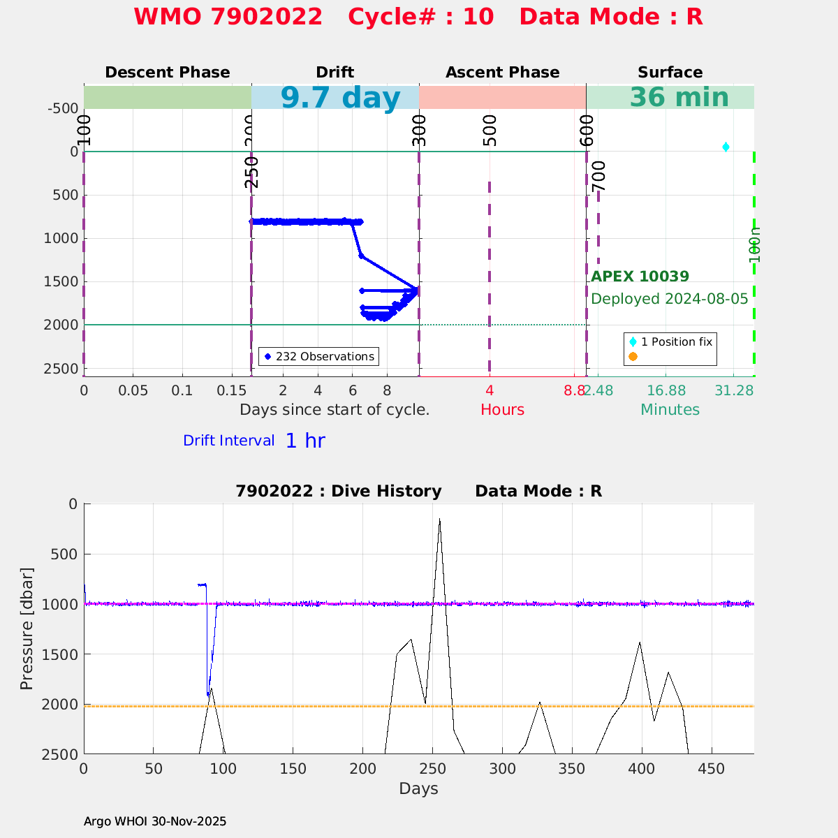 | WMO: #7902046 DAC: aoml PI: STEPHEN RISER APEX: #10265 SBE41CP: #18364 DRUCK_2900PSIA: #12263232 Altimeter Comparison (IFREMER) EuroArgo Link | ![]() |