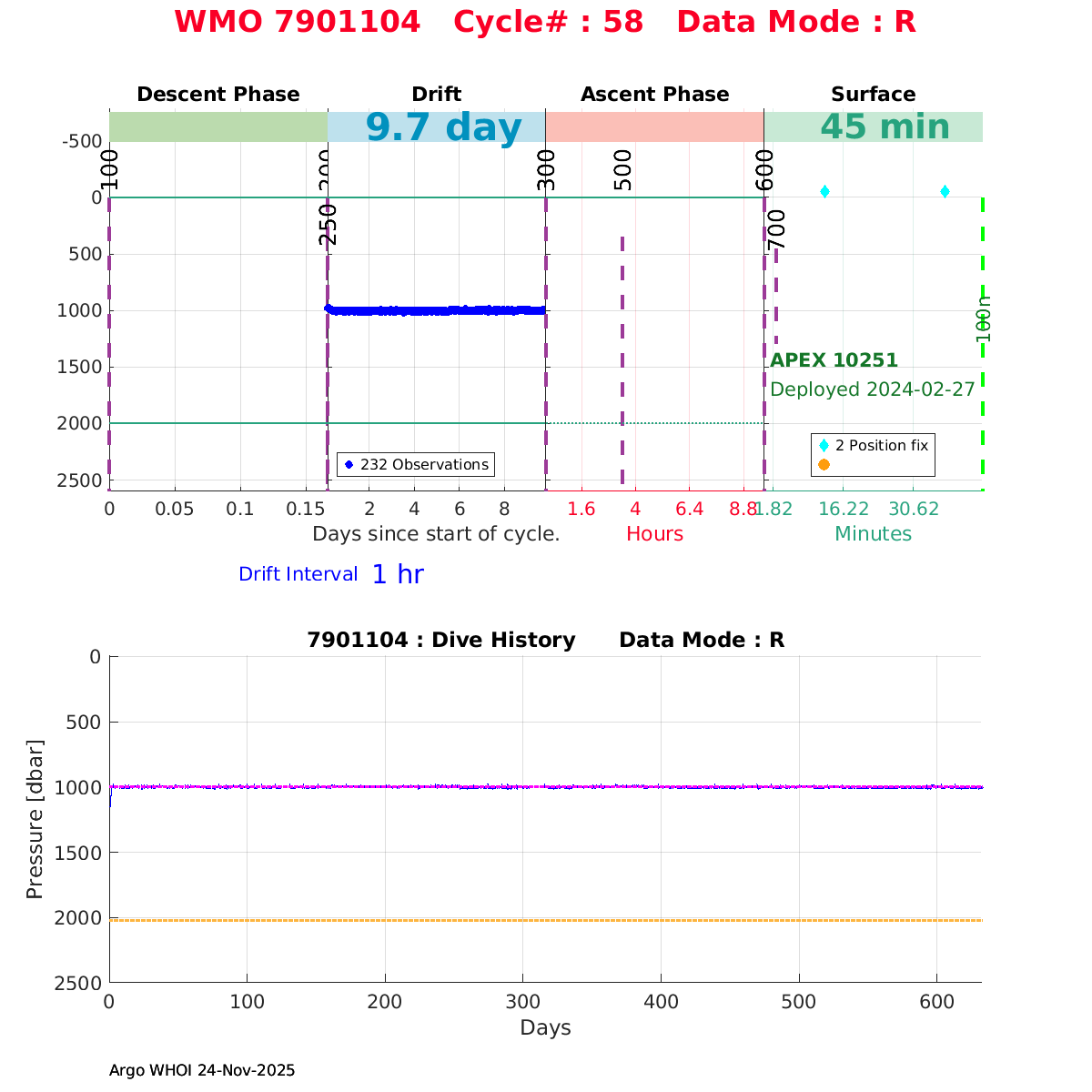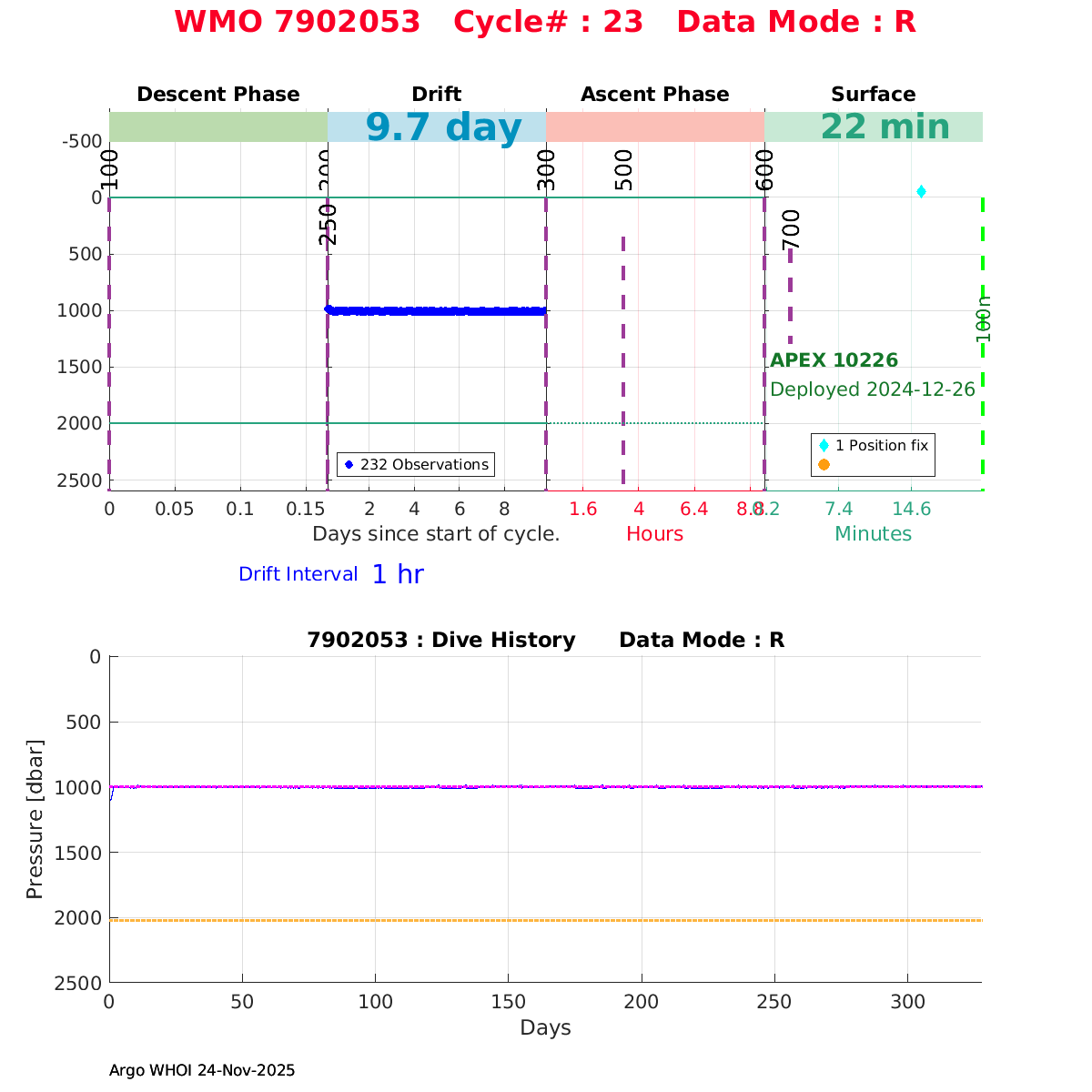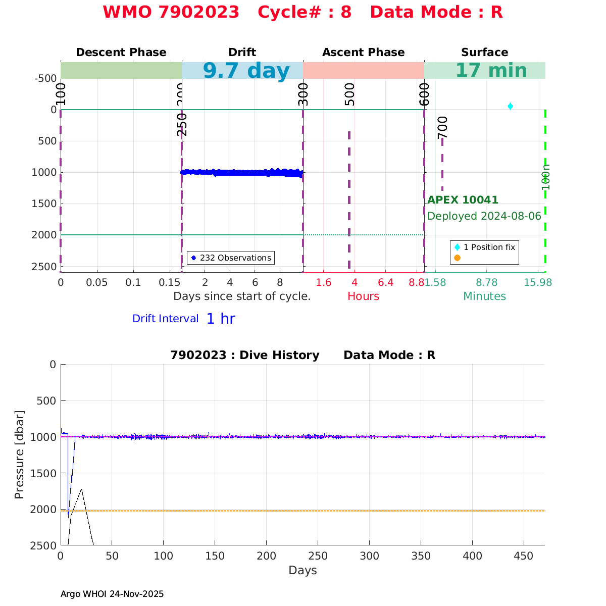 | WMO: #7901108 DAC: aoml PI: STEPHEN RISER/KEN JOHNSON APEX: #9783 SBE41CP: #17213 DRUCK_2900PSIA: #11963102 AANDERAA_OPTODE_4330: #3785 ISUS: #1025 DURA: #1025 ECO_FLBB_AP2: #7333 OCR504_ICSW: #2322 Altimeter Comparison (IFREMER) EuroArgo Link | ![]() |