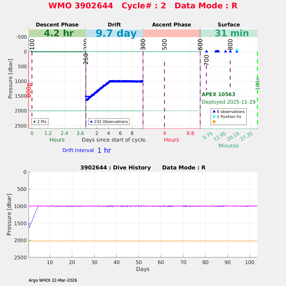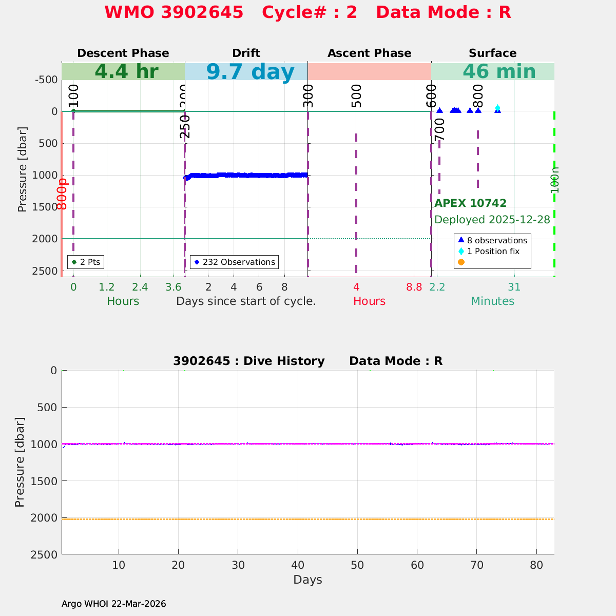 | WMO: #3902644 DAC: aoml PI: STEPHEN RISER/KEN JOHNSON APEX: #10563 SBE41CP: #20281 DRUCK_2900PSIA: #12440285 AANDERAA_OPTODE_4330: #4373 ISUS: #1152 DURA: #1152 ECO_FLBB_AP2: #9055 Altimeter Comparison (IFREMER) EuroArgo Link | n/a | n/a | ![]() |
