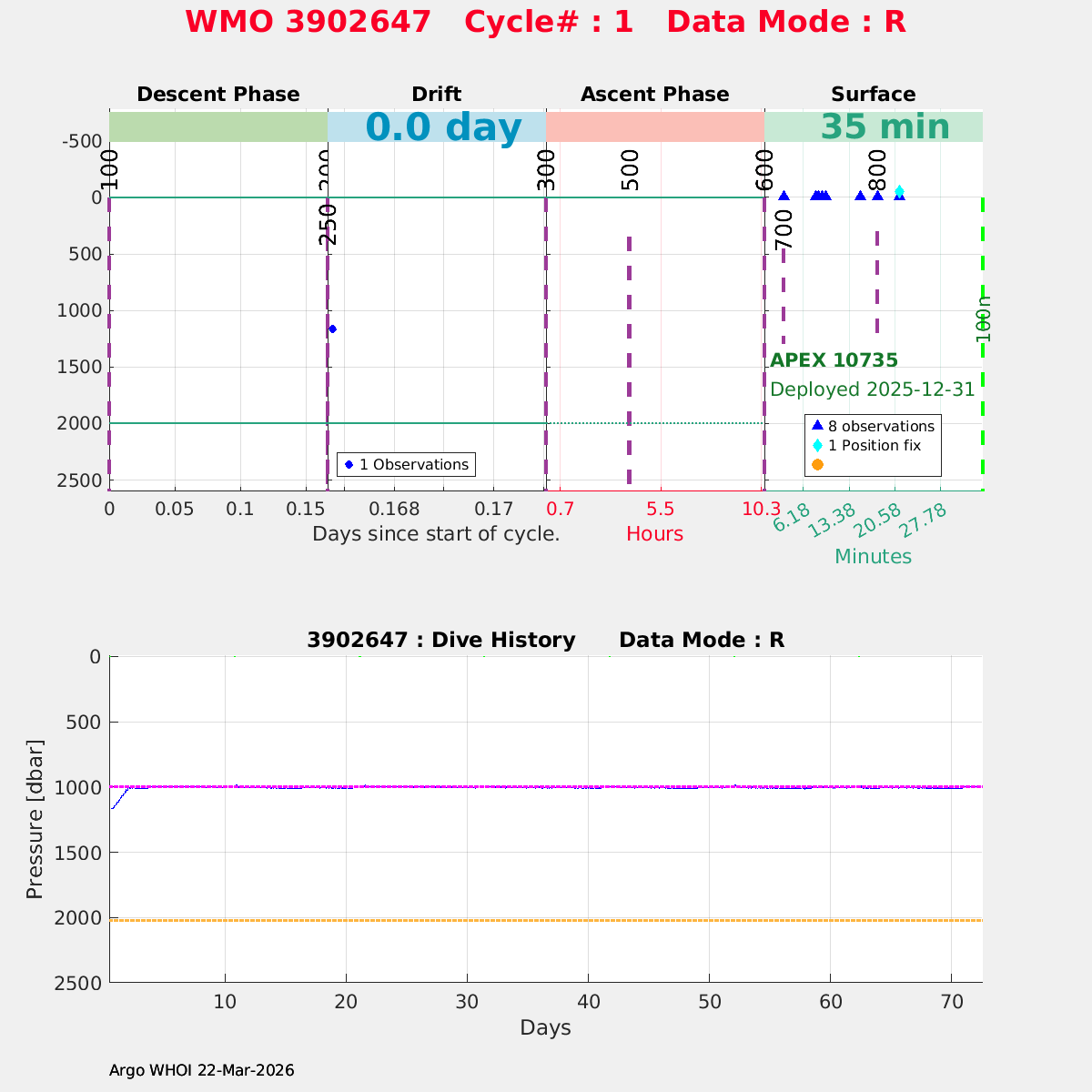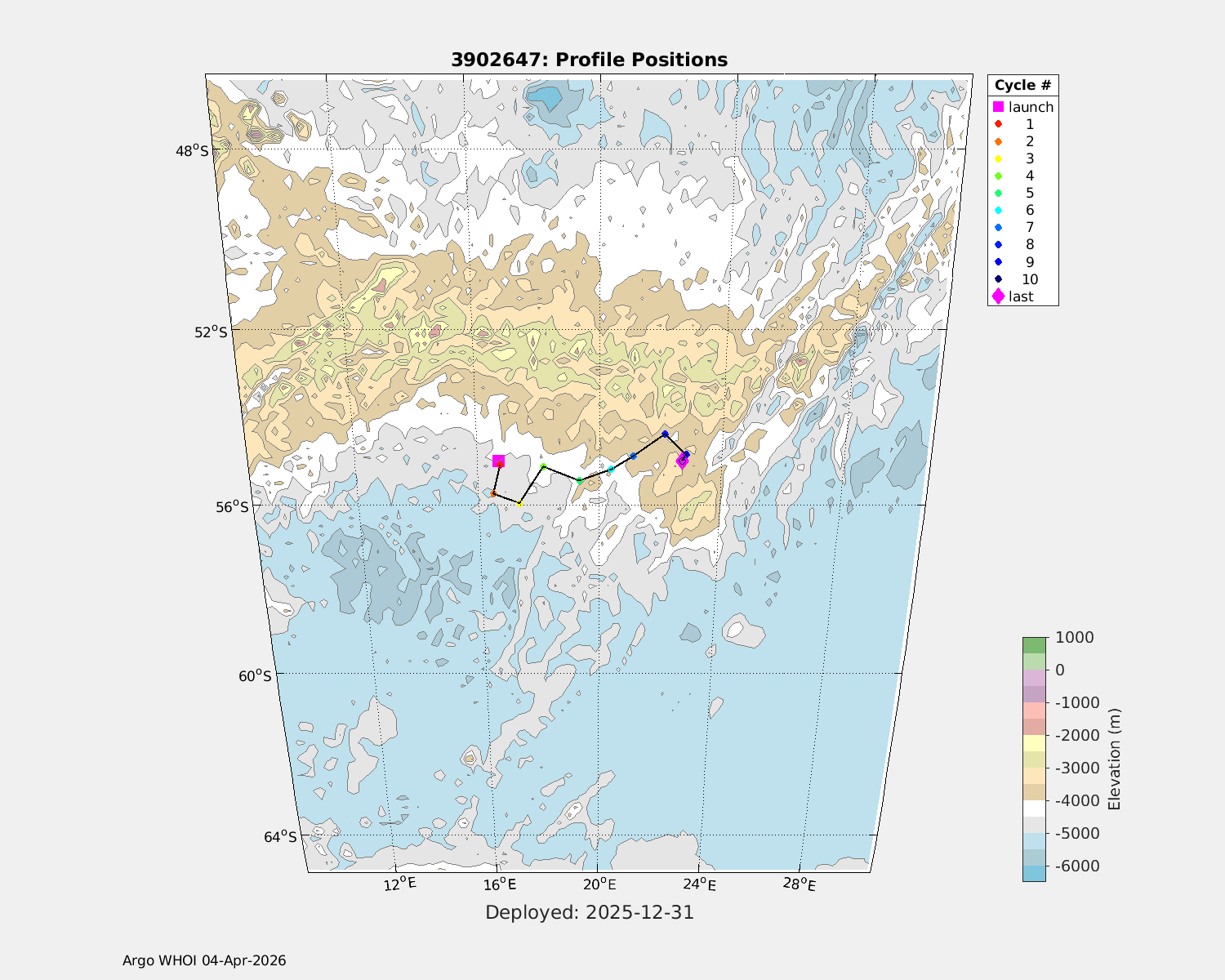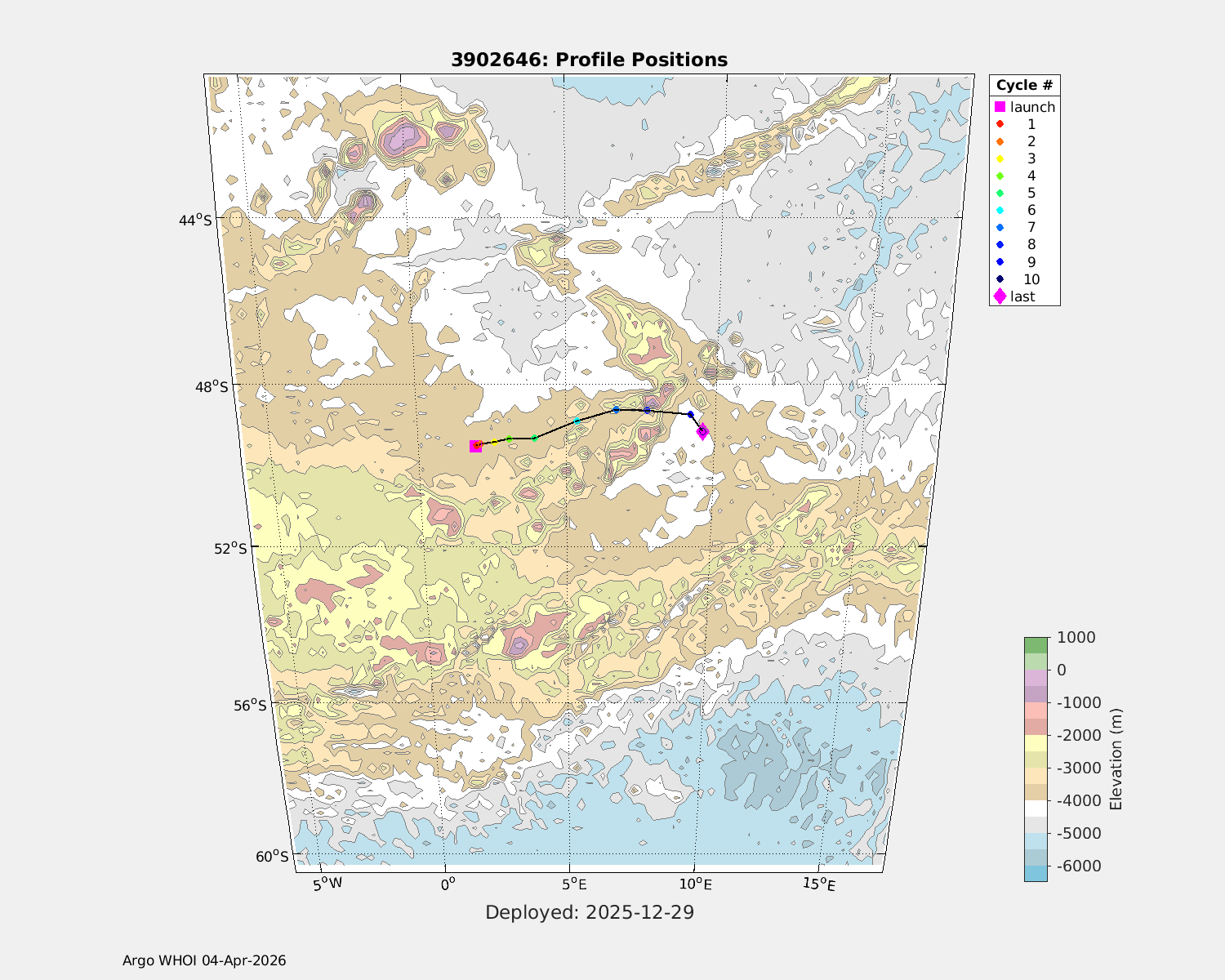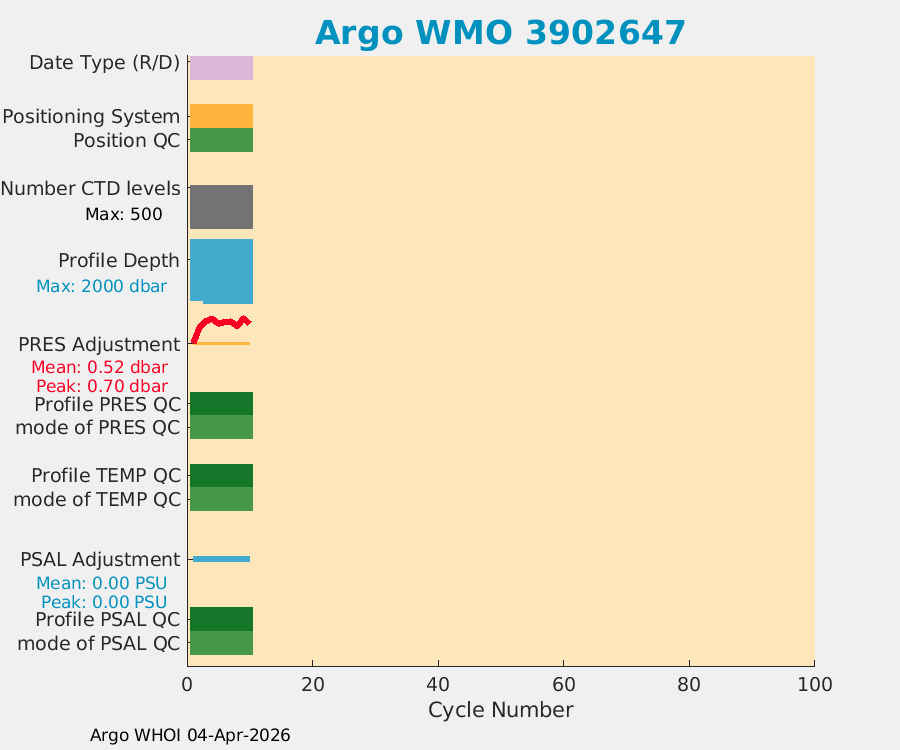 | WMO: #3902647 DAC: aoml PI: STEPHEN RISER/KEN JOHNSON APEX: #10735 SBE41CP: #20369 DRUCK_2900PSIA: #12653316 AANDERAA_OPTODE_4330: #4418 ISUS: #1176 DURA: #1176 ECO_FLBB_AP2: #9052 OCR504_ICSW: #2520 Altimeter Comparison (IFREMER) EuroArgo Link | n/a | n/a | ![]() |