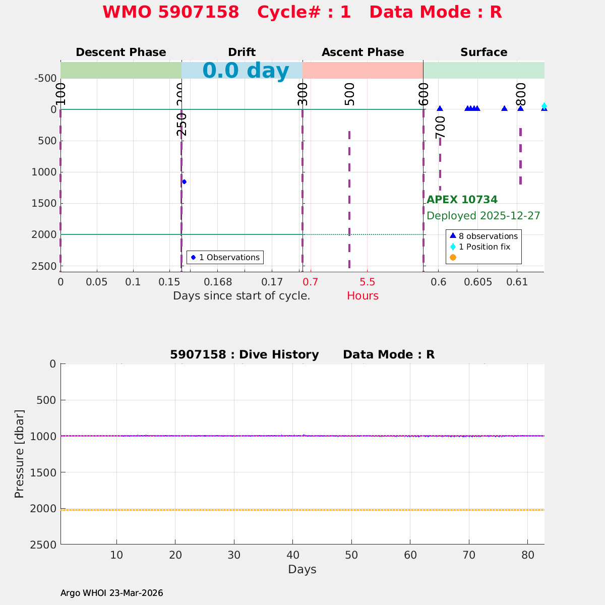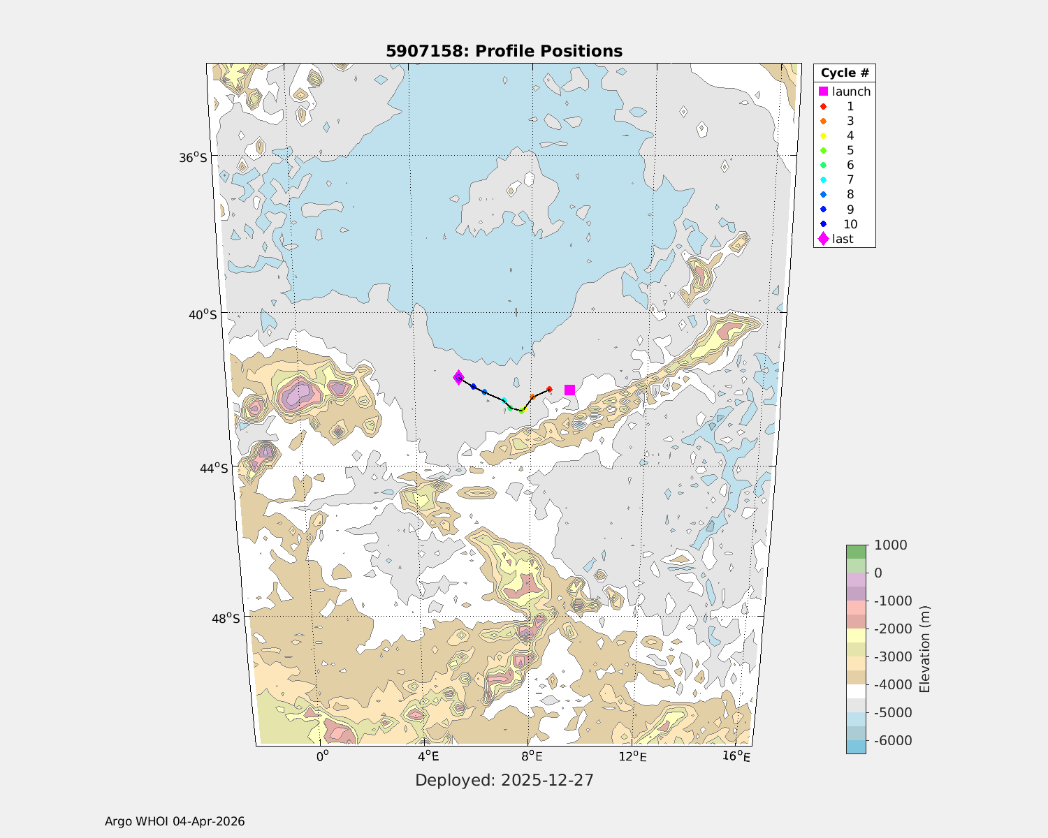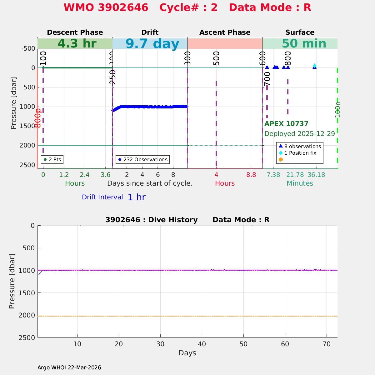 | WMO: #5907158 DAC: aoml PI: STEPHEN RISER/KEN JOHNSON APEX: #10734 SBE41CP: #20368 DRUCK_2900PSIA: #12653314 SBE83_OPTODE: #0124 ISUS: #1175 DURA: #1175 ECO_FLBBFL_AP2: #9248 OCR504_ICSW: #2528 Altimeter Comparison (IFREMER) EuroArgo Link | n/a | n/a | ![]() |