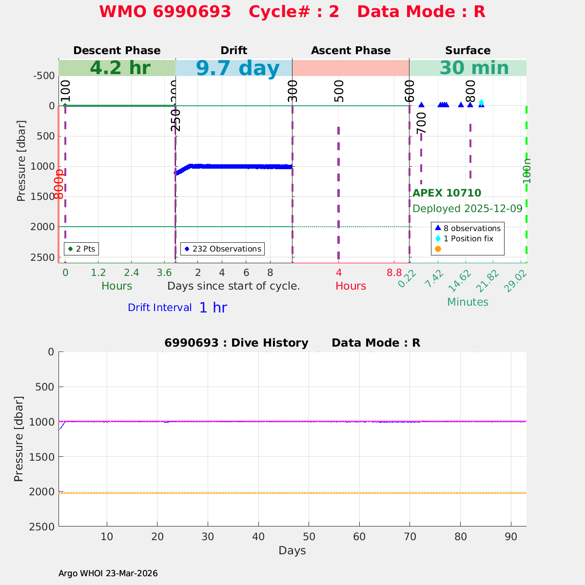 | WMO: #6990693 DAC: aoml PI: STEPHEN RISER/KEN JOHNSON APEX: #10710 SBE41CP: #20329 DRUCK_2900PSIA: #12600468 AANDERAA_OPTODE_4330: #4361 ISUS: #1155 DURA: #1155 ECO_FLBBFL_AP2: #8977 Altimeter Comparison (IFREMER) EuroArgo Link | n/a | n/a | ![]() |