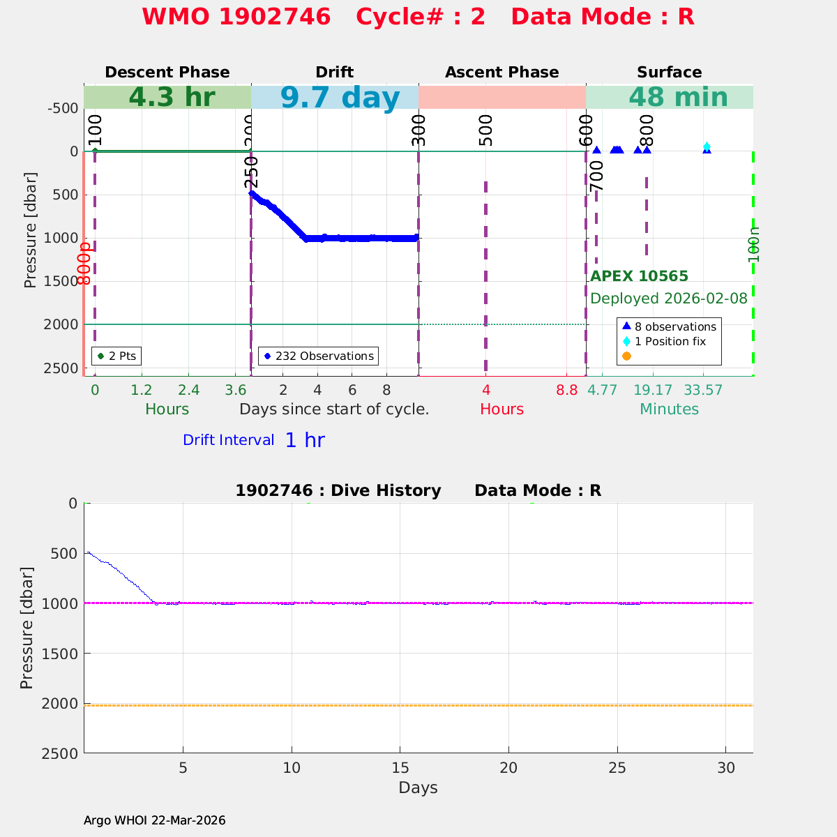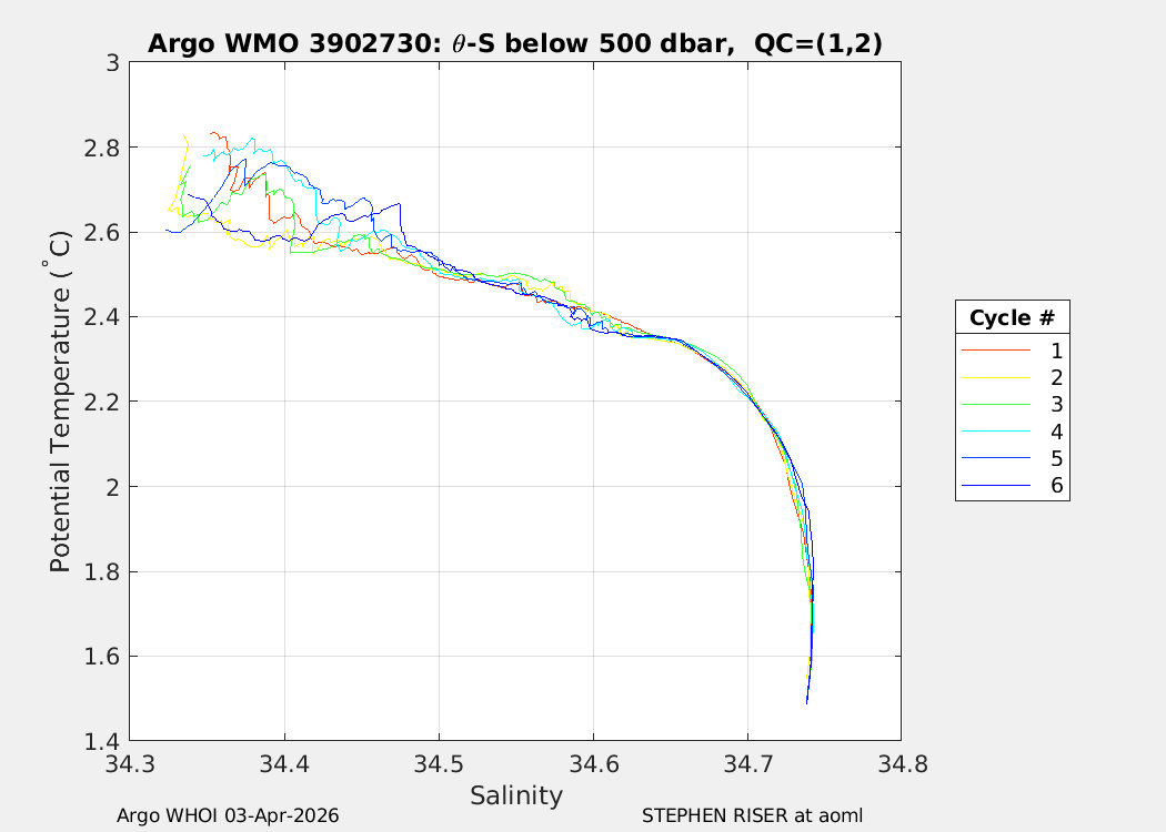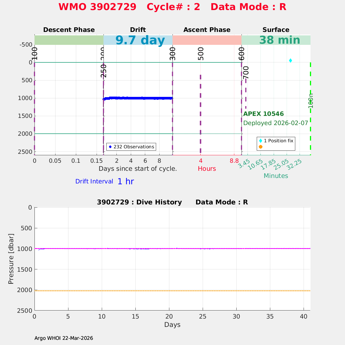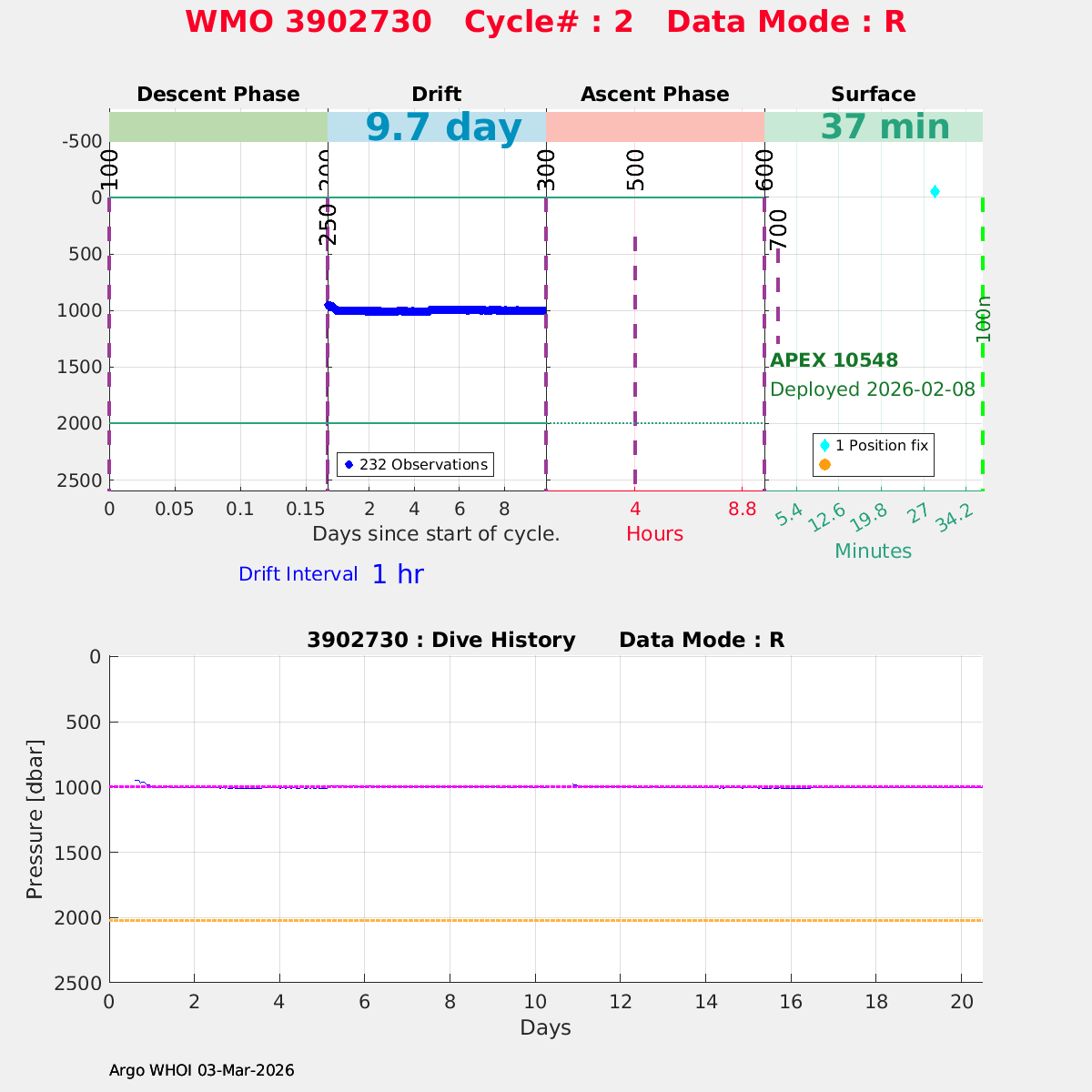 | WMO: #3902730 DAC: aoml PI: STEPHEN RISER APEX: #10548 SBE41CP: #13257 DRUCK_2900PSIA: #11674027 Altimeter Comparison (IFREMER) EuroArgo Link | n/a | n/a | ![]() |