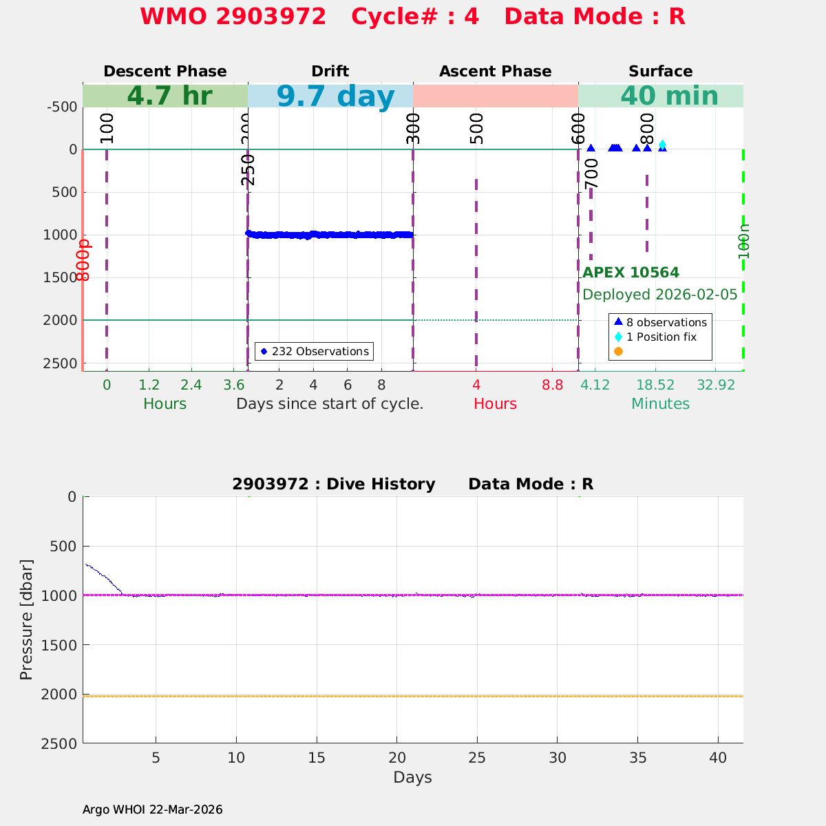 | WMO: #2903972 DAC: aoml PI: STEPHEN RISER/KEN JOHNSON APEX: #10564 SBE41CP: #20282 DRUCK_2900PSIA: #12440289 AANDERAA_OPTODE_4330: #4371 ISUS: #1143 DURA: #1143 ECO_FLBB_AP2: #9054 Altimeter Comparison (IFREMER) EuroArgo Link | n/a | n/a | ![]() |