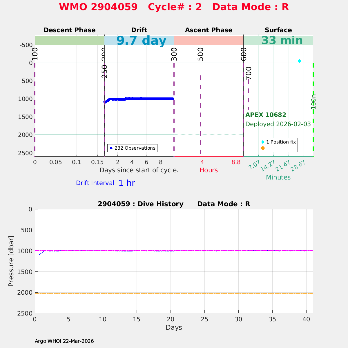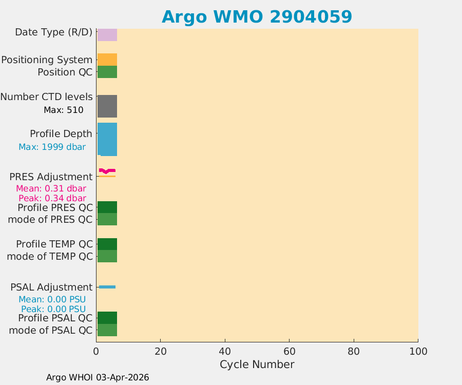 | WMO: #2904059 DAC: aoml PI: STEPHEN RISER APEX: #10682 SBE41CP: #20222 DRUCK_2900PSIA: #12441662 Altimeter Comparison (IFREMER) EuroArgo Link | n/a | n/a | ![]() |