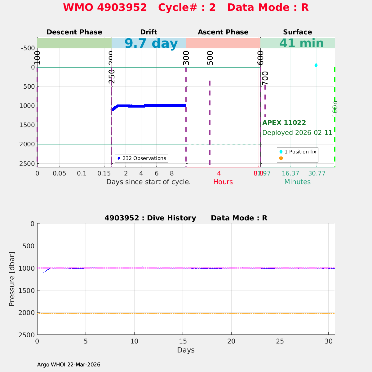 | WMO: #4903952 DAC: aoml PI: STEPHEN RISER APEX: #11022 SBE41CP: #20809 DRUCK_2900PSIA: #12439090 Altimeter Comparison (IFREMER) EuroArgo Link | n/a | n/a | ![]() |