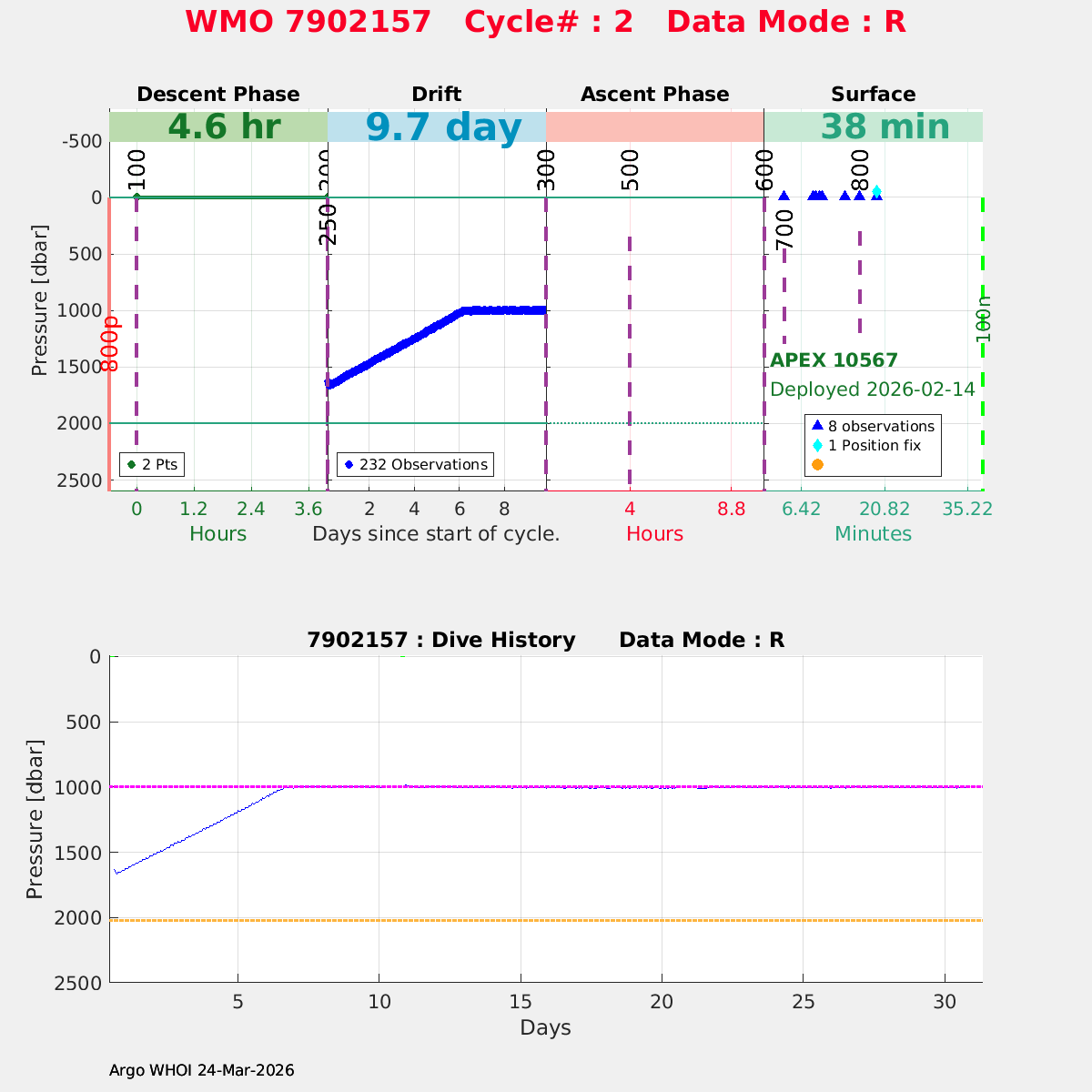 | WMO: #7902157 DAC: aoml PI: STEPHEN RISER/KEN JOHNSON APEX: #10567 SBE41CP: #20324 DRUCK_2900PSIA: #12656316 AANDERAA_OPTODE_4330: #4401 ISUS: #1153 DURA: #1153 ECO_FLBB_AP2: #8263 Altimeter Comparison (IFREMER) EuroArgo Link | n/a | n/a | ![]() |