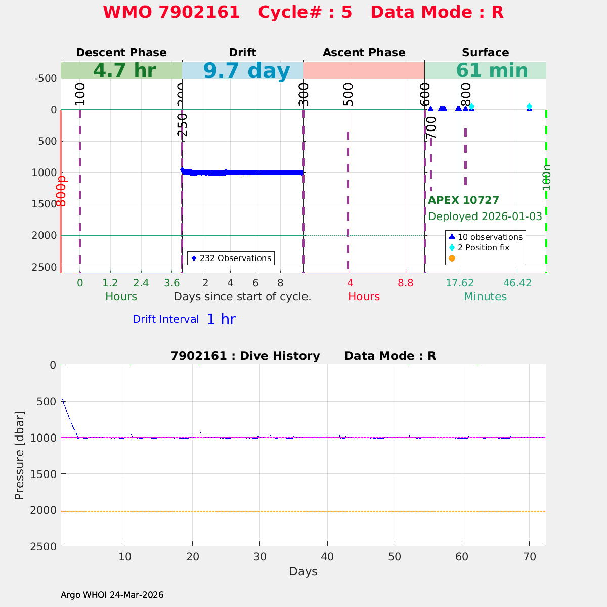 | WMO: #7902161 DAC: aoml PI: STEPHEN RISER/KEN JOHNSON APEX: #10727 SBE41CP: #20220 DRUCK_2900PSIA: #12441655 AANDERAA_OPTODE_4330: #4420 ISUS: #1137 DURA: #1137 ECO_FLBB_AP2: #8351 OCR504_ICSW: #2540 Altimeter Comparison (IFREMER) EuroArgo Link | n/a | n/a | ![]() |