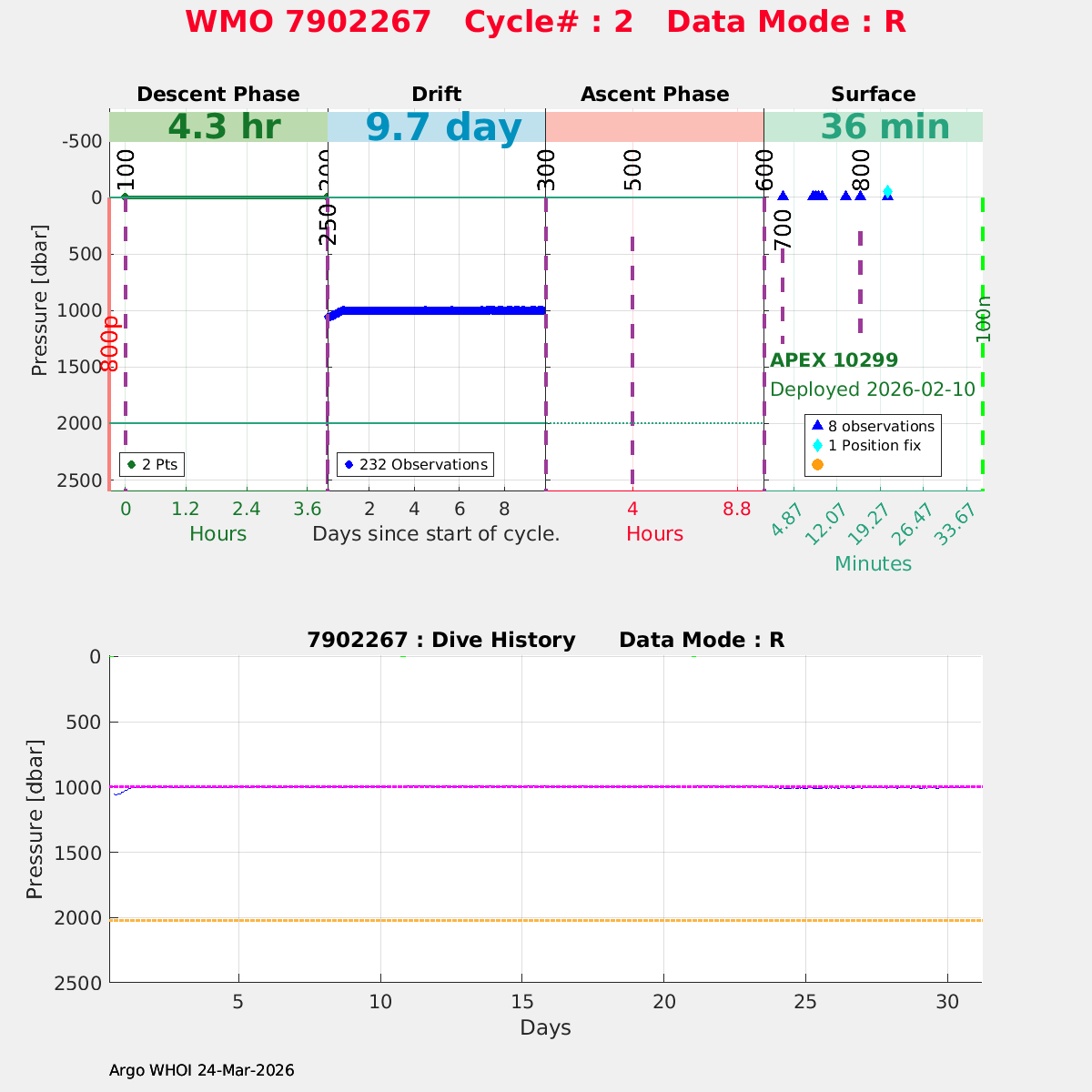 | WMO: #7902268 DAC: aoml PI: STEPHEN RISER/KEN JOHNSON APEX: #10738 SBE41CP: #20372 DRUCK_2900PSIA: #12512824 SBE83_OPTODE: #0109 ISUS: #1160 DURA: #1160 ECO_FLBBFL_AP2: #8978 OCR504_ICSW: #2522 Altimeter Comparison (IFREMER) EuroArgo Link | n/a | n/a | ![]() |