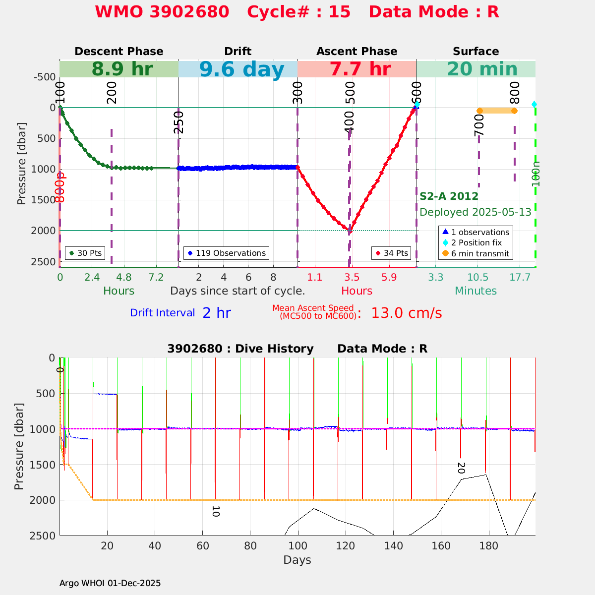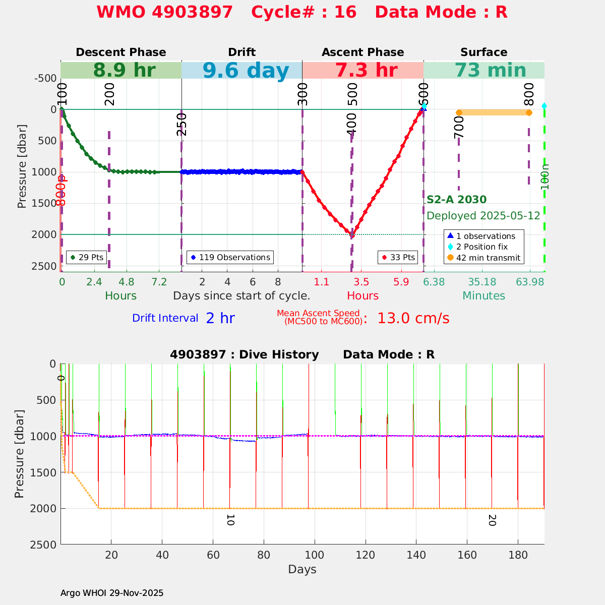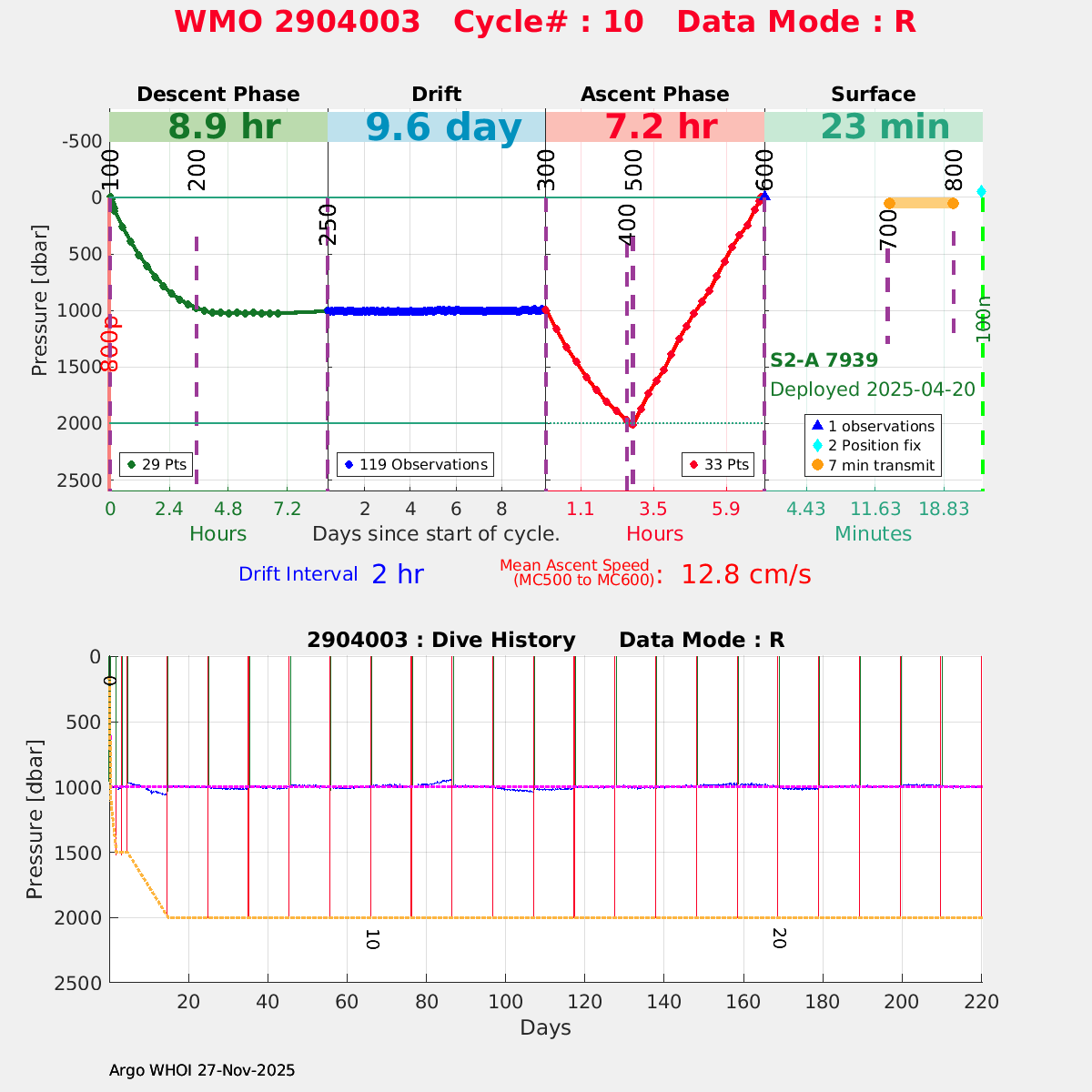 | WMO: #4903913 DAC: aoml PI: SUSAN WIJFFELS, DAVID NICHOLSON NAVIS_EBR: #1680 MCOMS_FLBBCD: #527 SBE41CP: #20638 DRUCK_2900PSIA: #12319387 MCOMS_FLBBCD: #527 SBE41CP: #20638 SBE83_OPTODE: #0176 SEAFET: #20376 MCOMS_FLBBCD: #527 Altimeter Comparison (IFREMER) EuroArgo Link | n/a | n/a | ![]() |